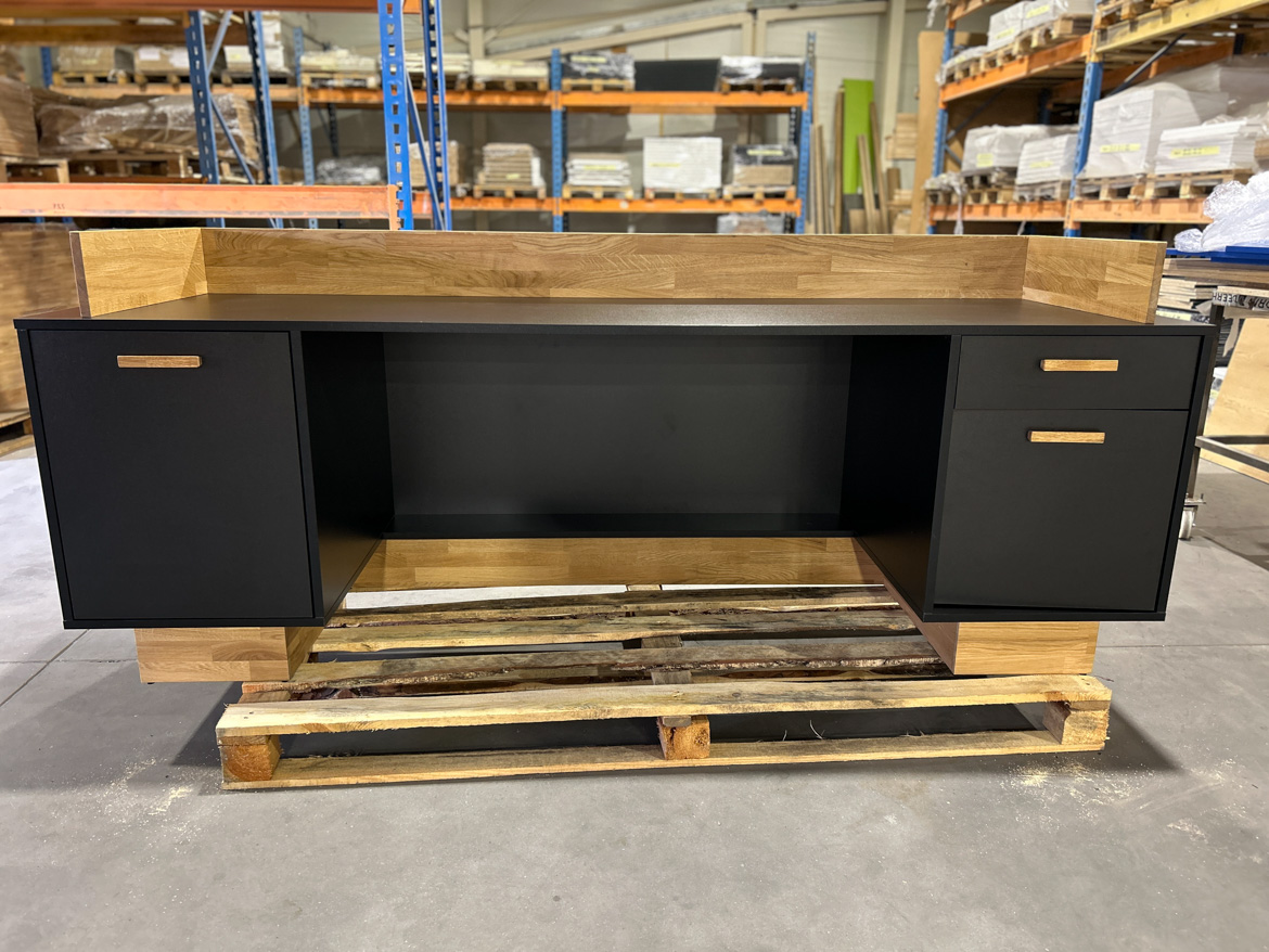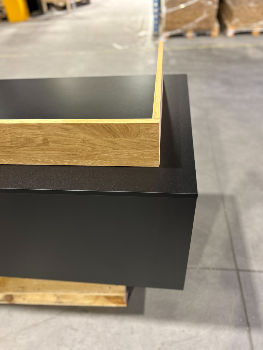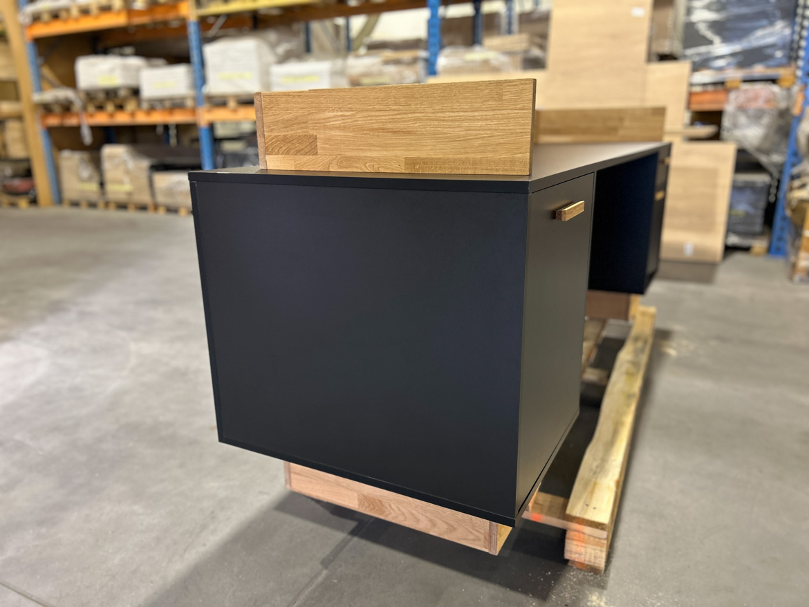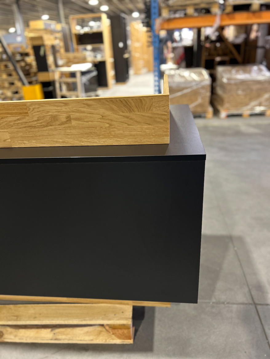 We present our novelty – reception desk made for a client from near Katowice. This is an elegant, solid piece of furniture finished in black matte and natural oak wood.