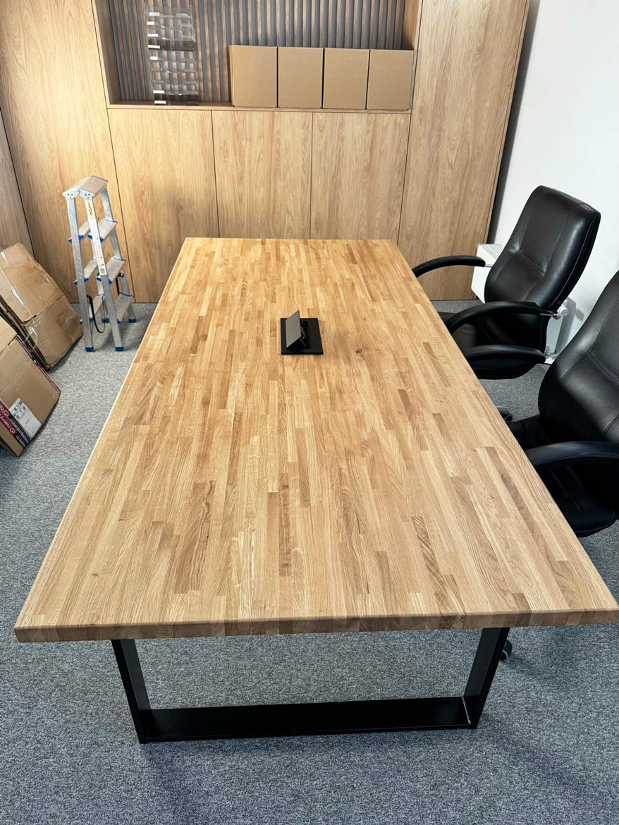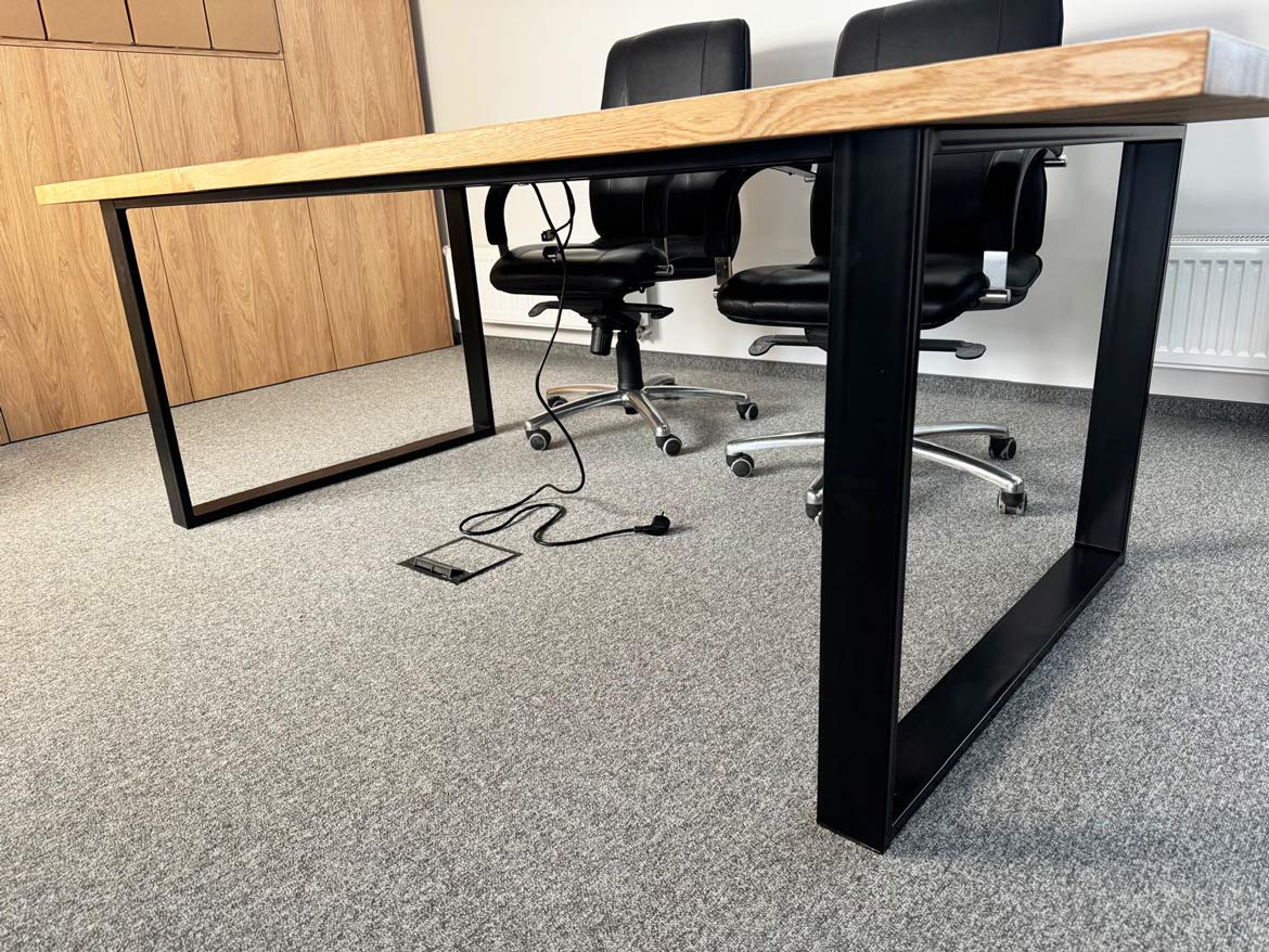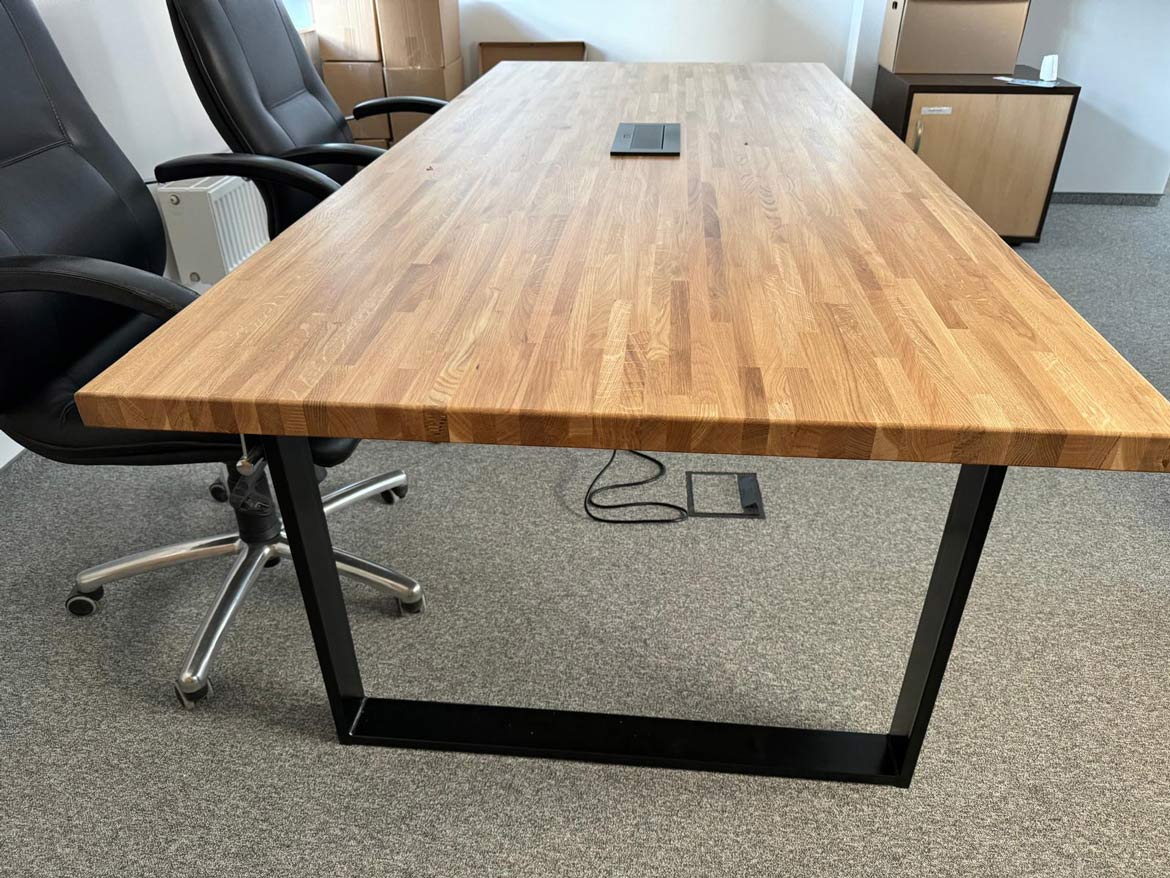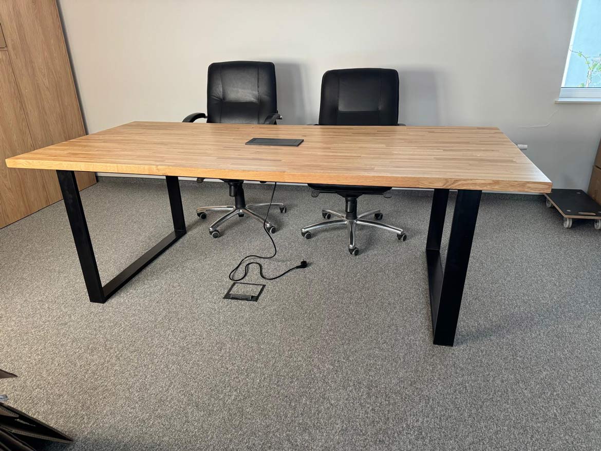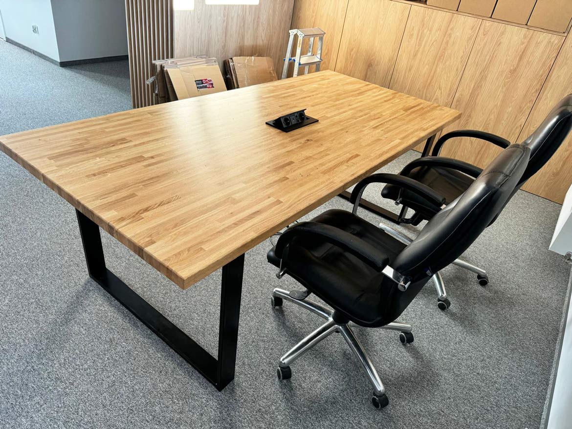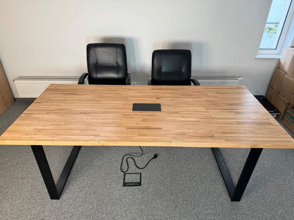 For the Office of Legal Advisors in Wroclaw, we prepared a small conference table that is great for meetings and daily work. It has a solid oak wood top and a black metal base – a simple combination that always looks good.