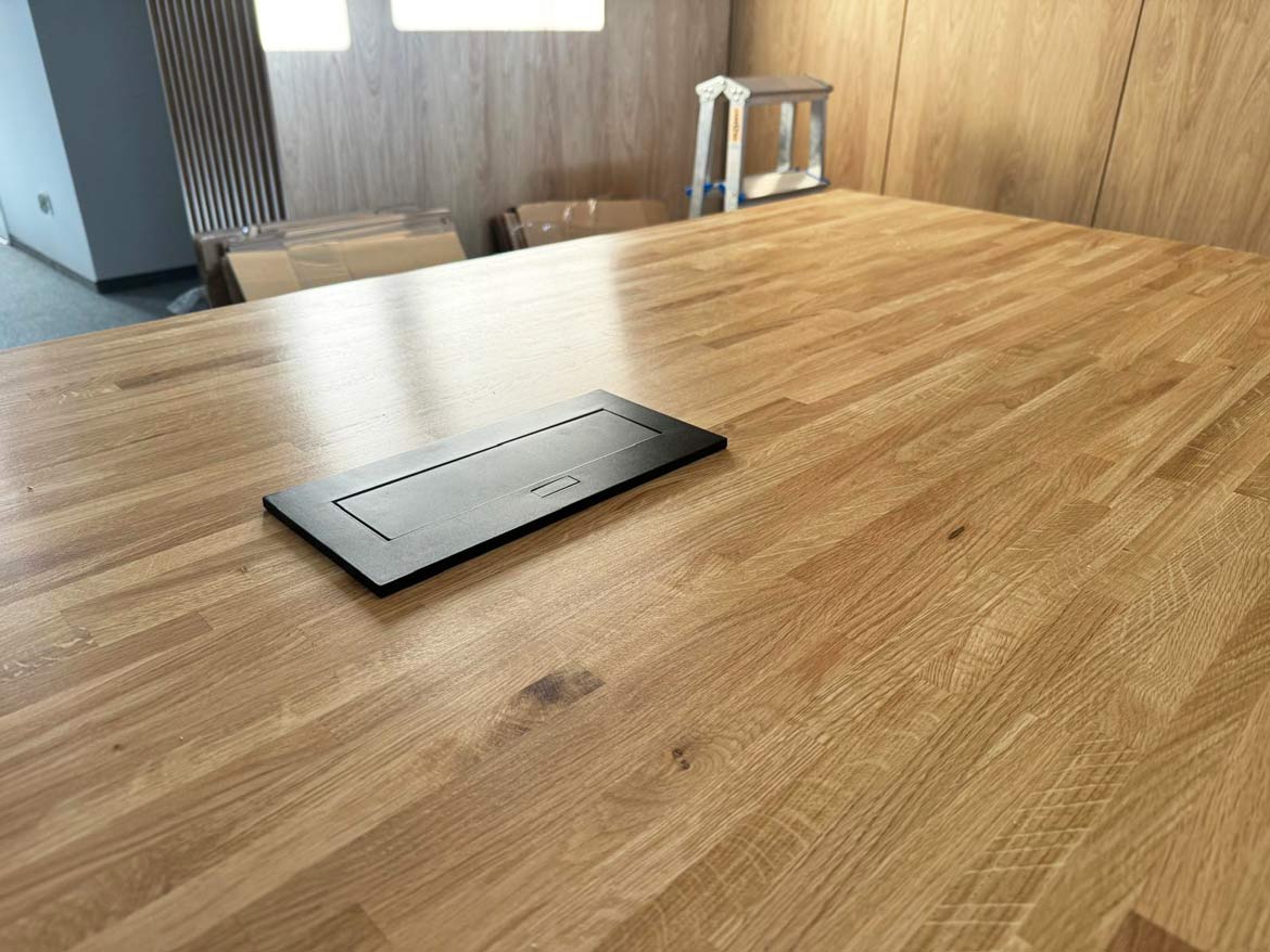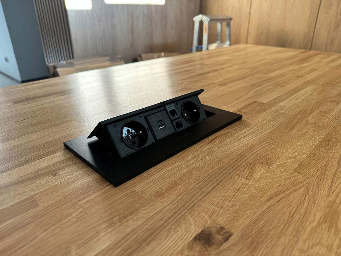 The tabletop also includes a practical power outlet, so you can conveniently plug in a laptop or charger without a tangle of cables. This is a simple but very functional piece of furniture that fits well with the character of the law office.