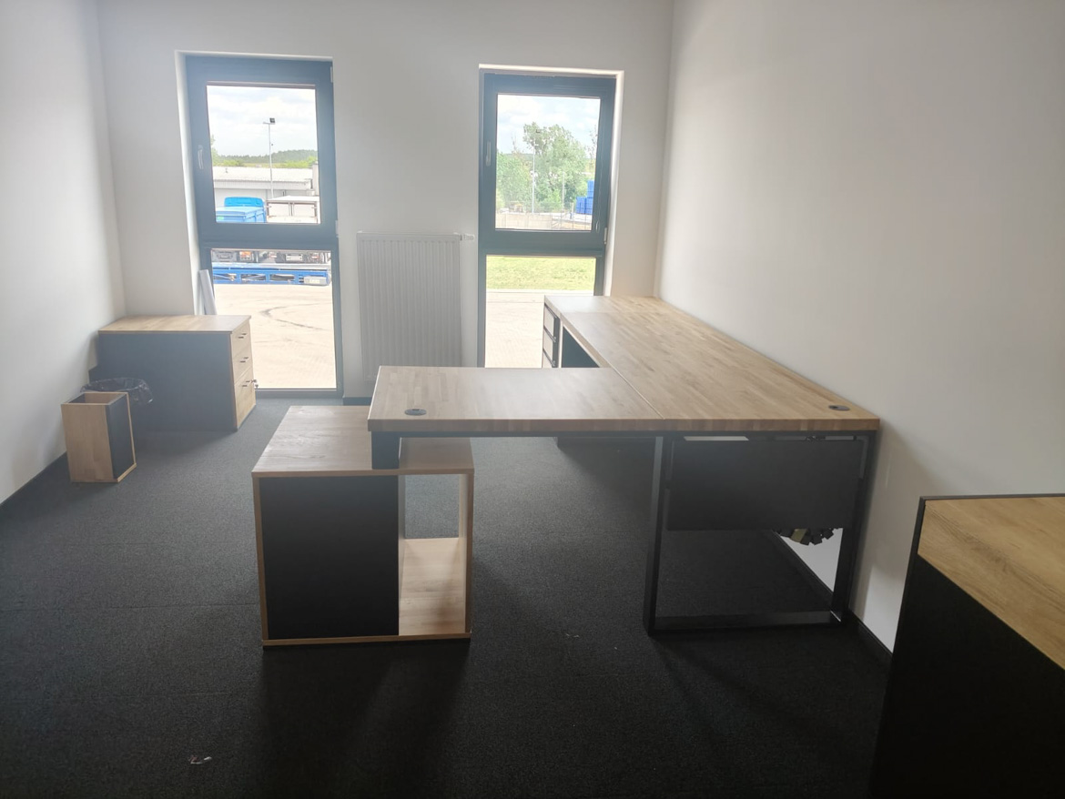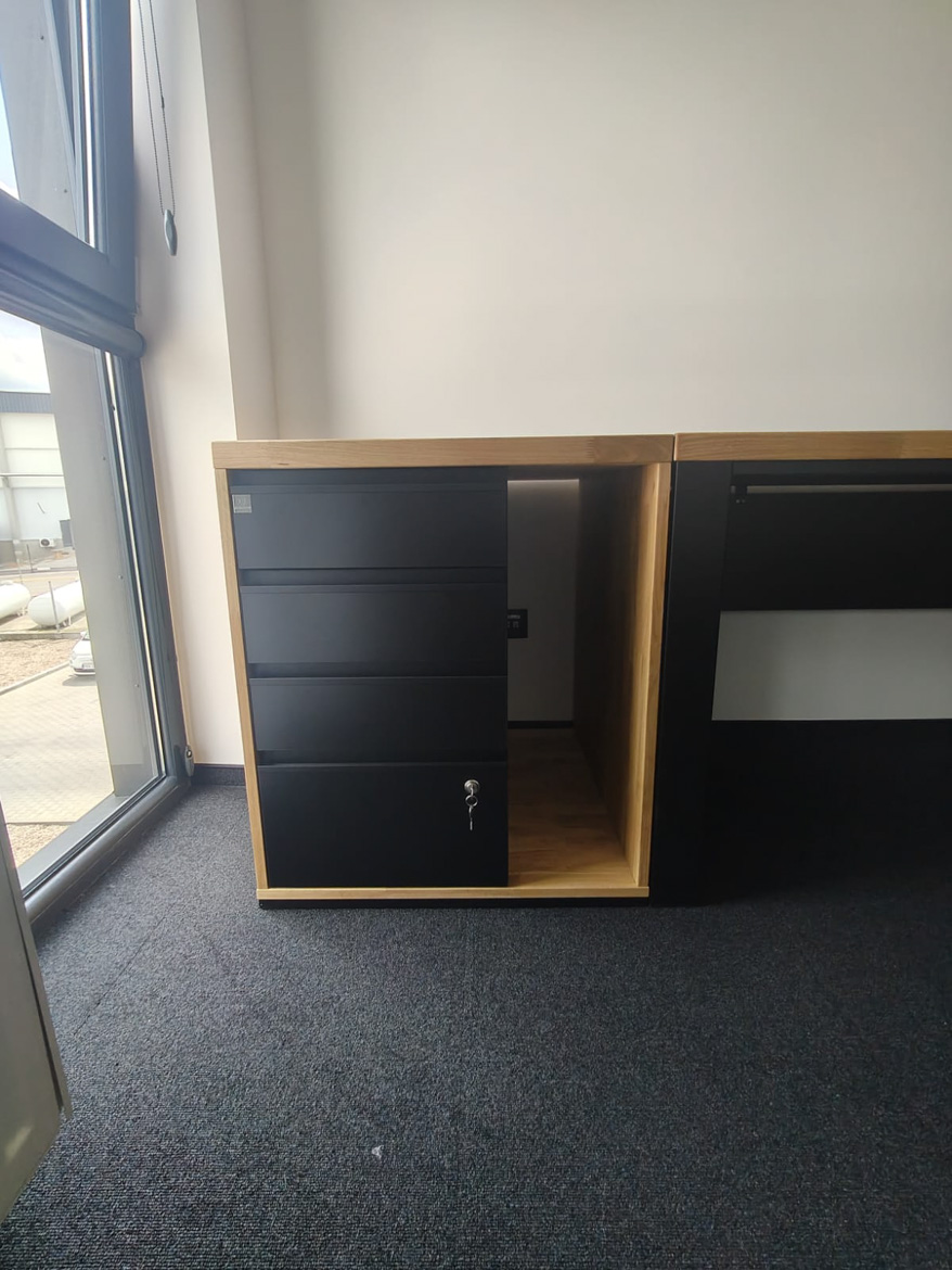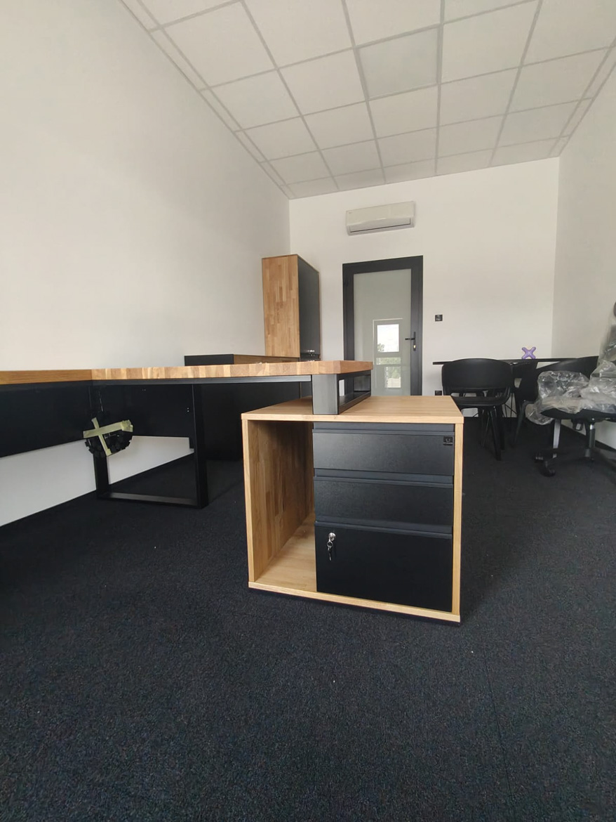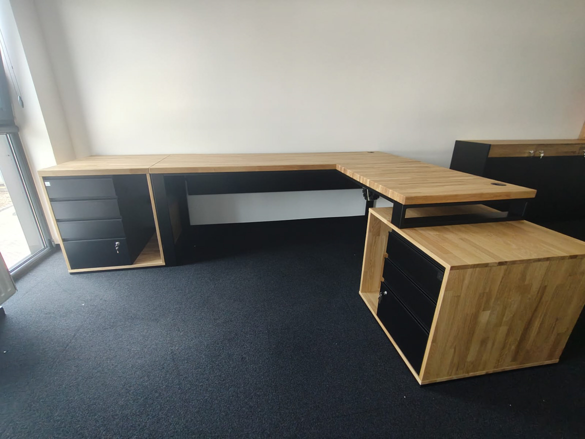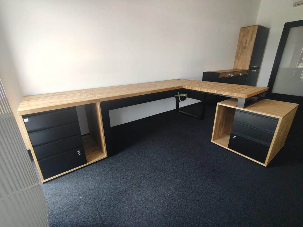 For the company Boneselect Sp. z o.o. We made a corner desk with two pedestals to fit the layout of the room and the daily rhythm of work. The large top provides a comfortable working space, and the roomy drawers help keep things tidy without unnecessary documents on top.