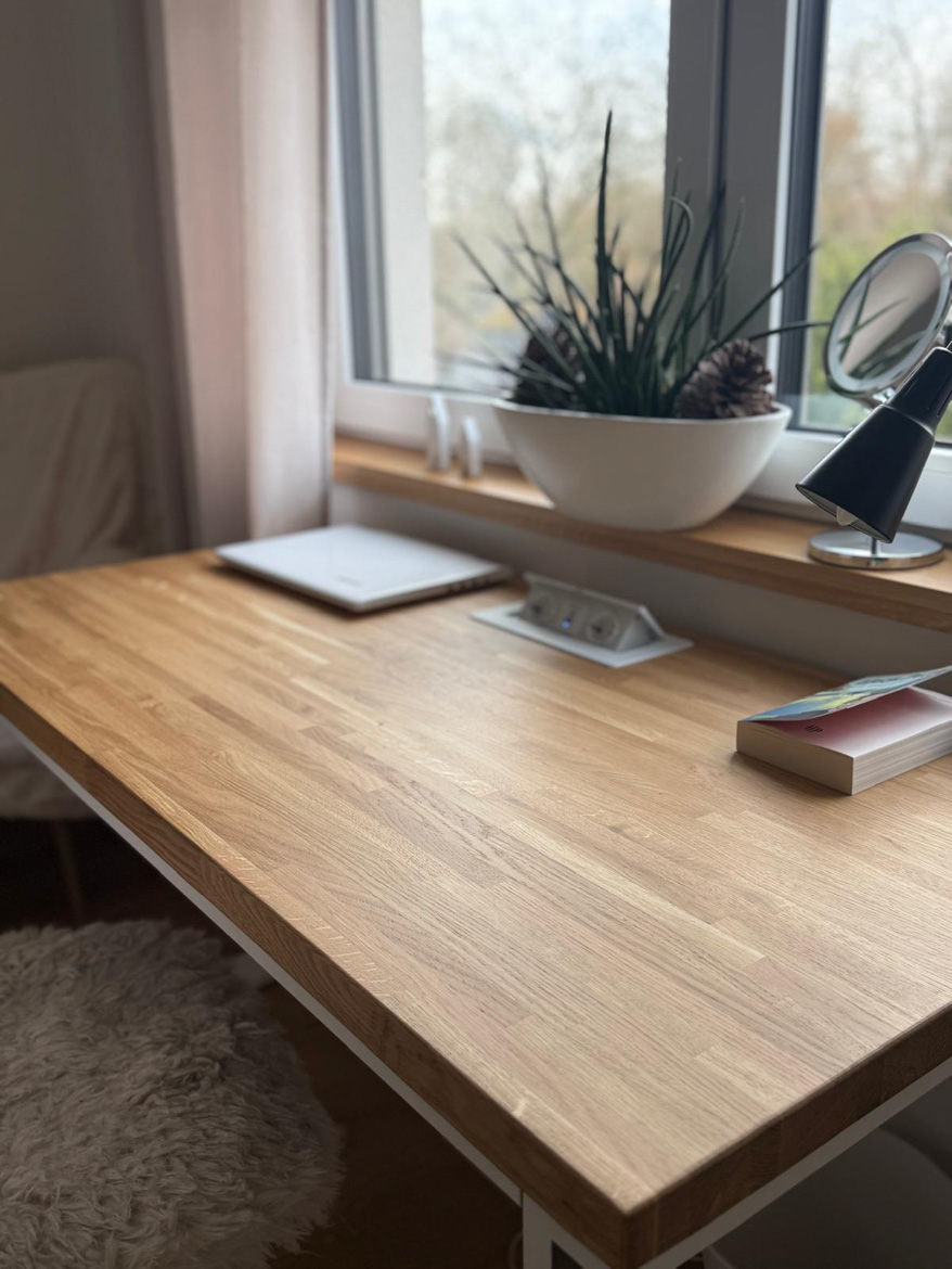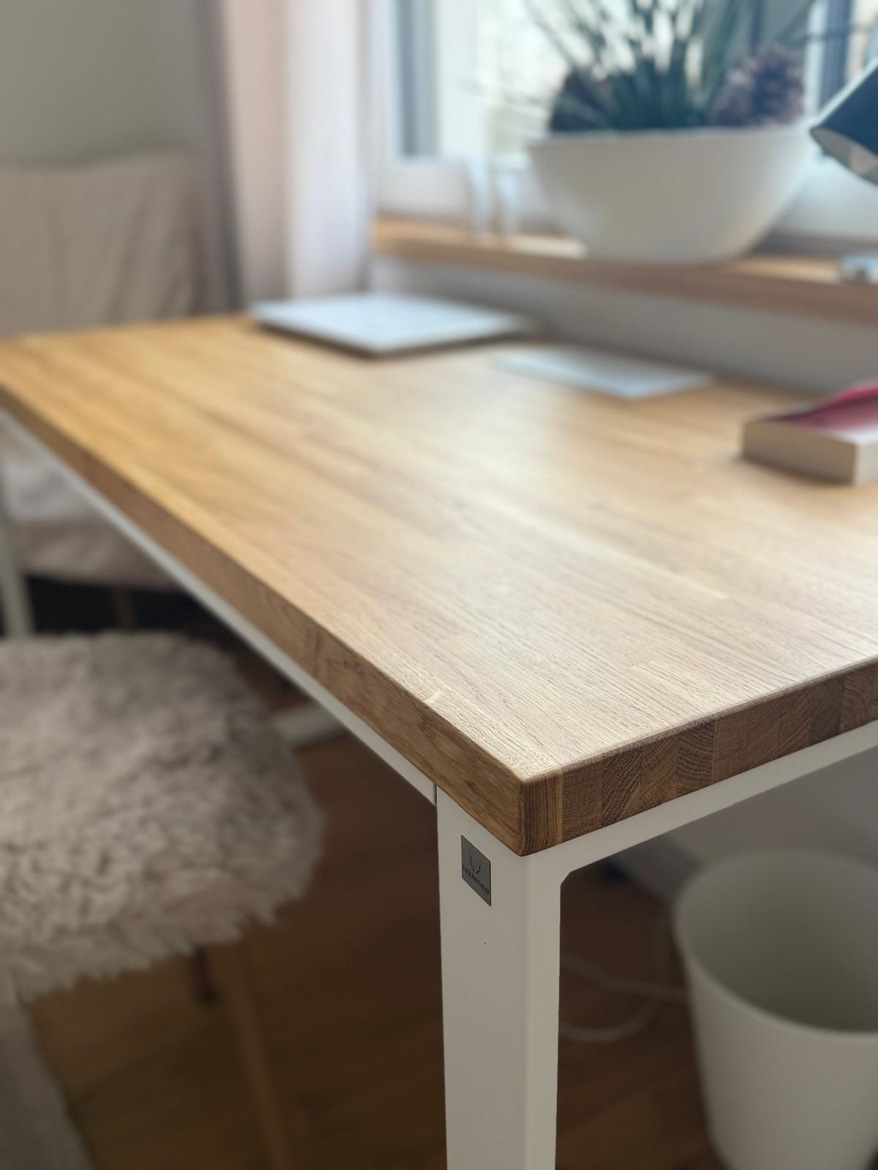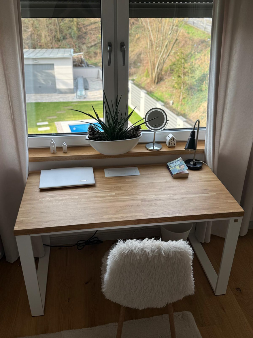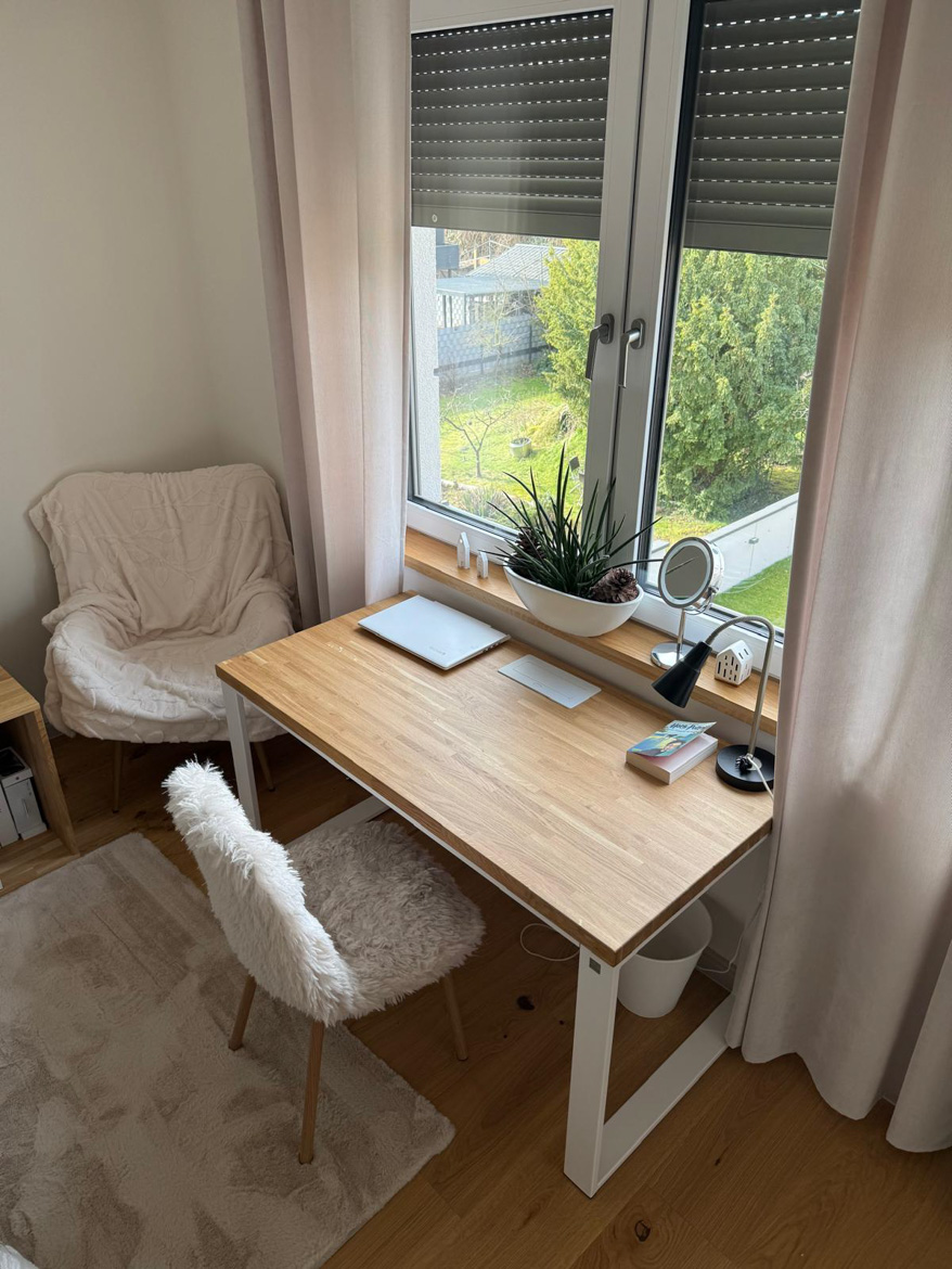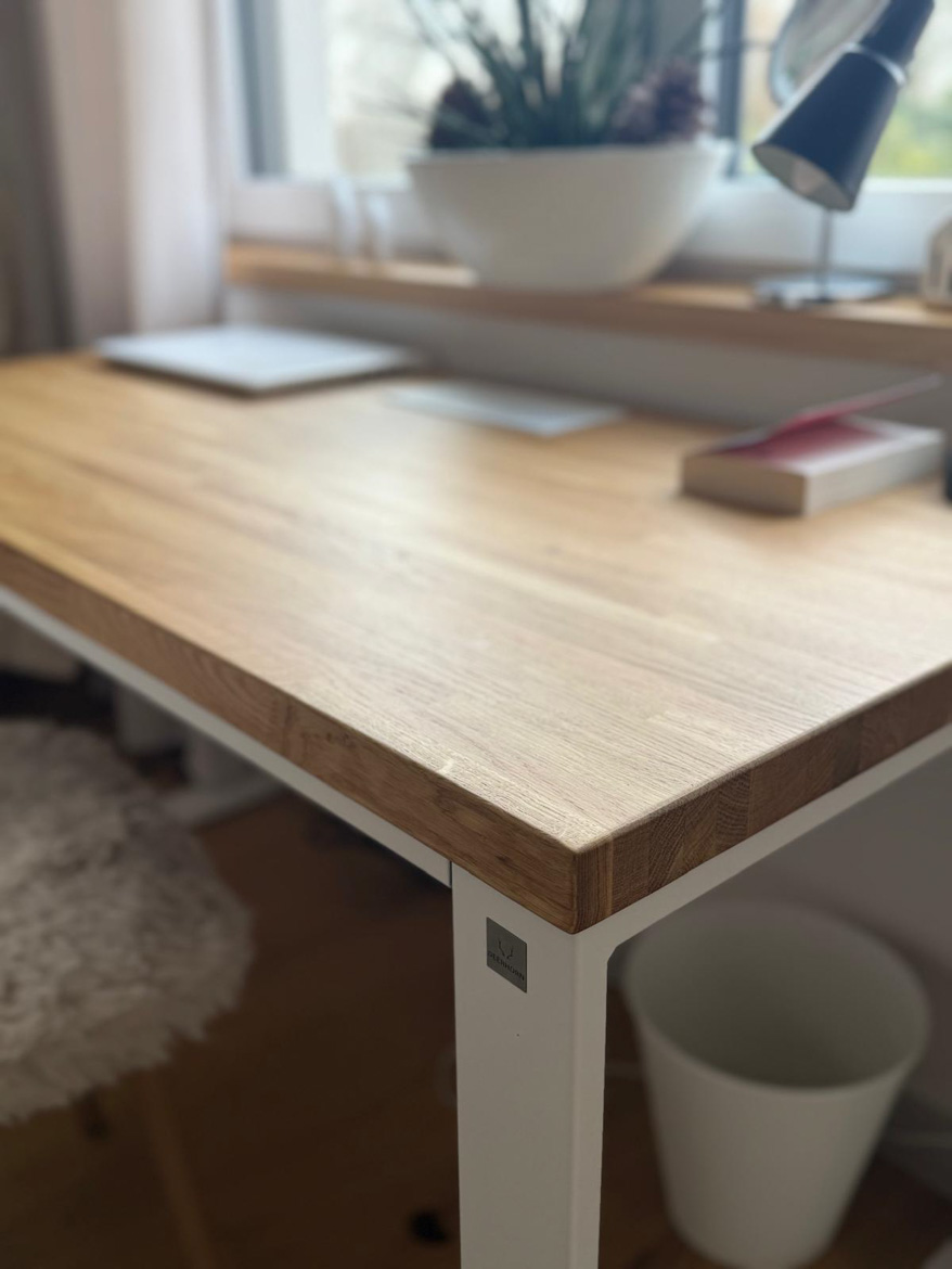 Ms. Aleksandra from Toruń chose our furniture to furnish her bedroom in a consistent, natural style. The interior included a desk with an oak top and a pedestal with drawers, which were used in a slightly different way than in a classic office.