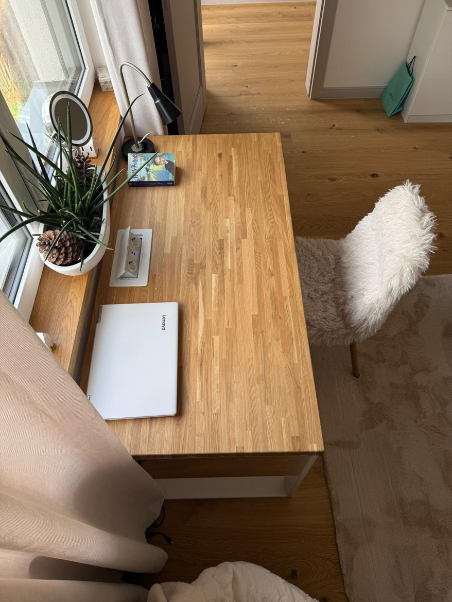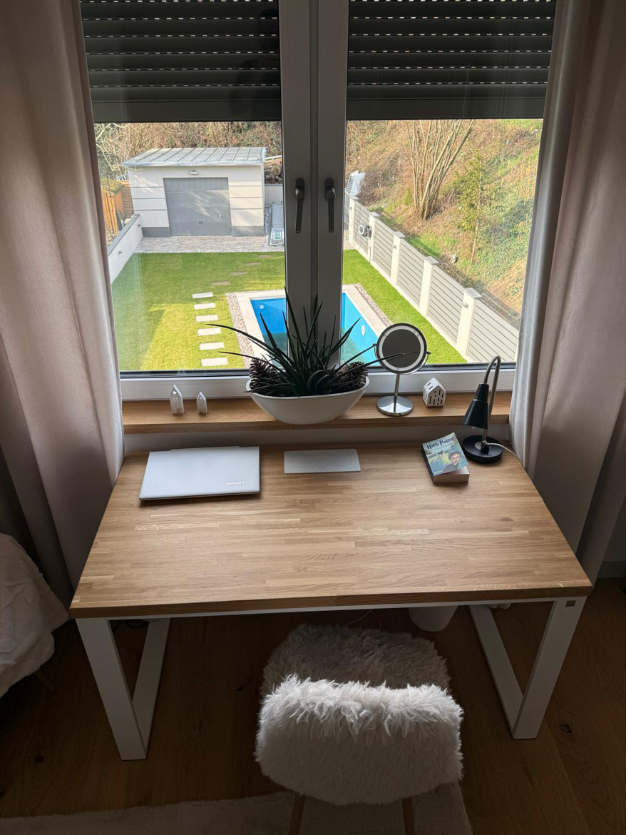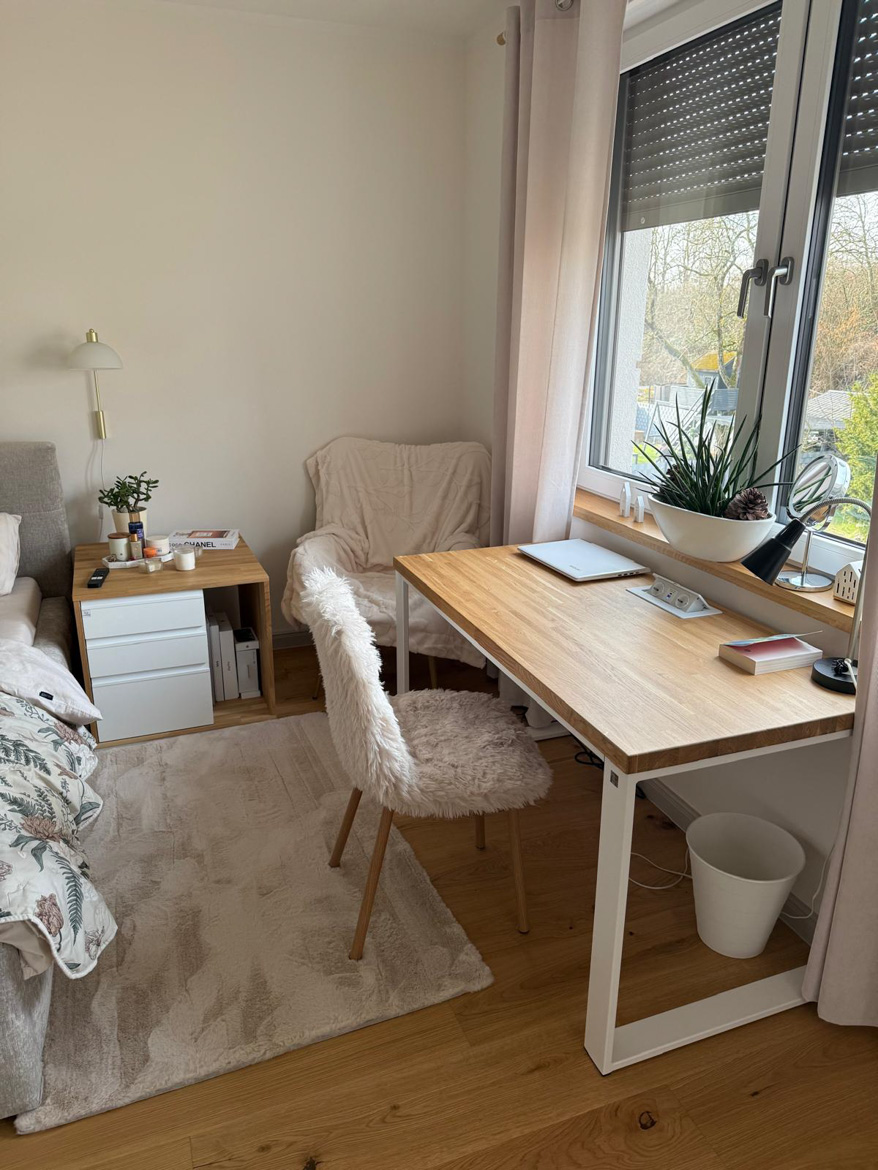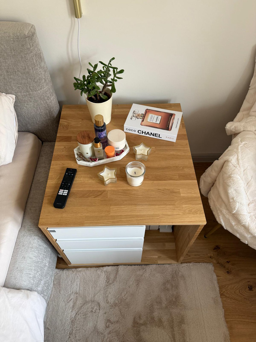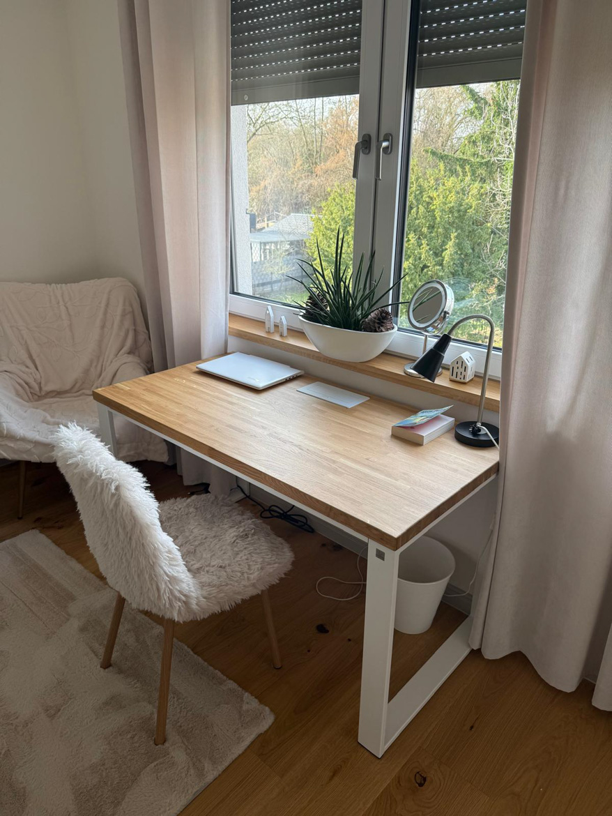Ms. Aleksandra from Toruń chose our furniture to furnish her bedroom in a consistent, natural style. The interior included a desk with an oak top and a pedestal with drawers, which were used in a slightly different way than in a classic office.