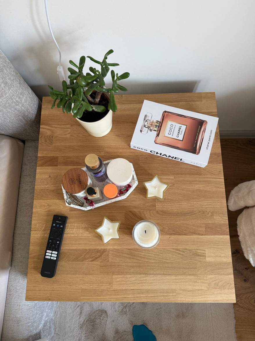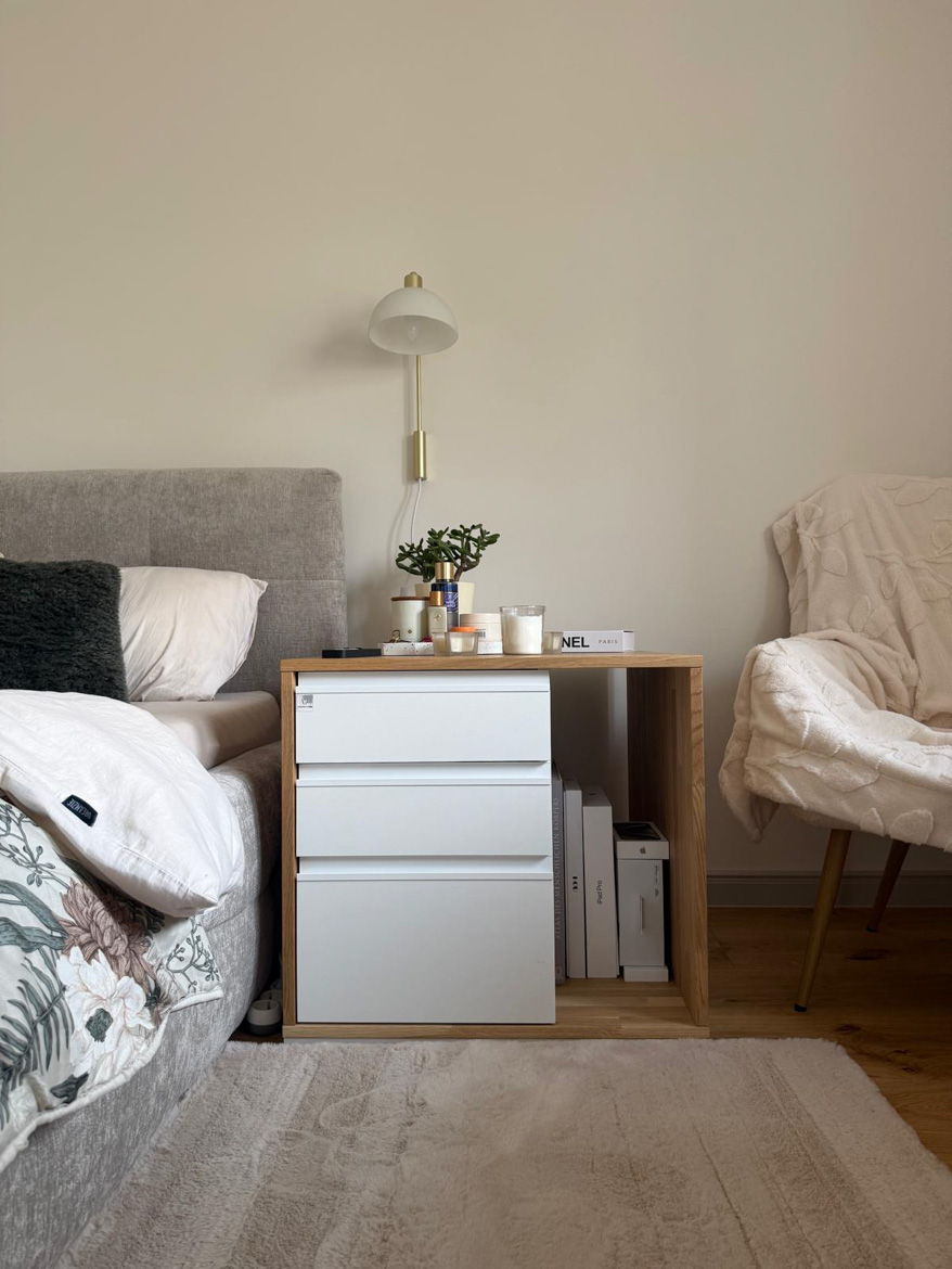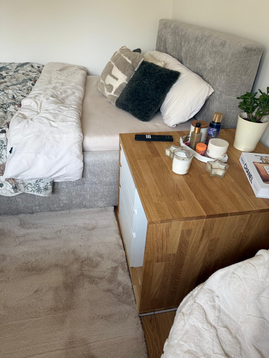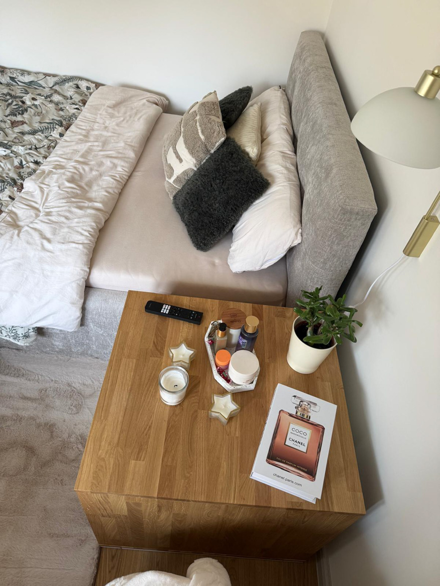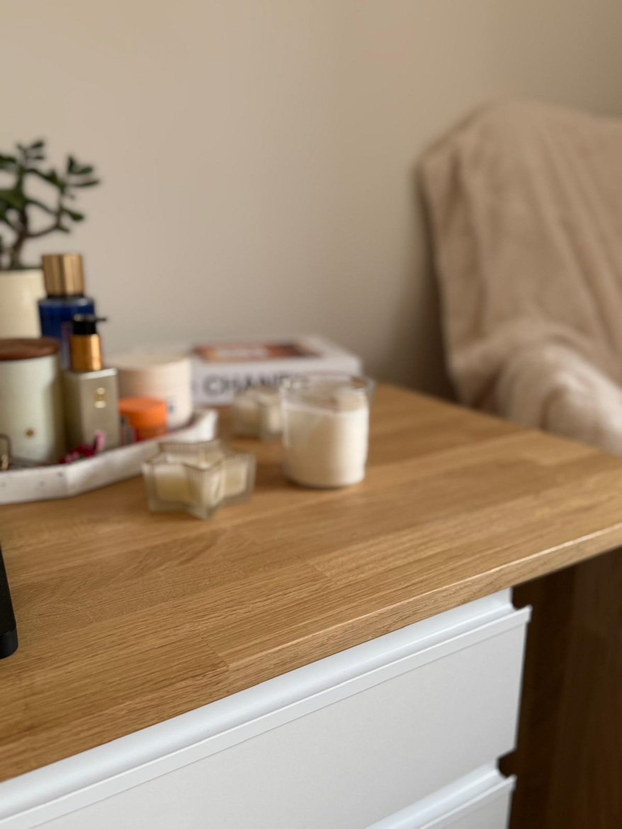 Ms. Aleksandra from Toruń chose our furniture to furnish her bedroom in a consistent, natural style. The interior included a desk with an oak top and a pedestal with drawers, which were used in a slightly different way than in a classic office.