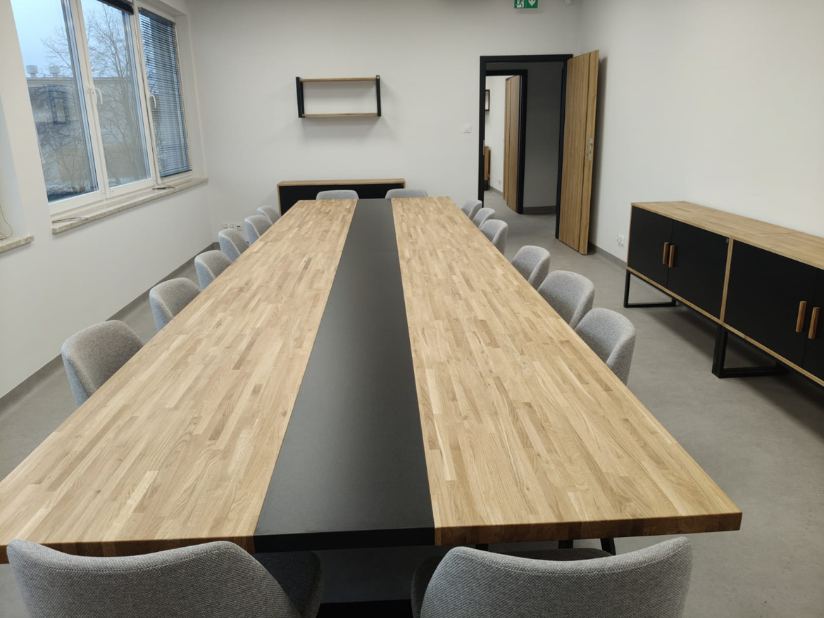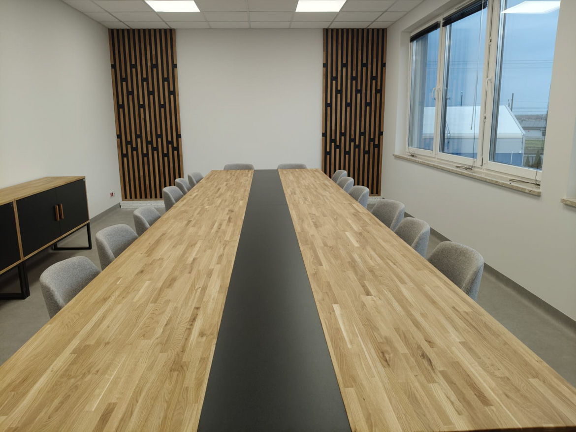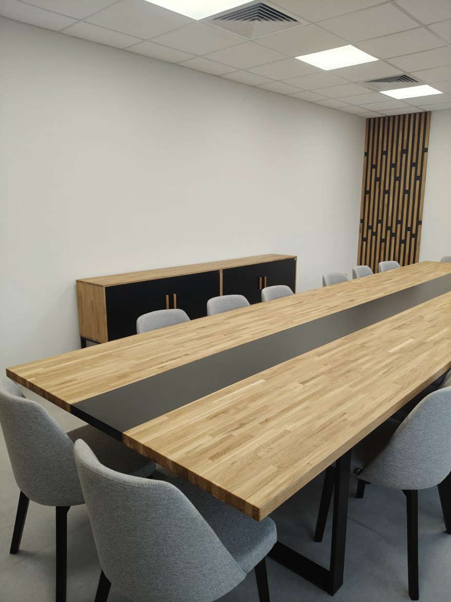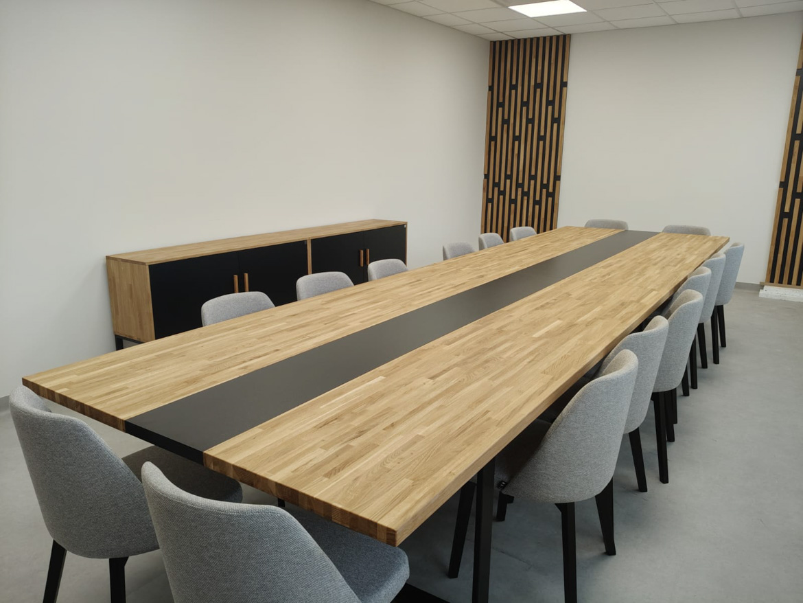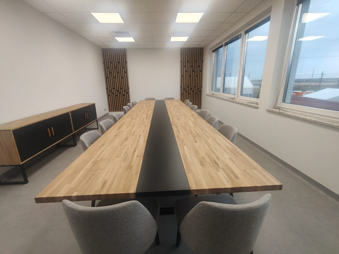 In the center of the room is a 500 × 140 cmconference table with an oak top and solid base, providing comfort during meetings and presentations. The natural wood introduces warmth, and its elegant appearance adds lightness and harmony to the interior.