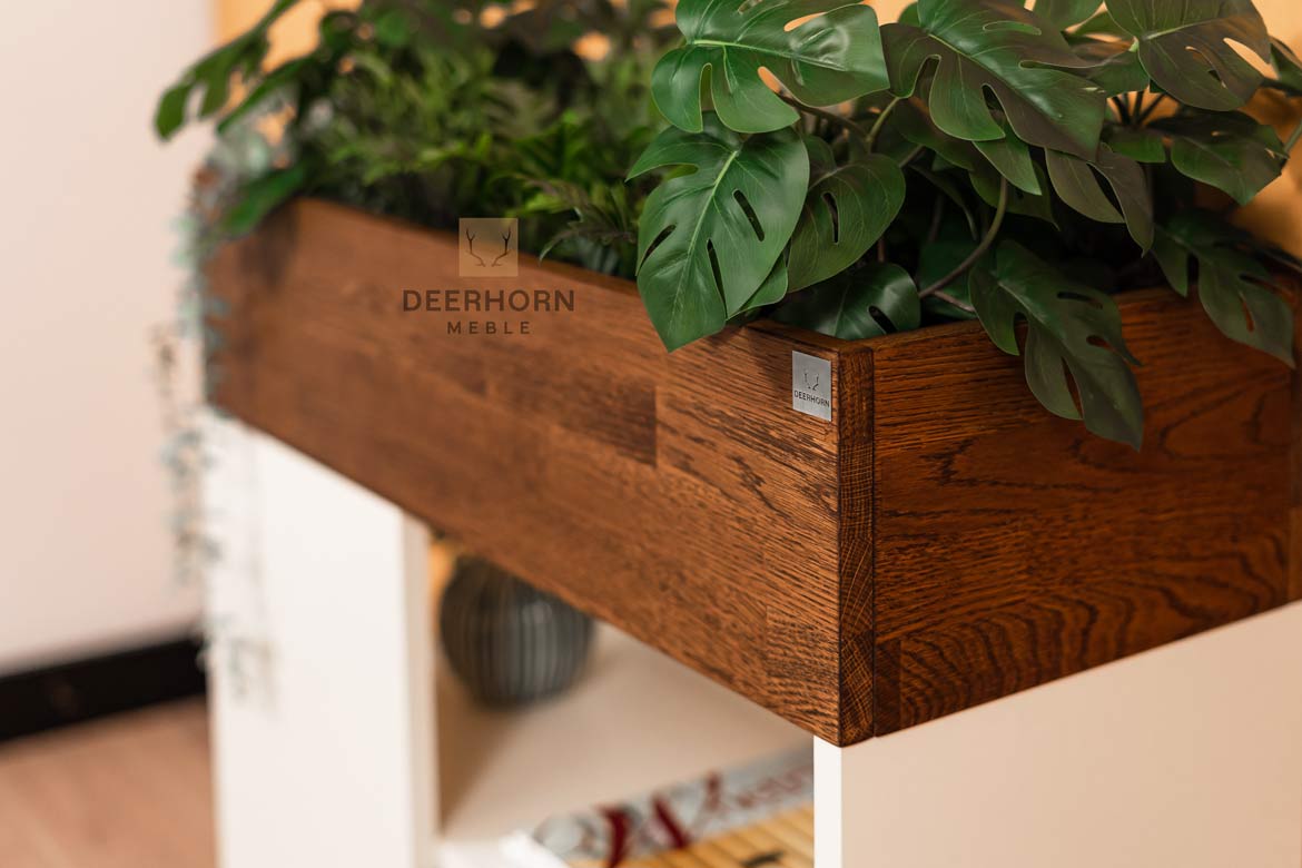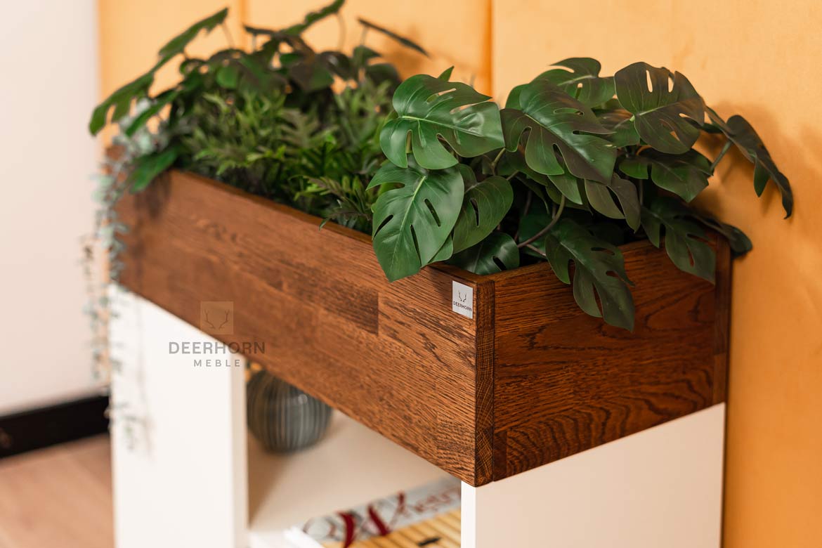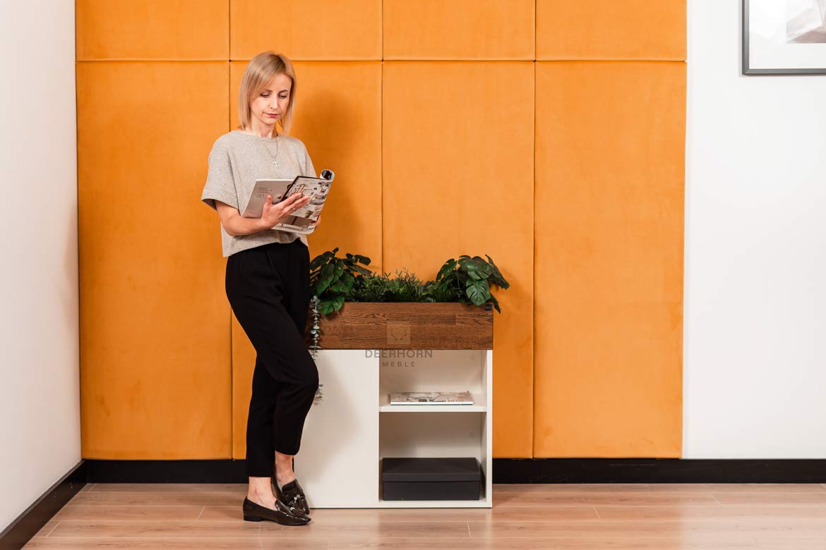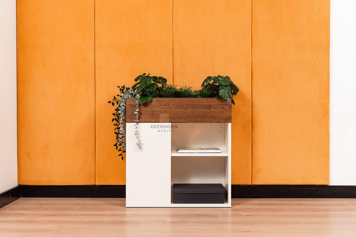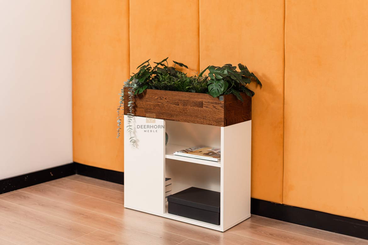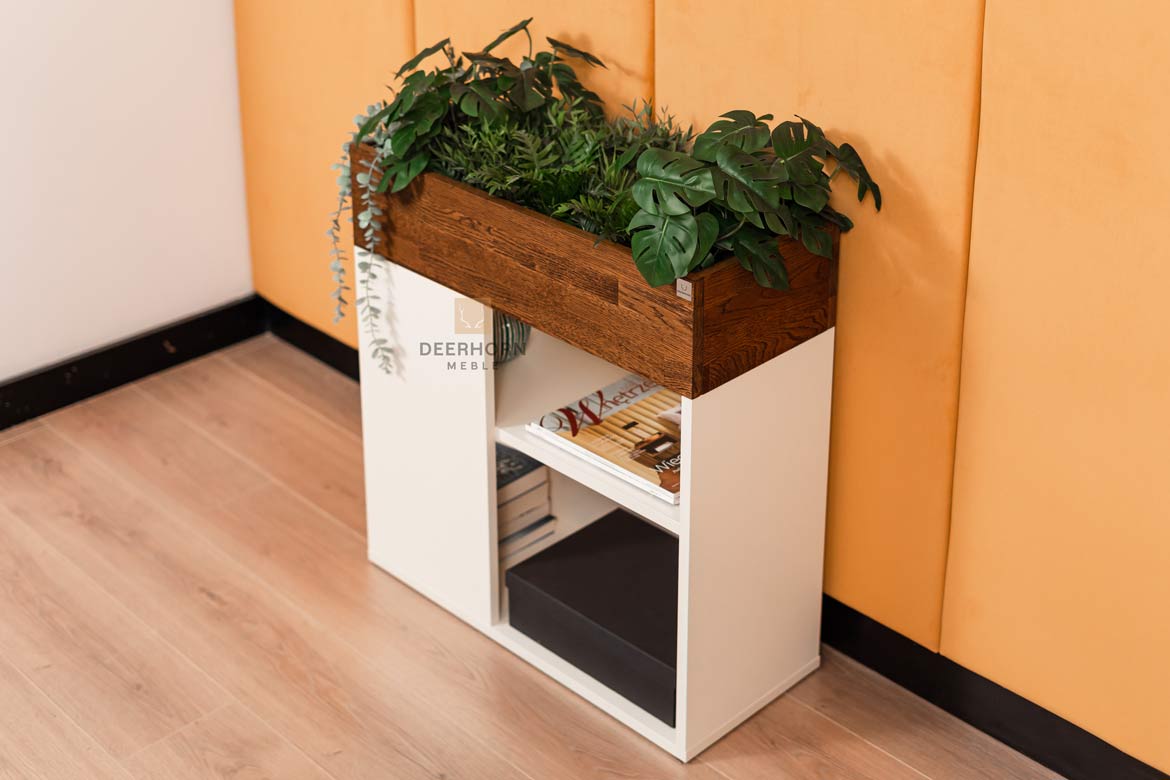 The cabinet with a flowerbed will work well in an office, living room or hallway. Its simple form and the combination of wood and light color match many modern arrangements. It is a piece of furniture that is both practical and decorative.