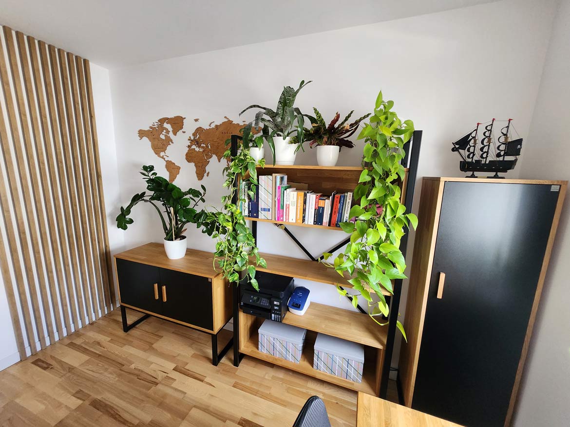 The implementation included modern office furniture made of solid wood, complemented by elements in black. The whole creates a coherent arrangement, which combines elegance with practical solutions.