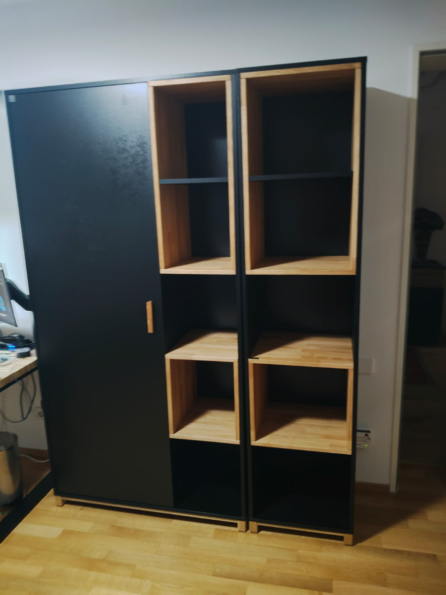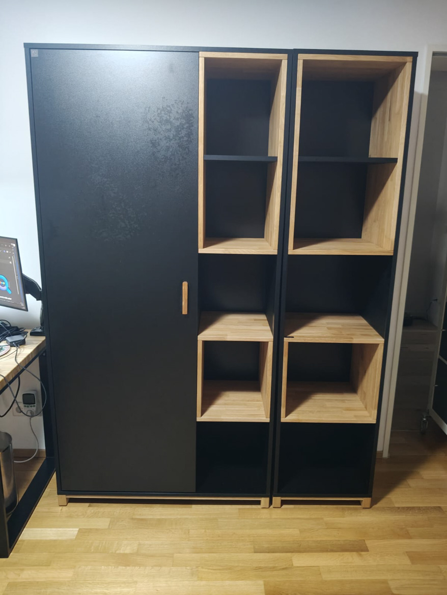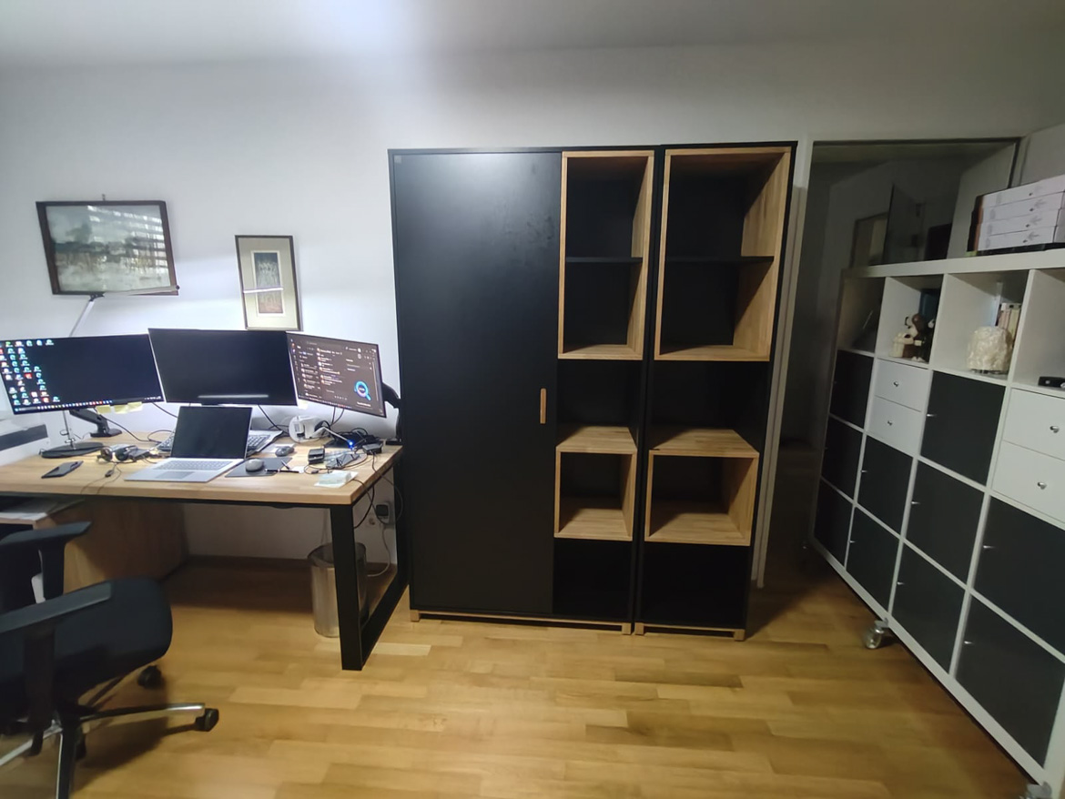 Our client from Germany works on an elaborate workstation with several monitors, so he needed a sturdy desk and facilities to help him embrace all the equipment. So we prepared a sturdy desk, a capacious cabinet and bookcases with open niches. Such a set allowed him to organize the space and create a comfortable place to work, where everything is at hand.
