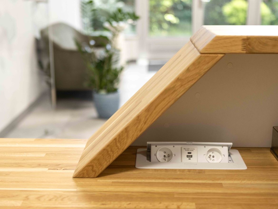 - Built-in extension cord in the countertop – a practical solution that provides easy access to power without having to run cables outside the counter. It allows convenient connection of a laptop, payment terminal, charger or other devices needed during daily work.