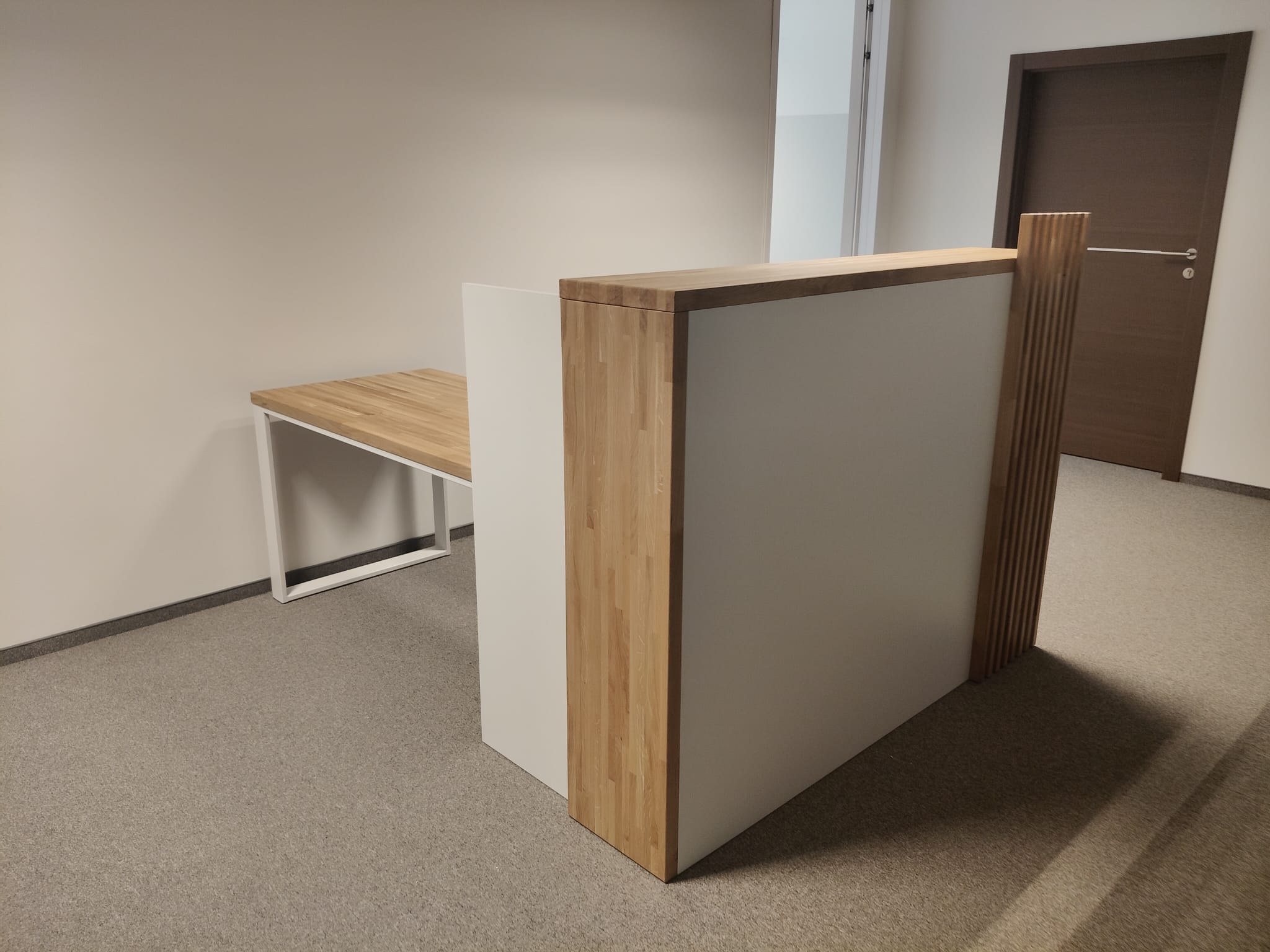 The order included modern corner desk , made of solid oak wood and white powder-coated steel. The desk serves as a reception counter.