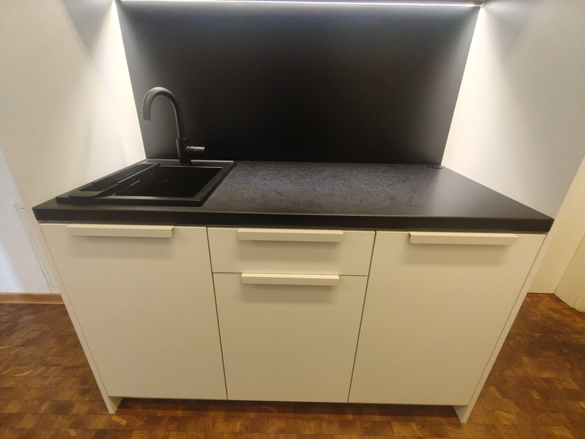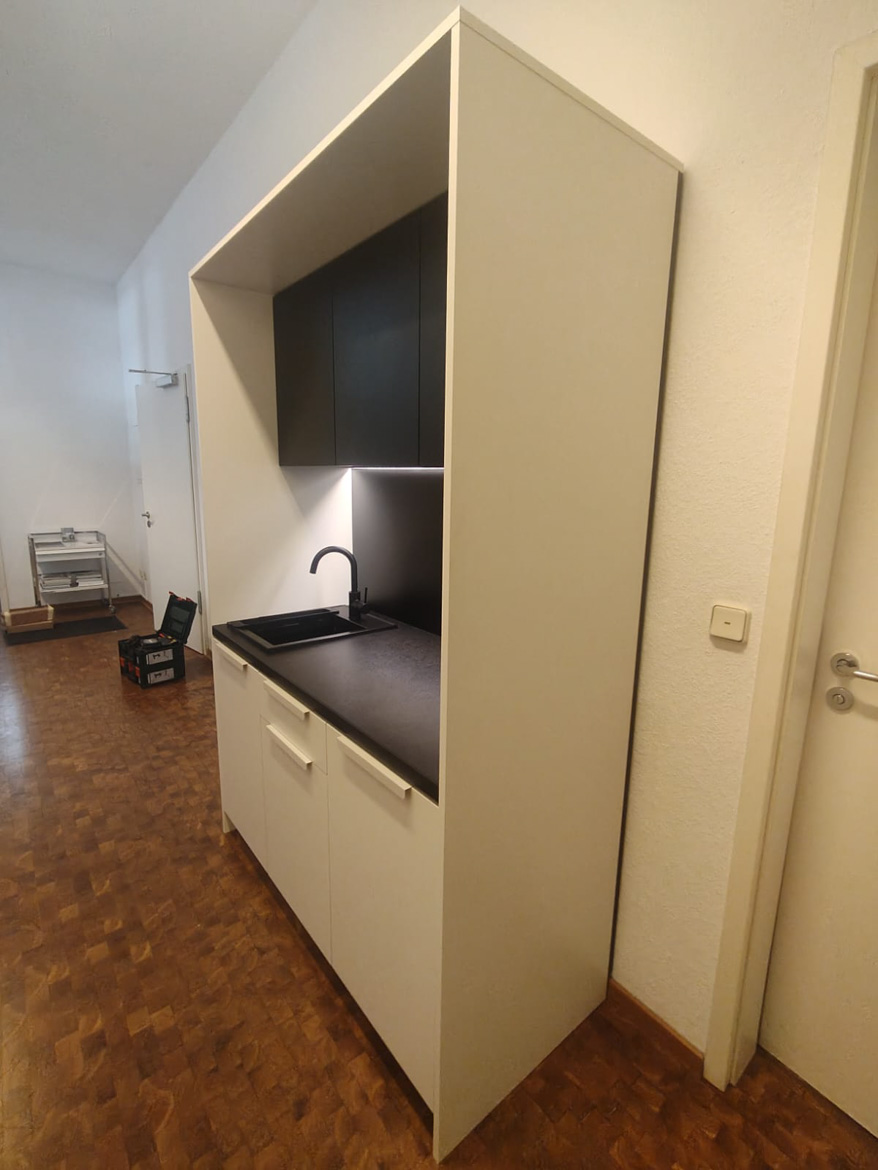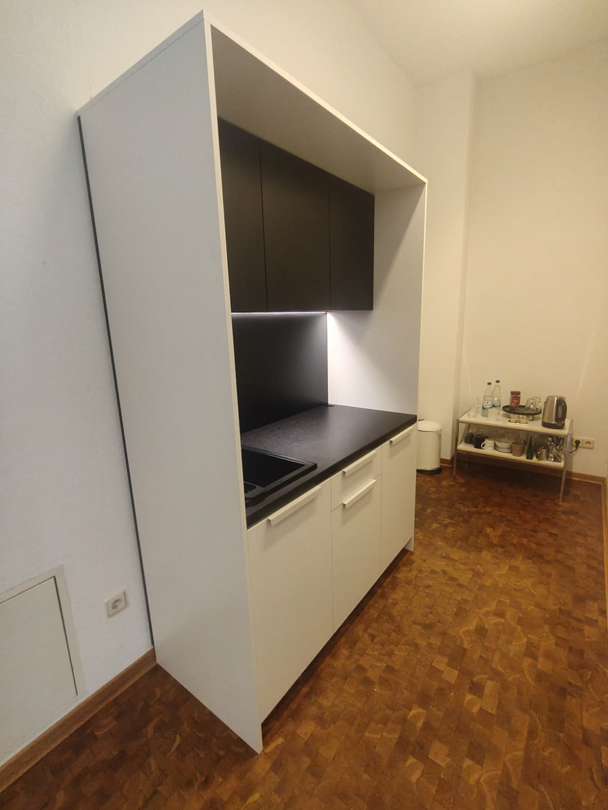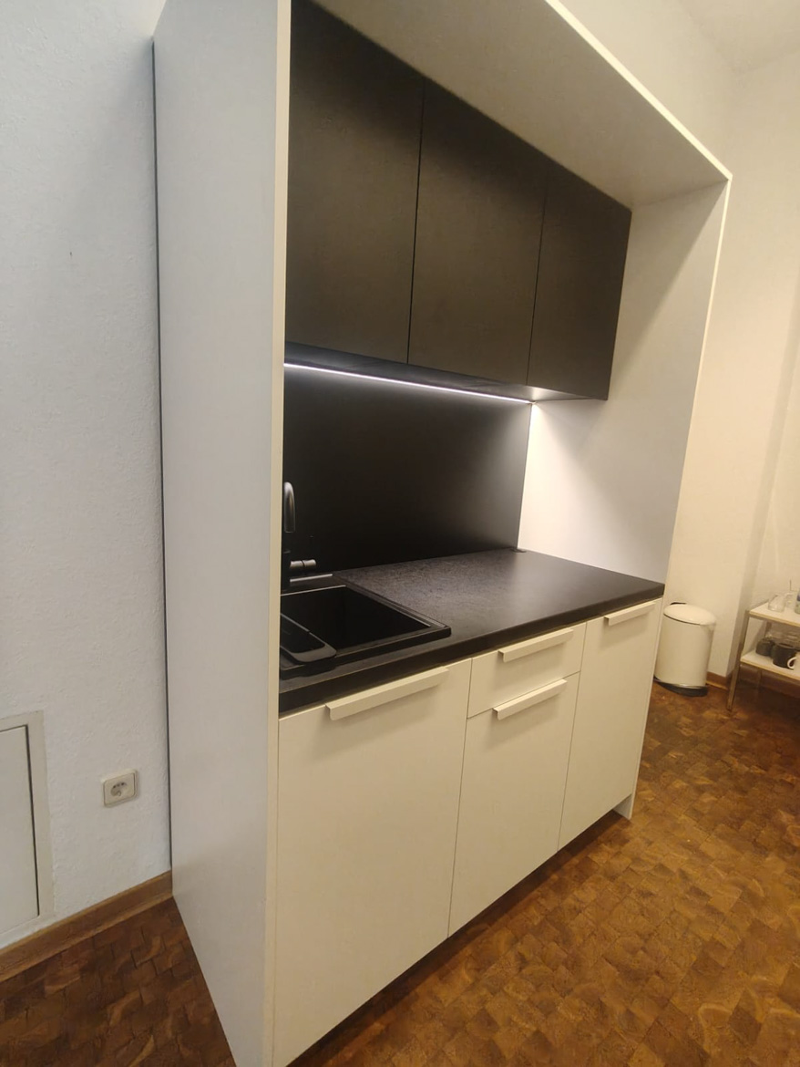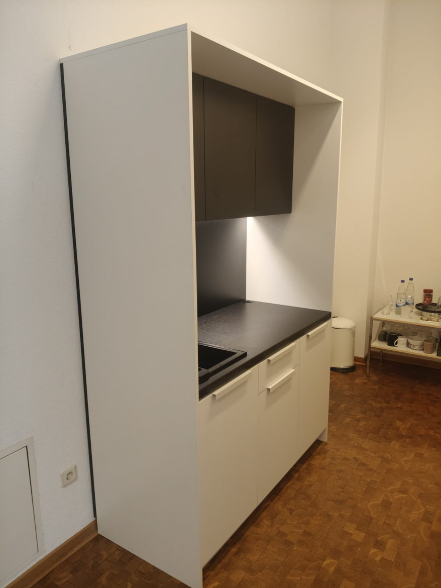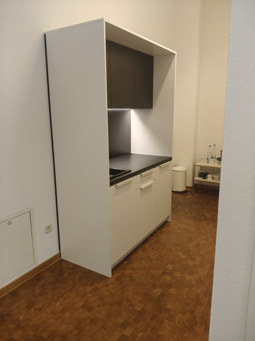 For an architectural and engineering office in Frankfurt, we made a kitchenette designed for daily use by the team. The cabinetry was designed to make good use of the available space and to be convenient when preparing coffee or taking a short break from work.