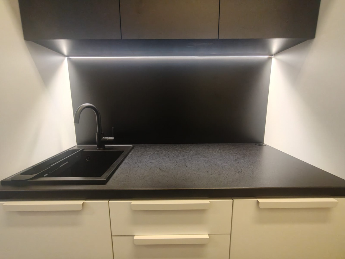 The annex consists of lower cabinets with storage space, a worktop with a sink and an upper cabinet. The whole is kept in light colors with a contrasting dark countertop and fronts in the upper part. Additional lighting under the cabinets improves the comfort of the workspace.