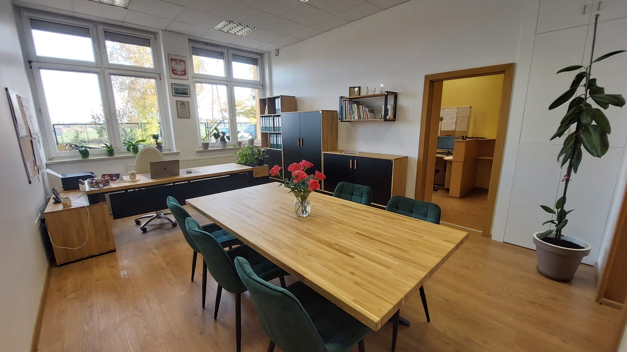 In one of the rooms of the Public Kindergarten-School Complex with the teaching of a national minority language – German – an interior full of elegance was created with the comfort of everyday work in mind. Our task was to comprehensively furnish the director’s office with office furniture with natural finishes, which emphasize the warm and friendly atmosphere of the school.
