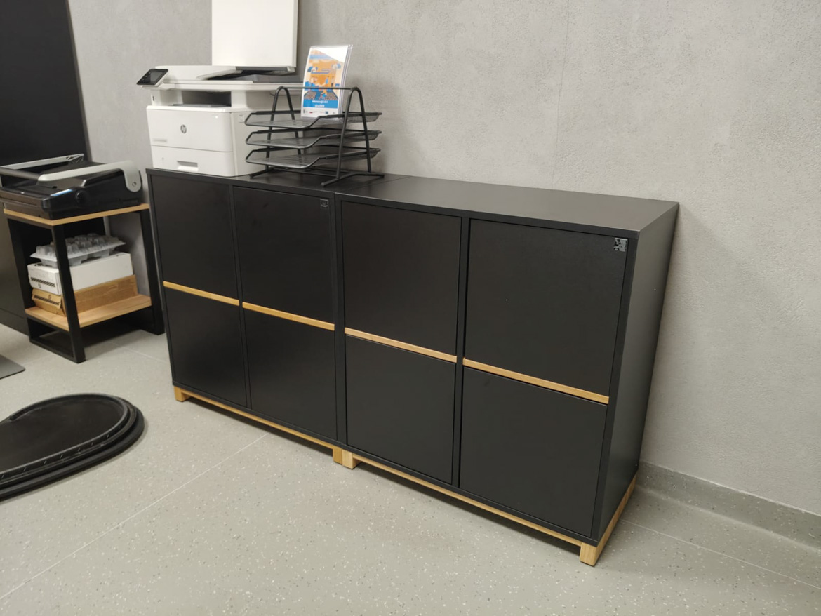 For a client from Górzyca, we made office dressers that bring order and a calm, professional atmosphere to the office. The simple black form was highlighted with a horizontal insert of natural wood and a wooden base, making the whole look elegant and timeless.