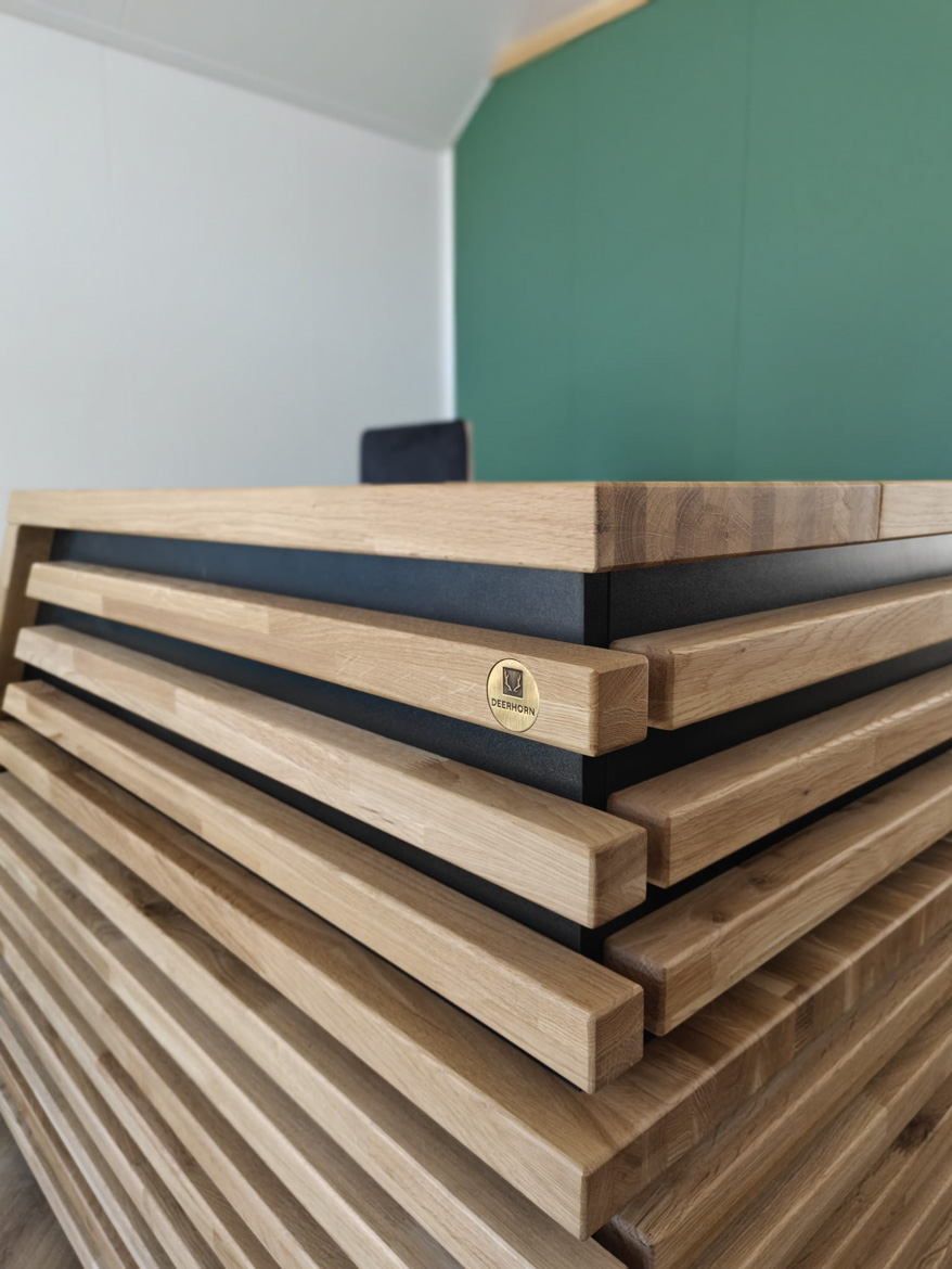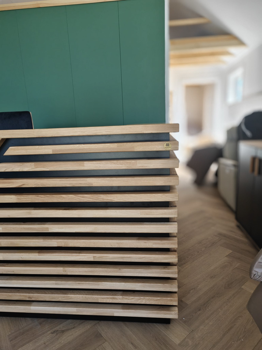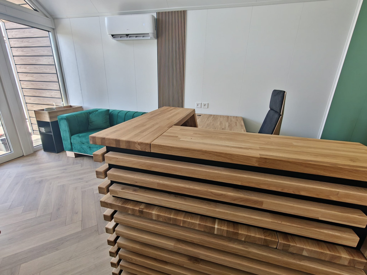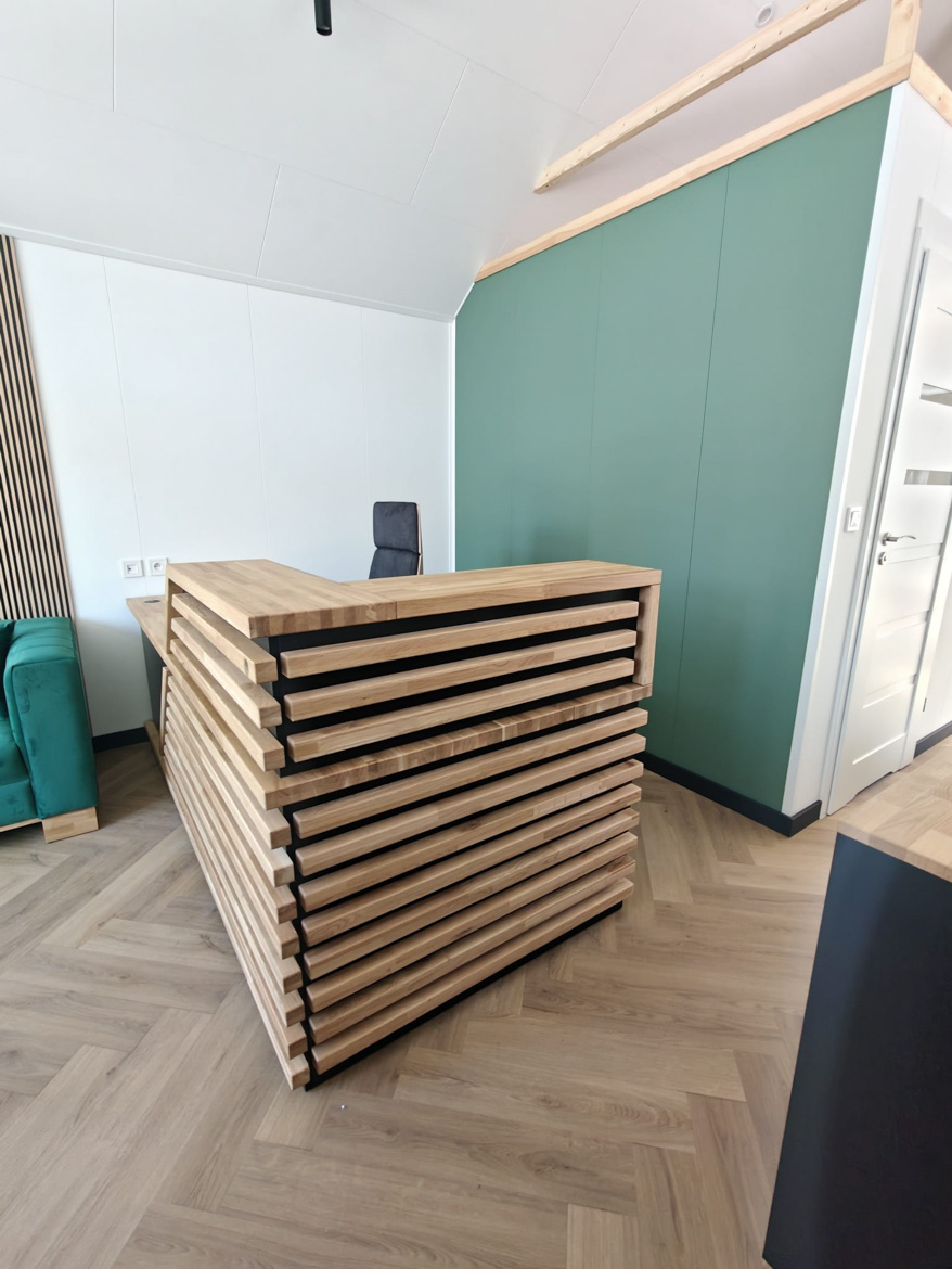 The heart of the office has become our reception counter, which the client decided on. This is our absolute bestseller, which catches the eye with its massive natural oak top. The combination of wood and black furniture board gives the interior a modern style, and the large work surface provides employees with full freedom.