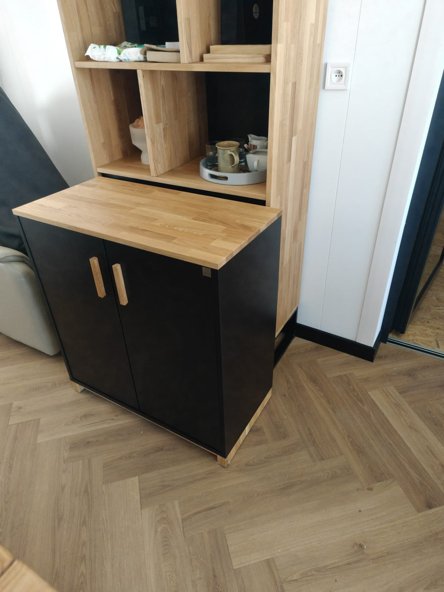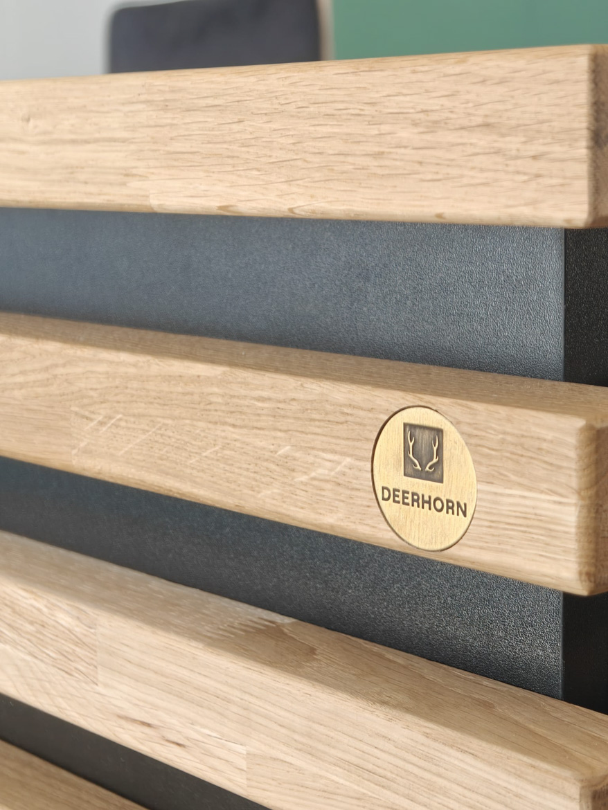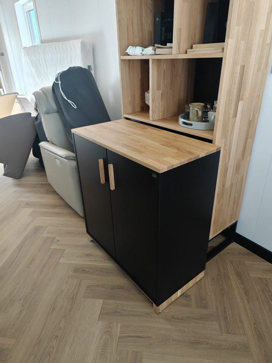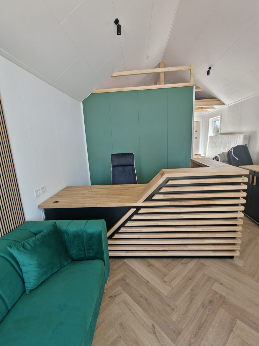 The heart of the office has become our reception counter, which the client decided on. This is our absolute bestseller, which catches the eye with its massive natural oak top. The combination of wood and black furniture board gives the interior a modern style, and the large work surface provides employees with full freedom.