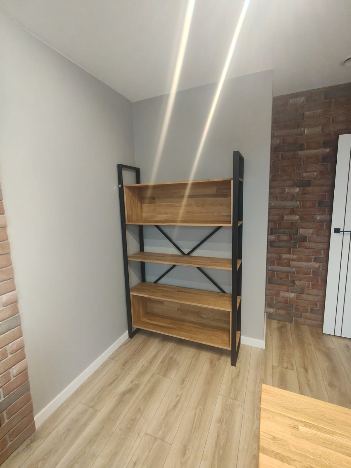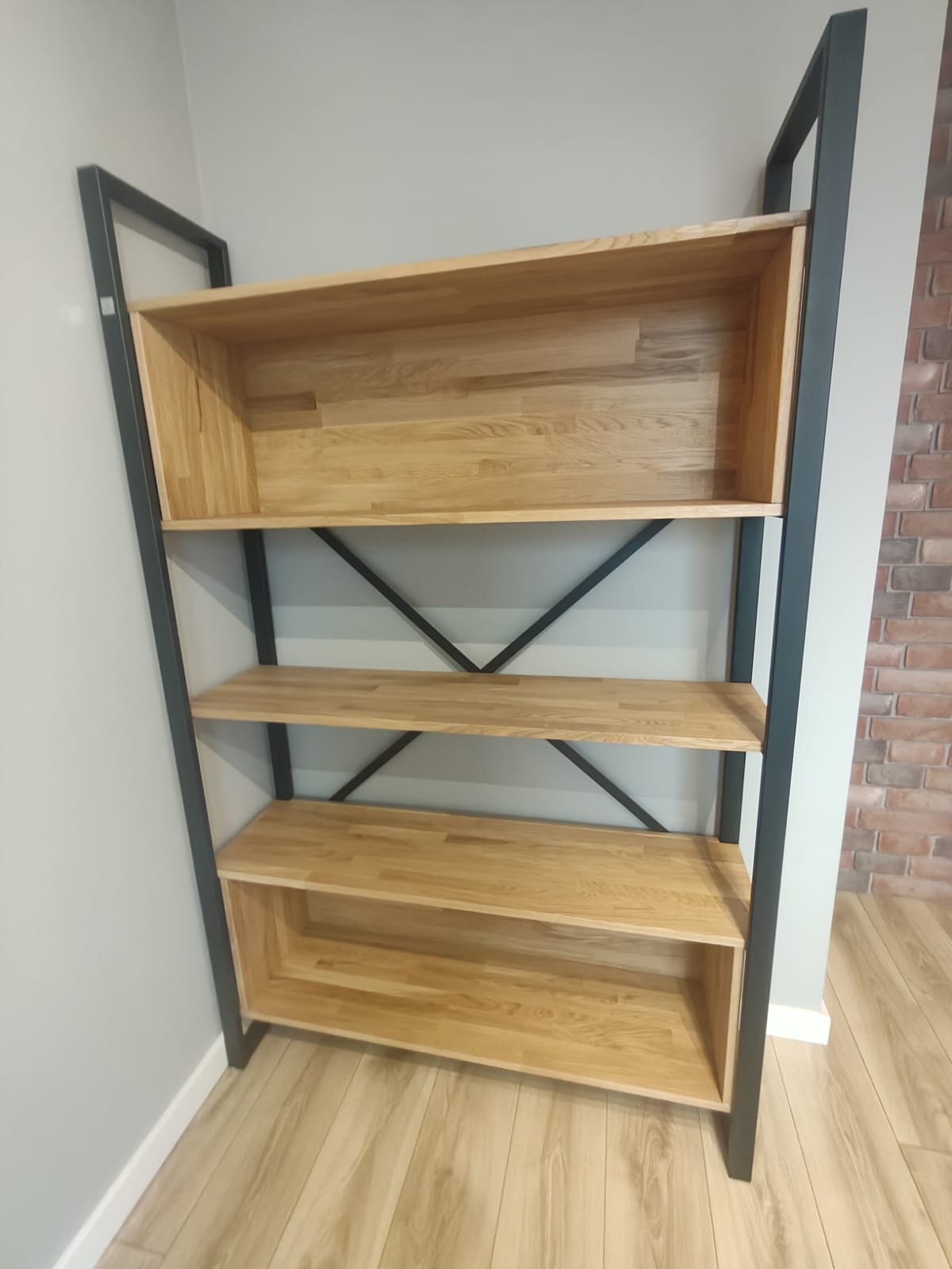 The structure was made of powder-coated steel in matte black. We made the shelves from oak with a thickness of 1.8 cm.