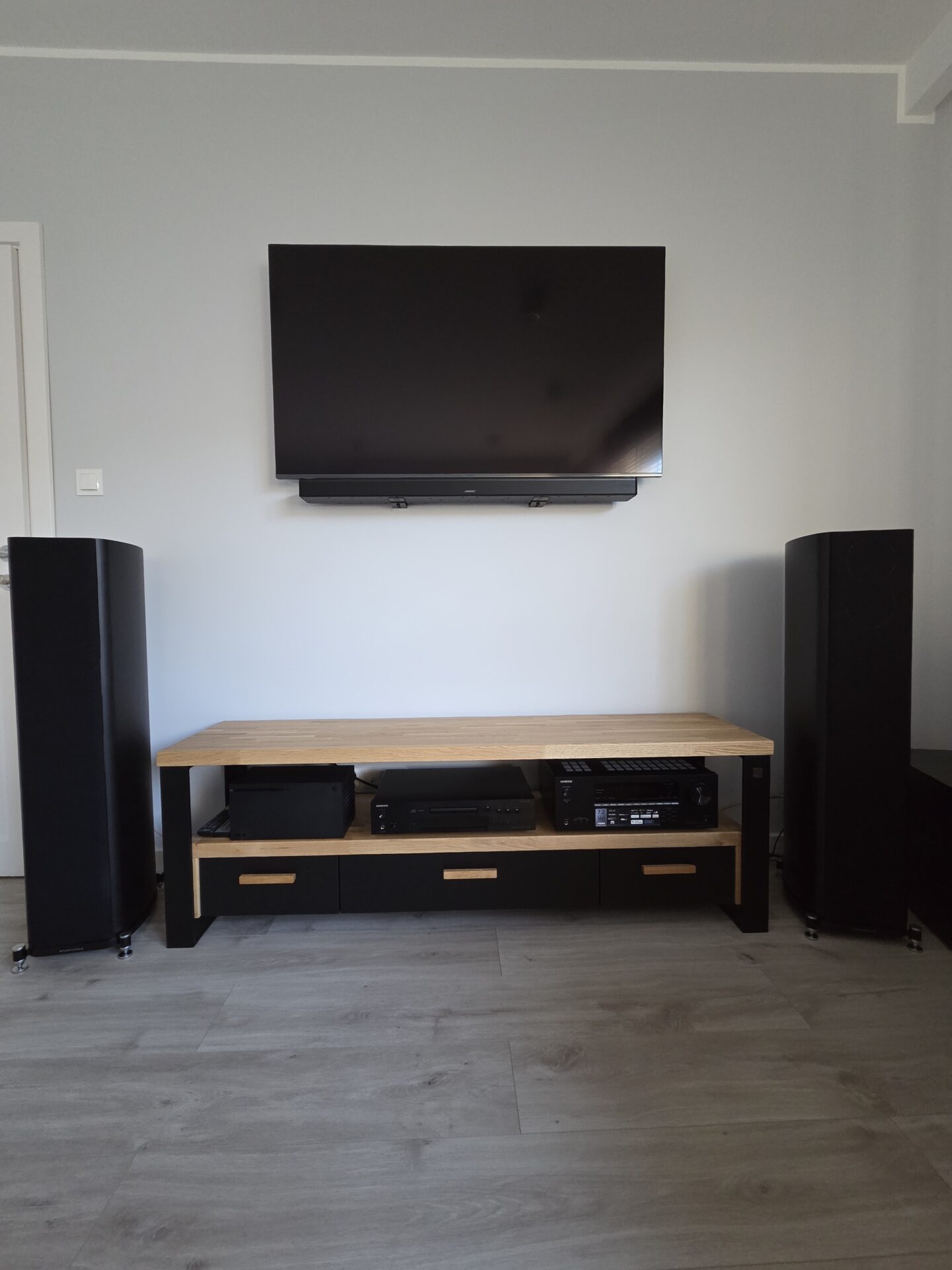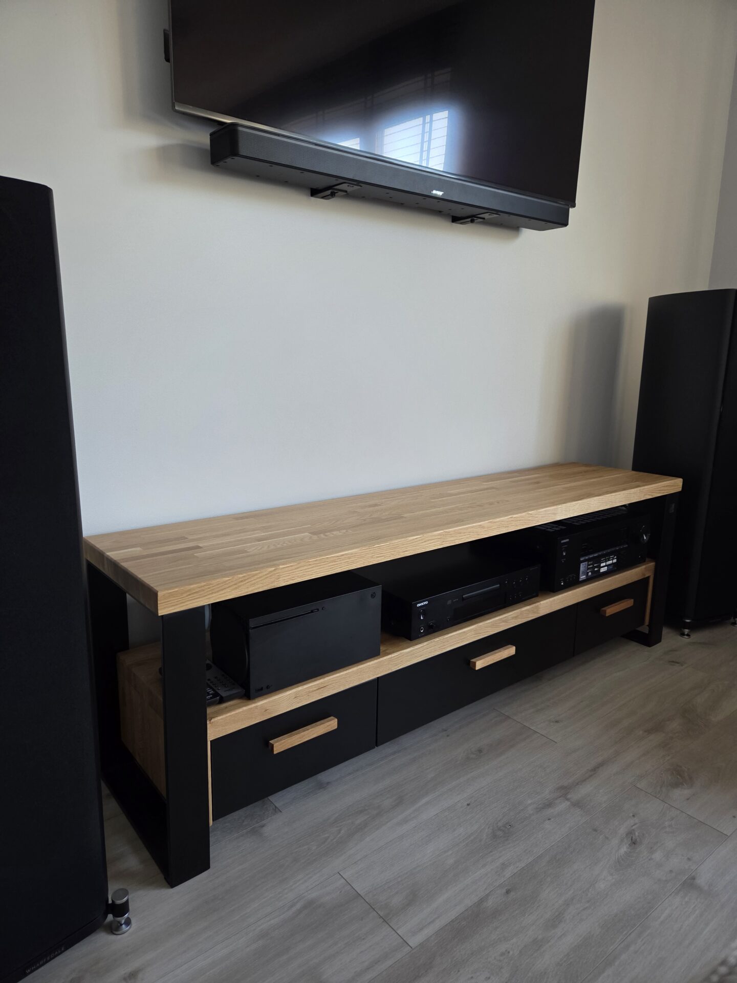Modern HiFi RTV cabinet made of a combination of wood and metal.