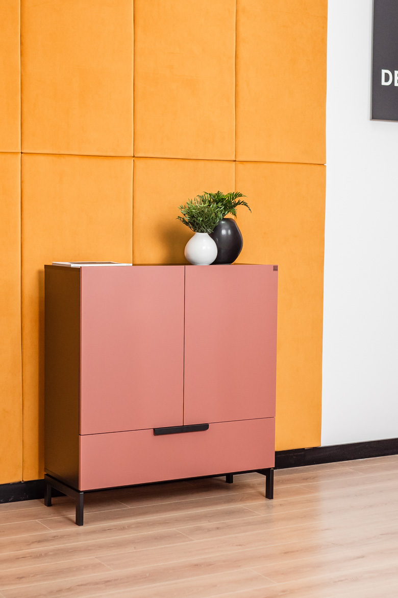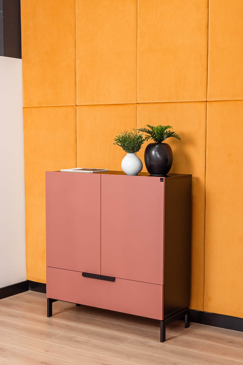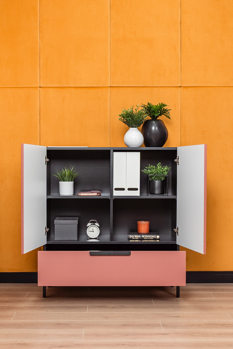 This chest of drawers is a practical solution that will bring not only elegance to your office, but also convenience in your daily work. A capacious drawer with a convenient handle will accommodate documents and accessories, so the most important things are always at hand. Behind the upper fronts are functional shelves – ideal for binders, office supplies or equipment, which gain their permanent place and do not take up space on the desk. A solid metal frame ensures durability and stability, while making the furniture look light and modern.