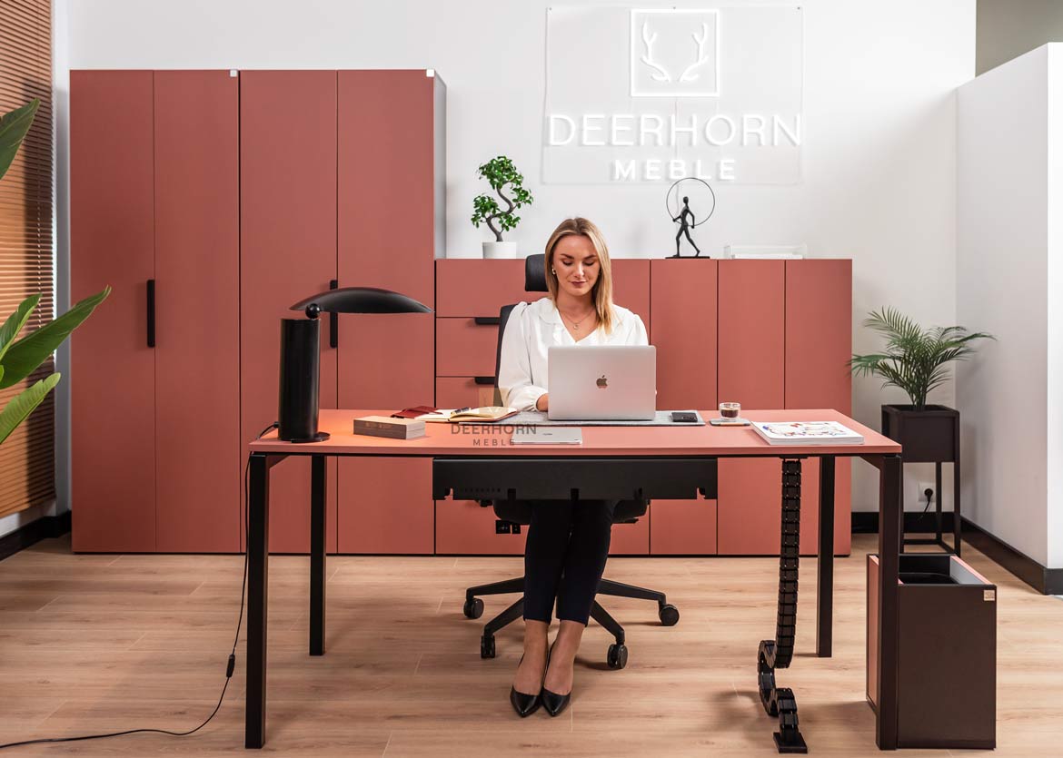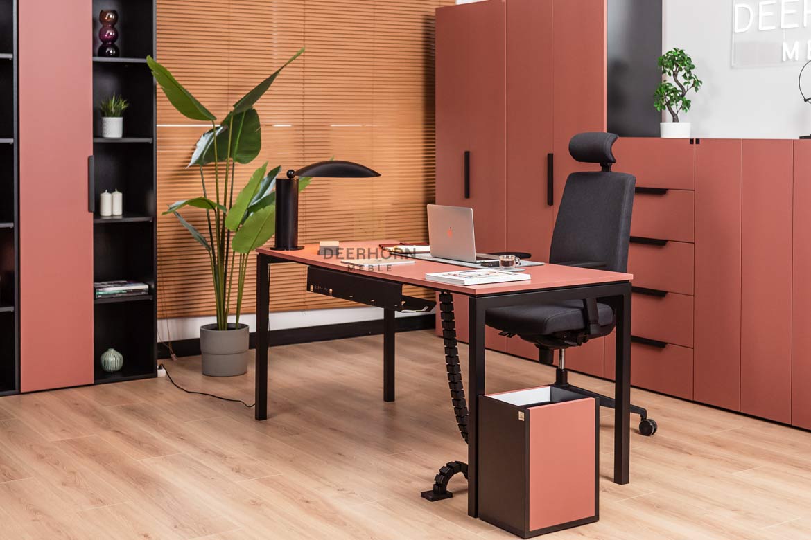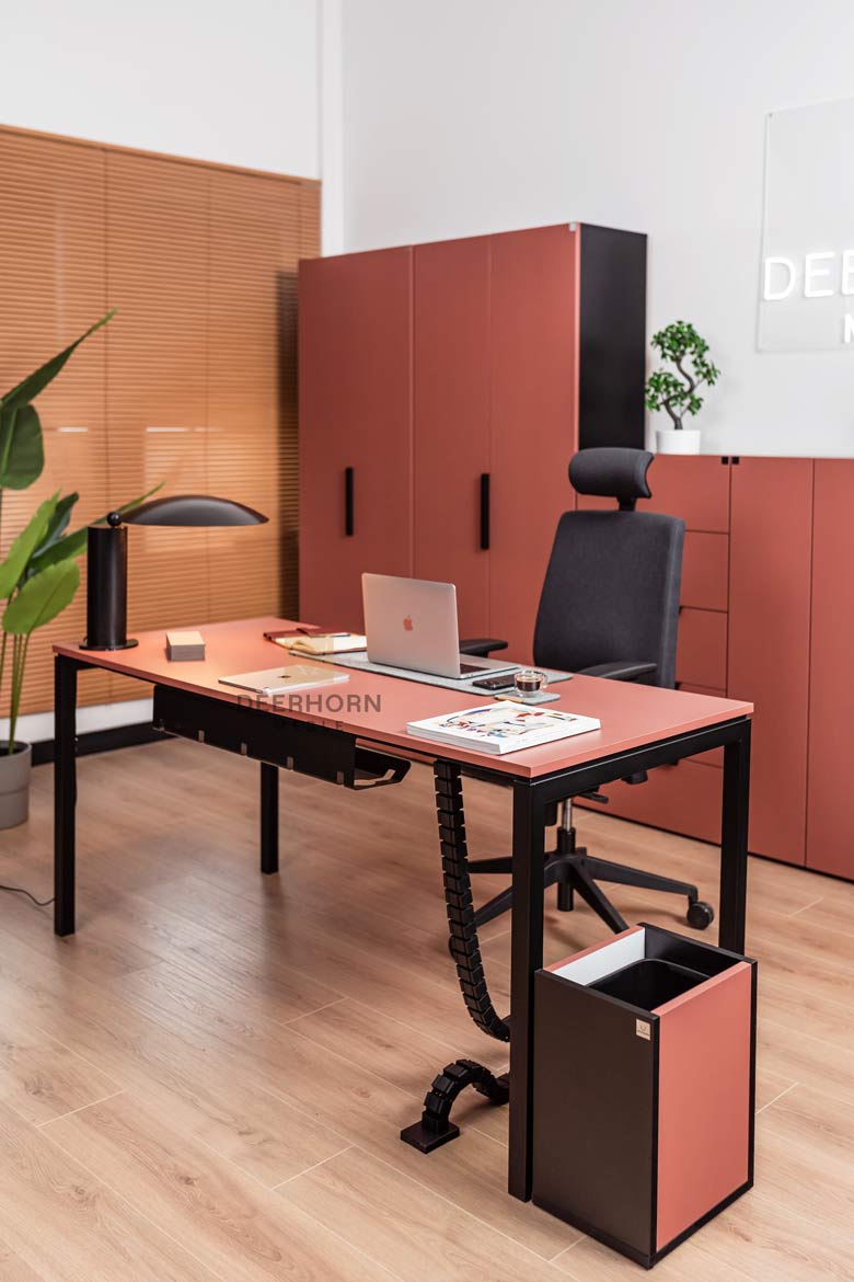 The desk from the Corporate collection was created with contemporary workspaces in mind. The brick-colored top gives the overall design a unique elegance, while the black steel construction guarantees stability and durability for years to come.