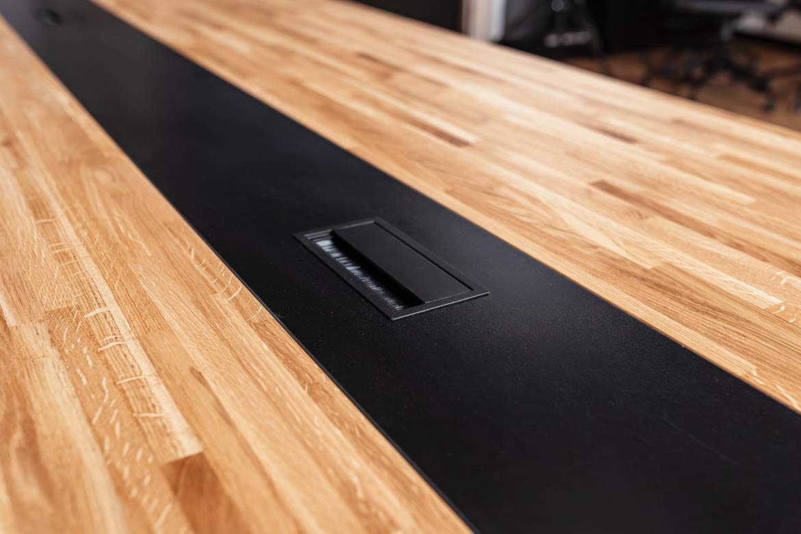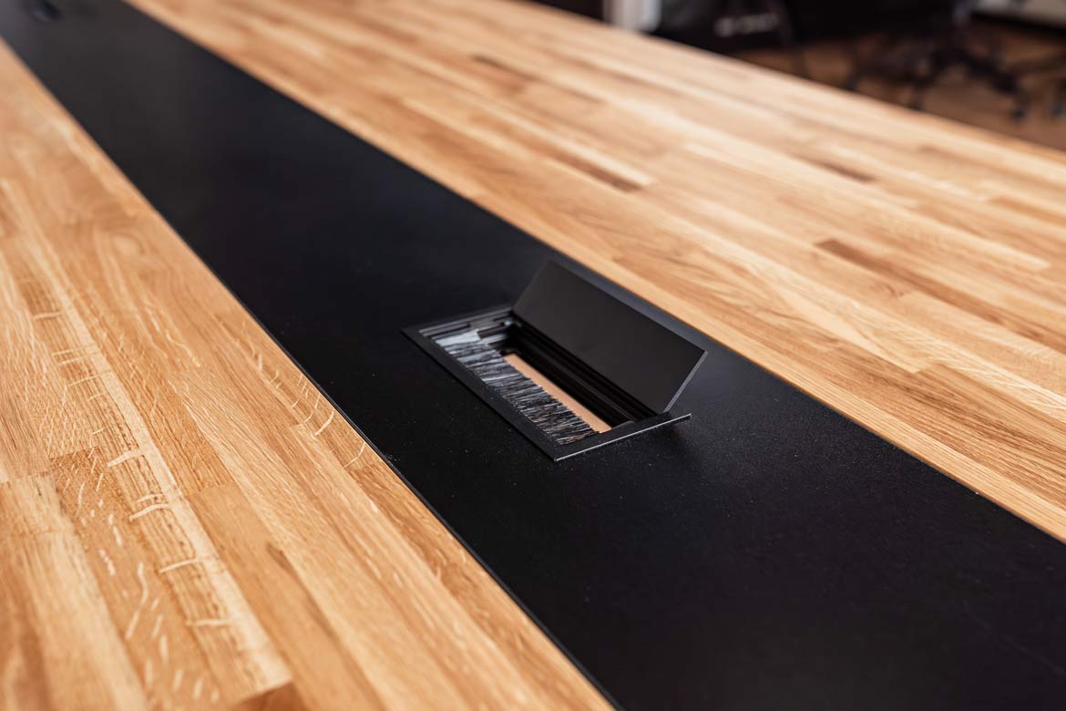 - The tabletop is equipped with two cable grommets of 160×80 mm (included in the price of the table). Size and location to be determined