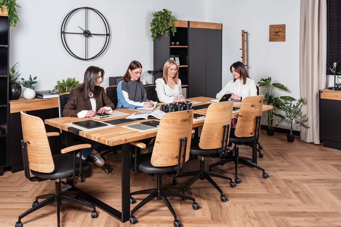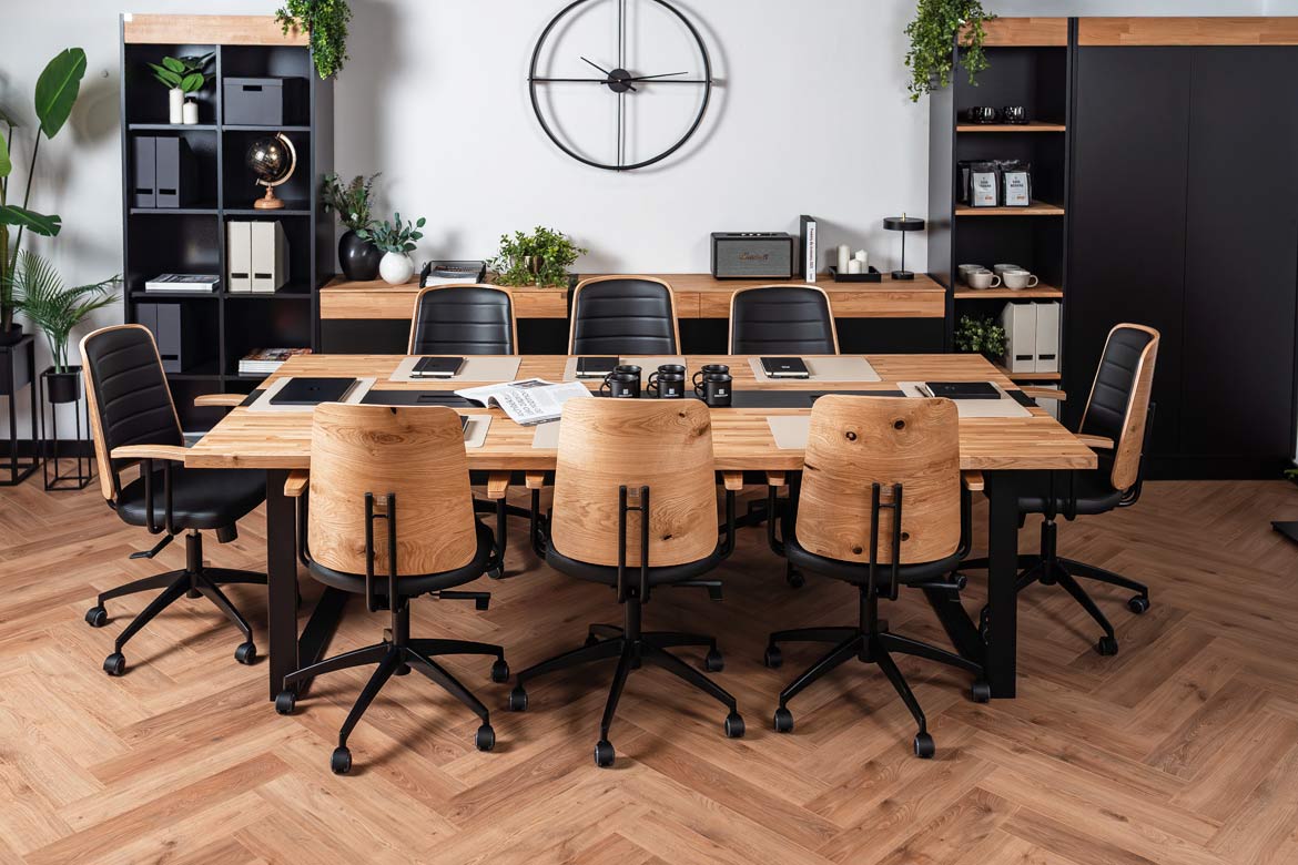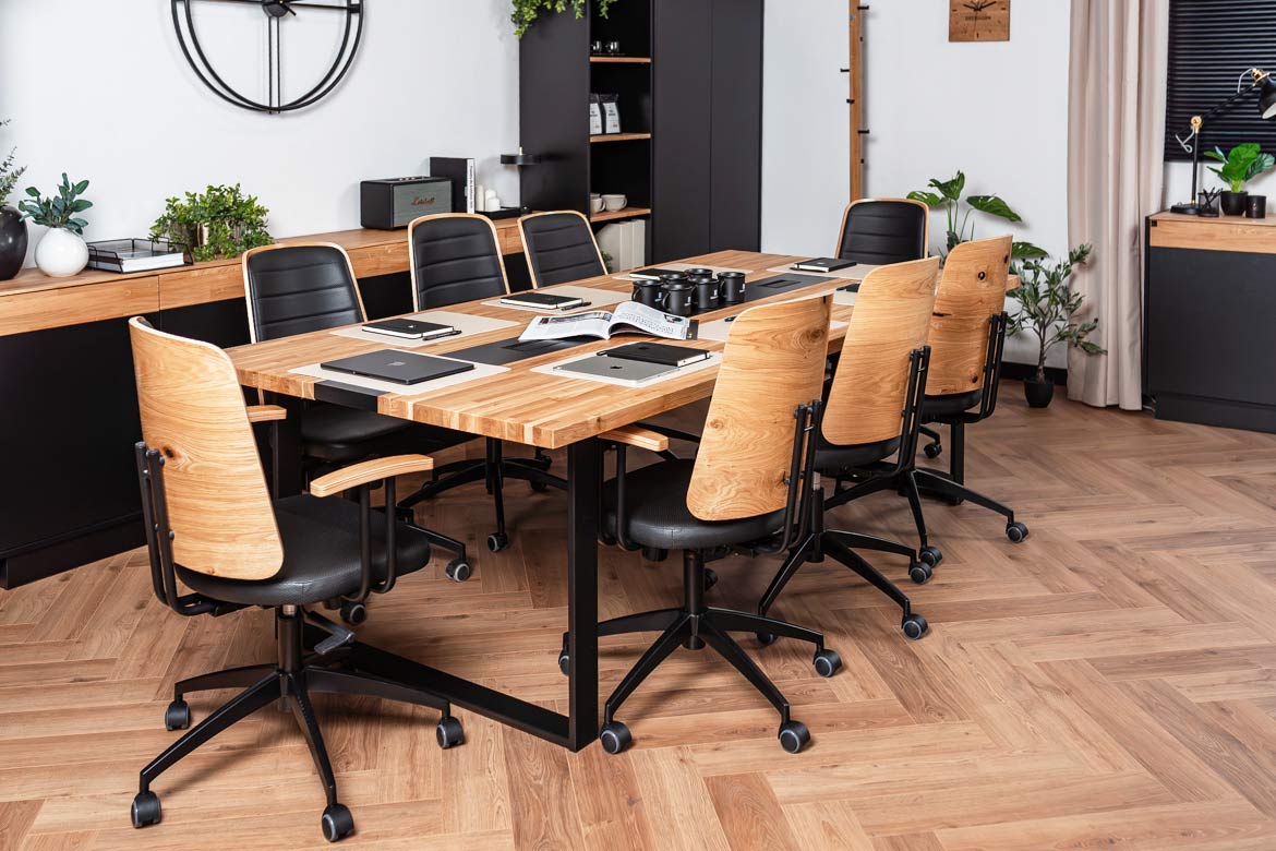 The 250×120 cm conference table combines modern design with functionality, offering a comfortable and spacious surface for teamwork or meetings. The solid wooden top is distinguished by its durability and aesthetic finish, which emphasizes the professional character of the interior.