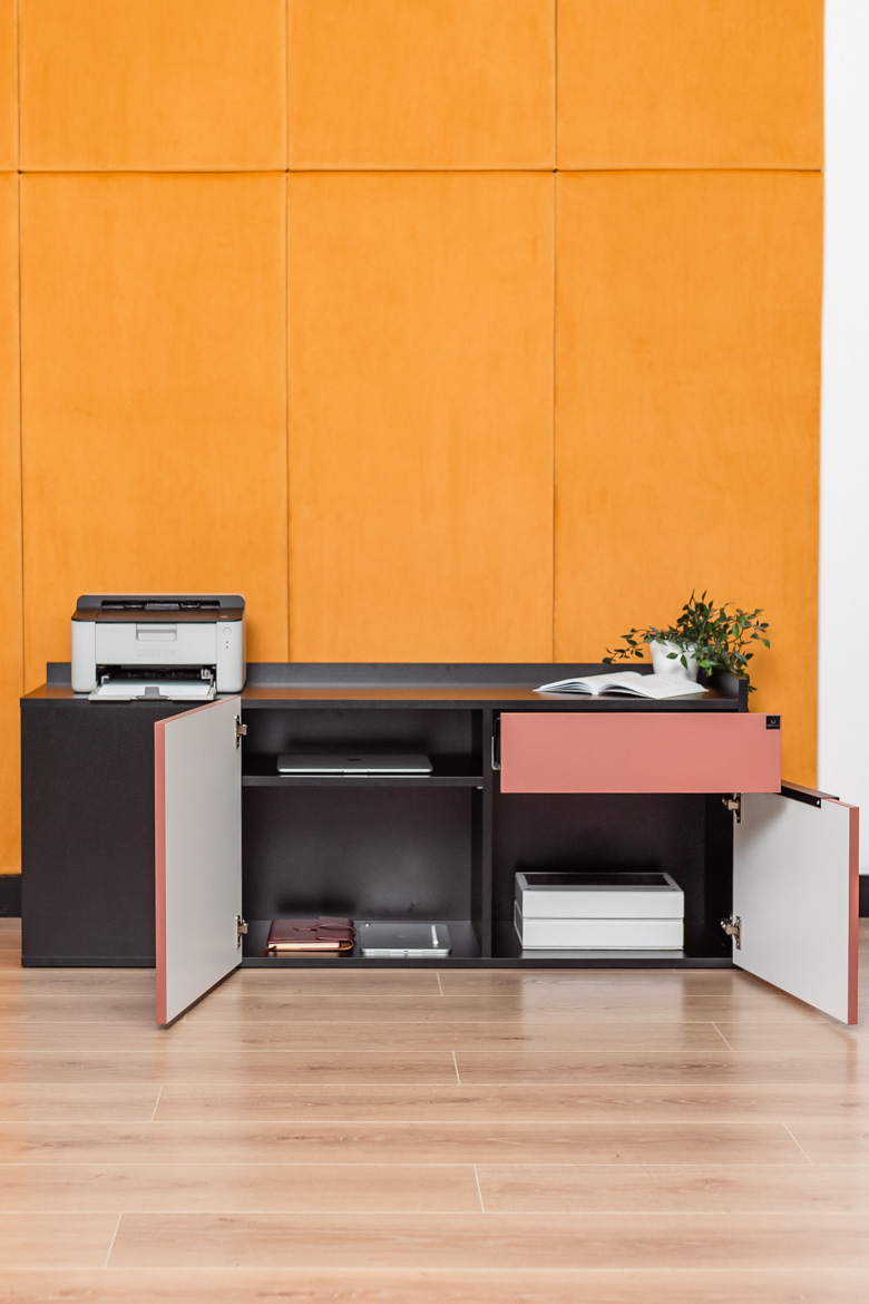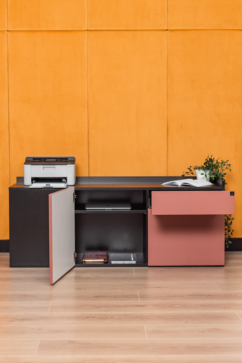 Integrated storage space – a drawer and lockable shelves – ensures that all documents and accessories have their place. This ensures that your countertop is always in order, and you get the comfort of working and more space for what matters most.