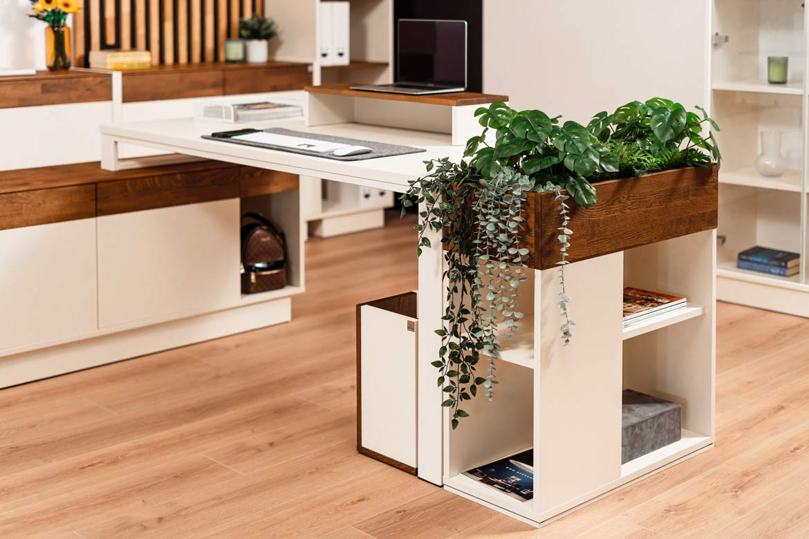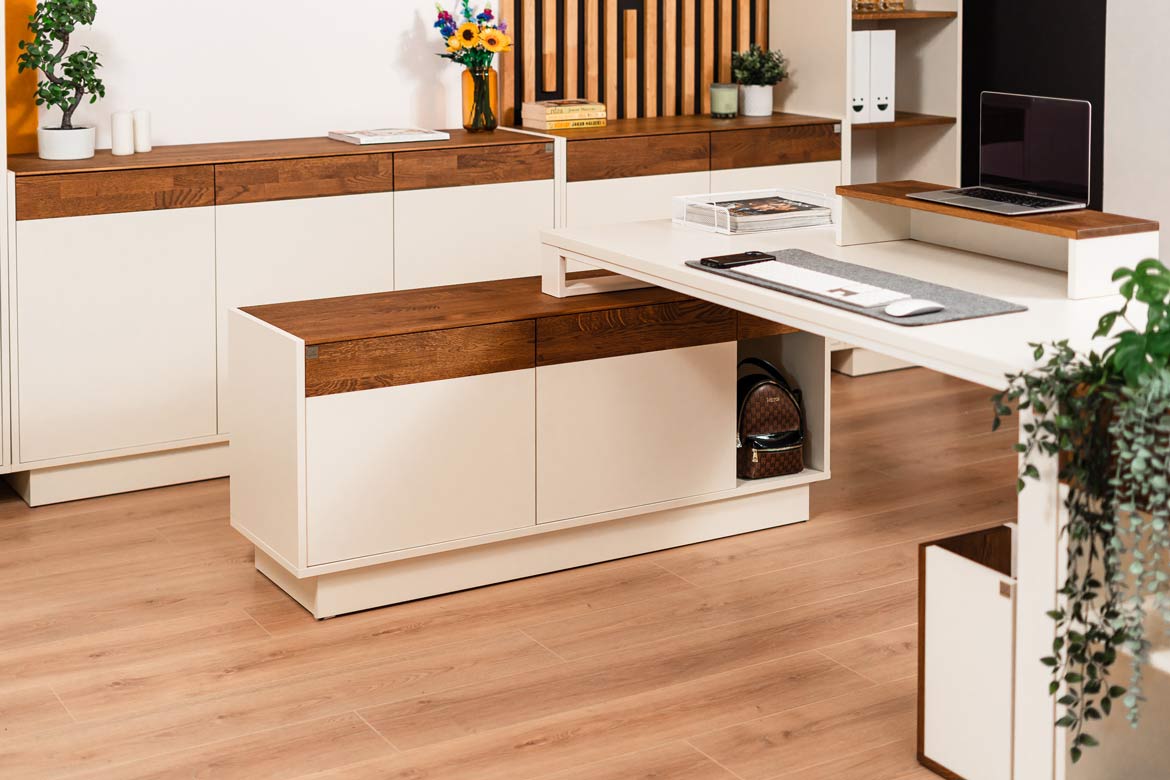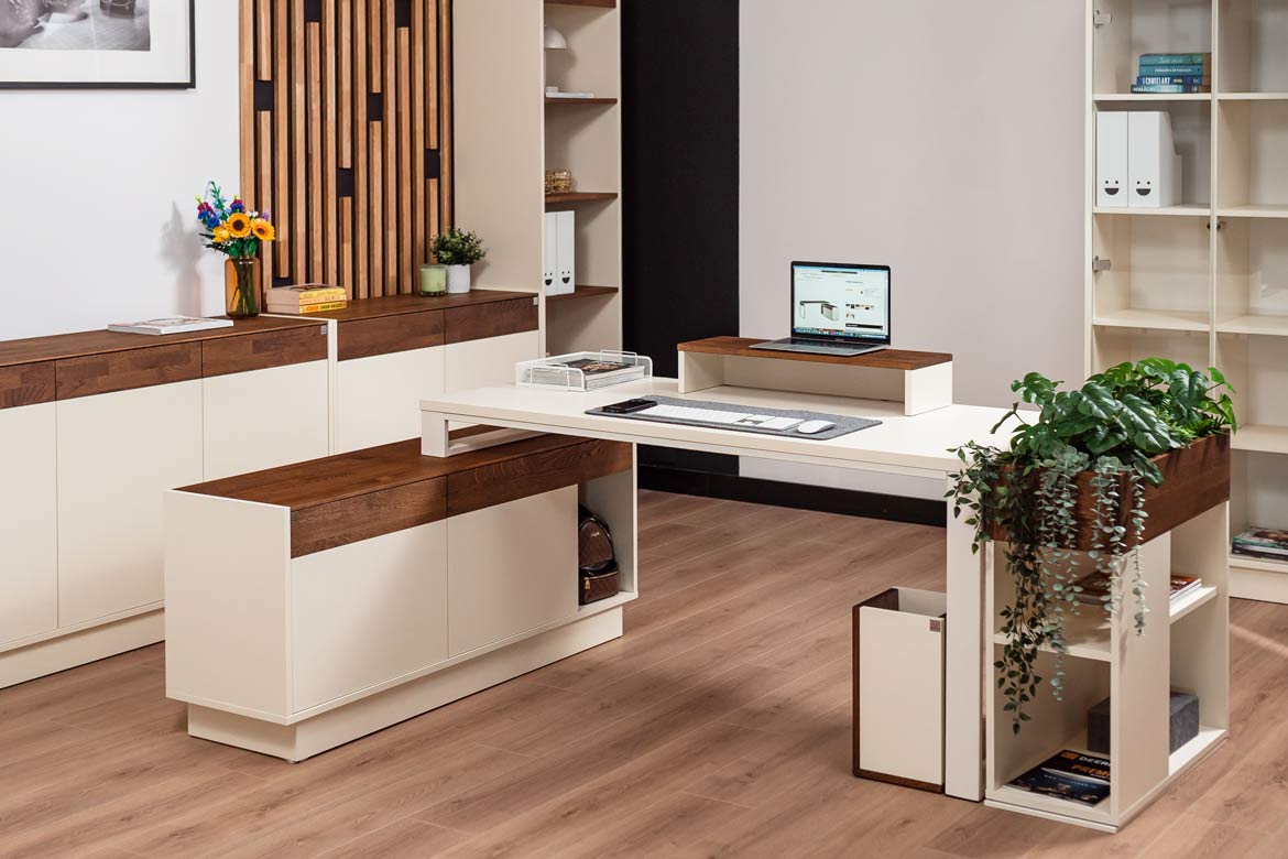 Corner desk in a unique color combination – delicate ivory combined with an elegant shade of Cuban Cigaro. Subtle lines, modern form and natural wood accents give it a prestigious and timeless character.