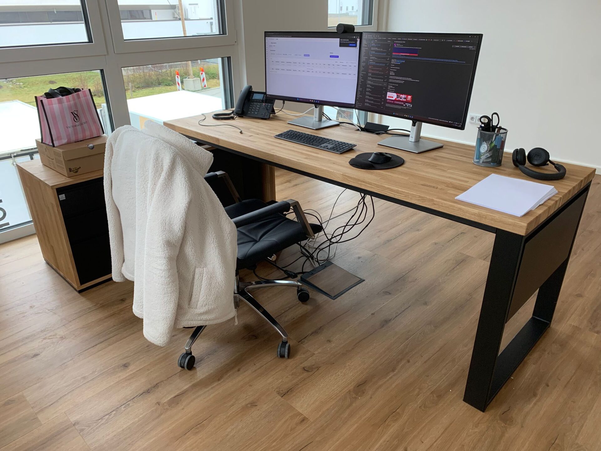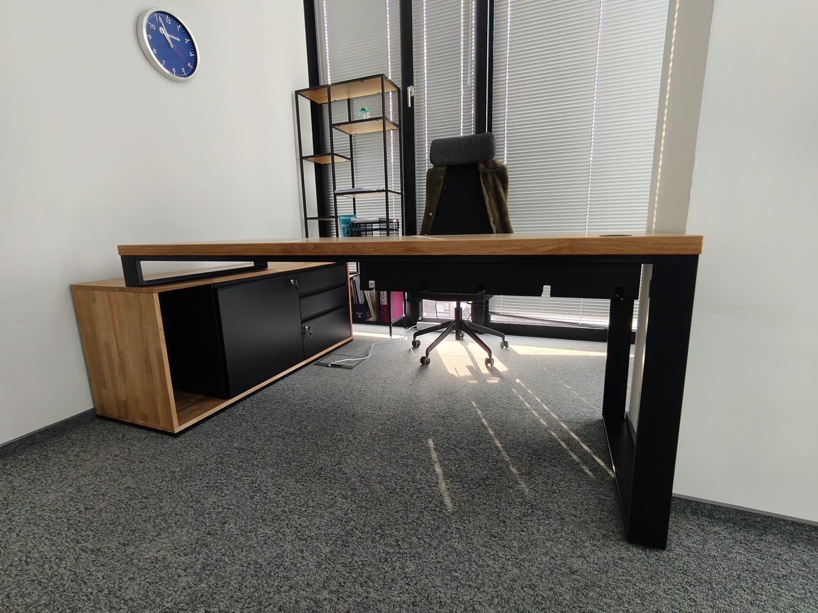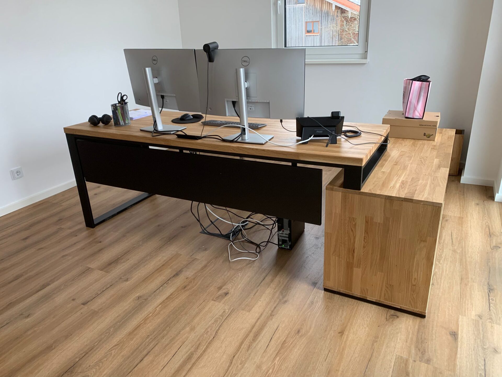 Made of natural solid oak wood and sturdy metal construction, the corner desk with pedestal is perfect for any designer office or study. The large wooden top was also properly protected by us in the process of oiling against stains from coffee or other drinks.