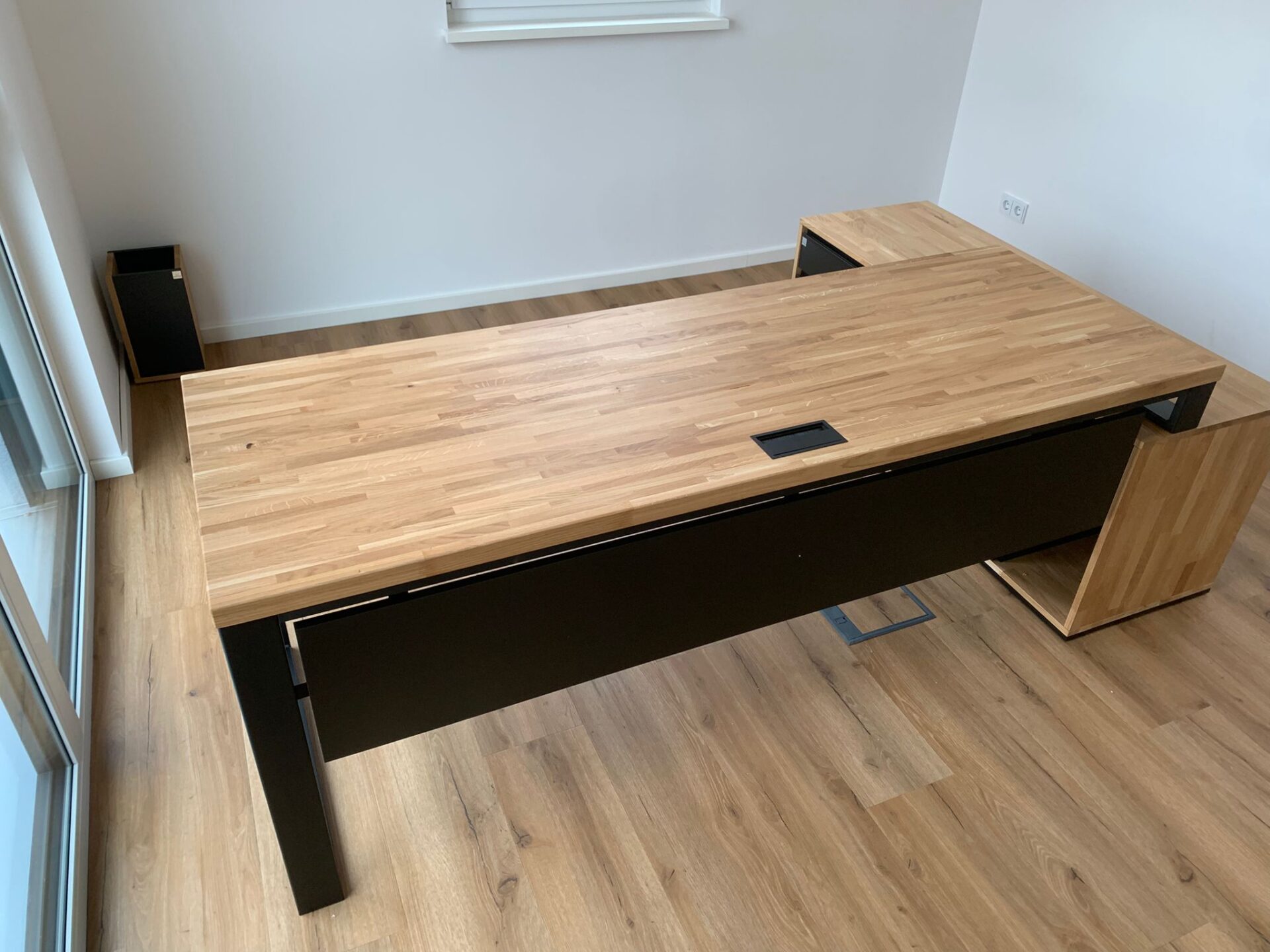 7. versatility – The pedestal relative to the desk can be rotated and even converted from a right-hand desk to a left-hand desk. This makes it easy to adapt the desk to the shape of the room. The pedestal can also be used as a printer cabinet