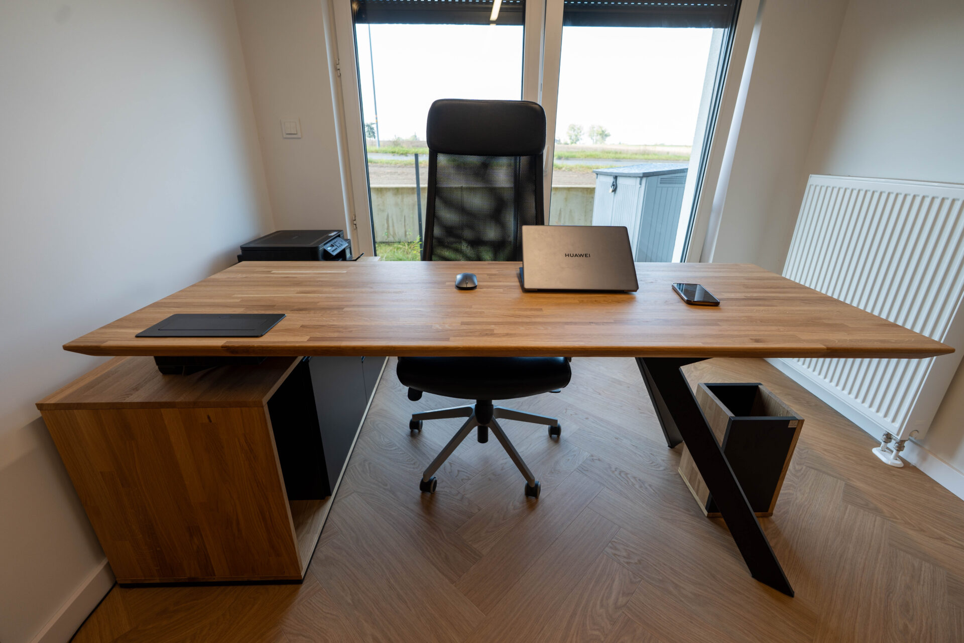 To biurko robi bardzo dobre wrażenie już od pierwszego spojrzenia. Połączenie naturalnego drewna z czarnymi elementami wygląda elegancko i profesjonalnie, idealnie do biura czy gabinetu. Duży blat daje komfort pracy, a całość jest solidna i stabilna – nic się nie rusza, wszystko ma swoje miejsce. Widać, że to mebel przemyślany i wykonany z dbałością o detale. Świetny wybór do pracy na co dzień.