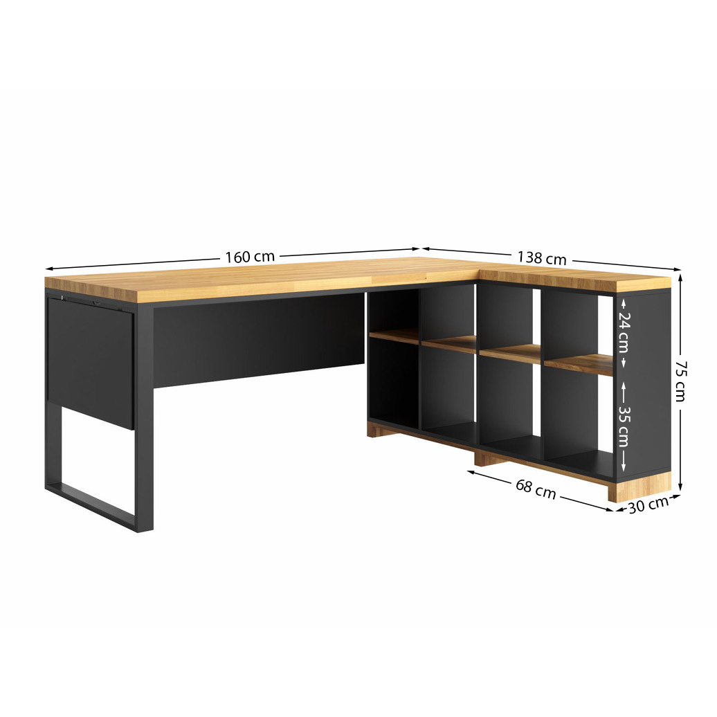 The corner desk is available in black and white. The shelves will accommodate not only binders but also many other items that you will always have at hand. Desk, is an important tool for work and study and its quality is largely determined by the material of construction. In this case, the entire top and shelves are natural oak wood. This gives incredible comfort of use and enjoyment of nature.