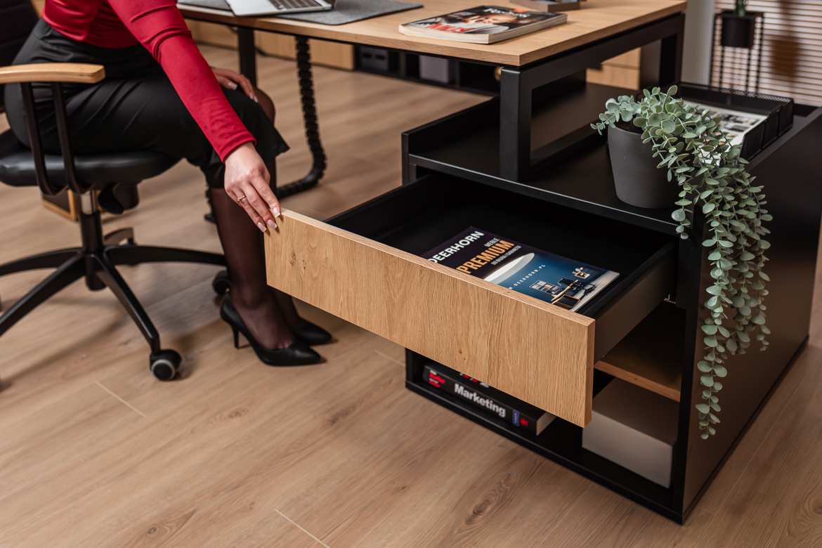 Modern desk with drawers in oak and black shade for office and home office