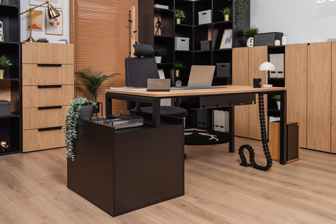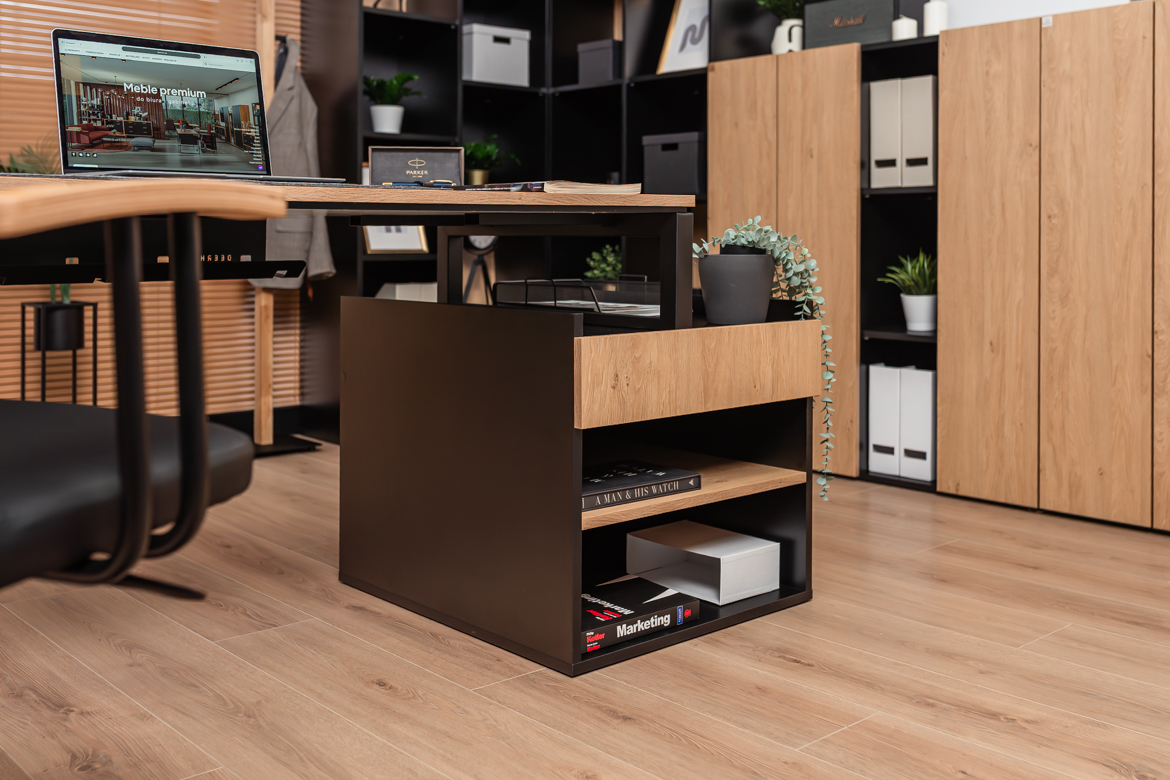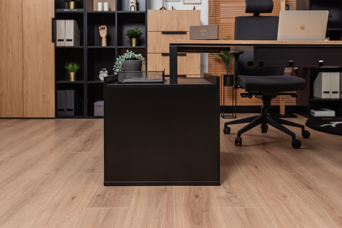 Desk with cabinet in elegant oak and black color scheme is a perfect solution for both small and large office spaces and home offices. The carefully designed structure provides comfort for work, while offering practical storage space for your most important documents and accessories. The solid top in a warm shade of wood creates a friendly environment for working at the computer or performing daily chores, while the black, stable base gives the piece a modern touch.