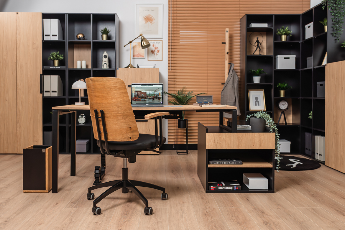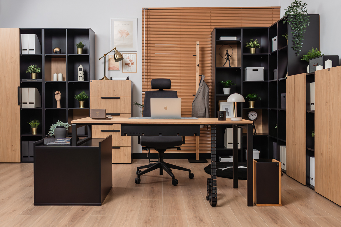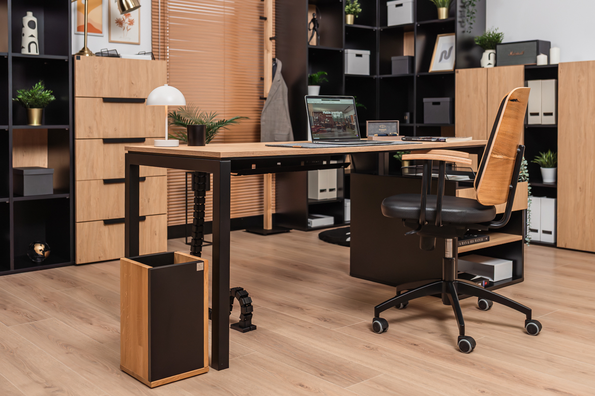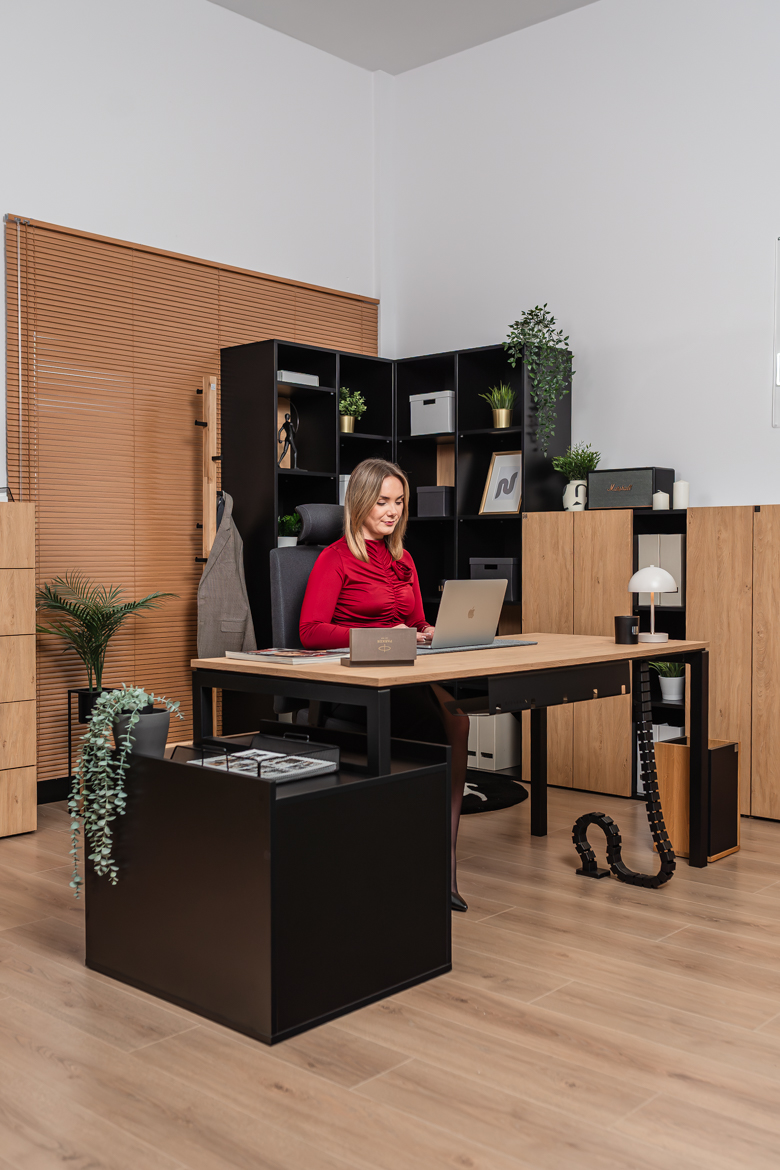 Desk with cabinet in elegant oak and black color scheme is a perfect solution for both small and large office spaces and home offices. The carefully designed structure provides comfort for work, while offering practical storage space for your most important documents and accessories. The solid top in a warm shade of wood creates a friendly environment for working at the computer or performing daily chores, while the black, stable base gives the piece a modern touch.