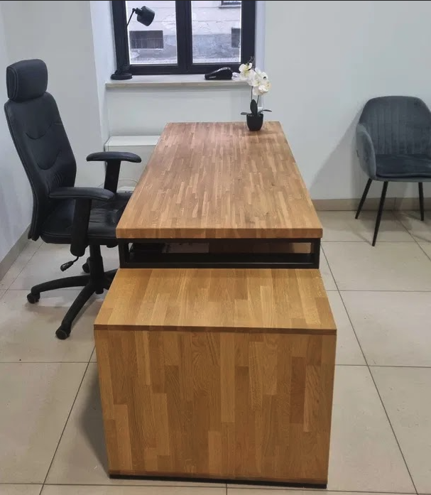 Cabinet desk with monitor extension, is an exceptionally solidly made piece of furniture with the best materials. The top is made of oak wood, as is the body of the container. The drawer handles are aluminum, and the legs are powder-coated steel. The desk comes in a version with the pedestal on the right or left side.