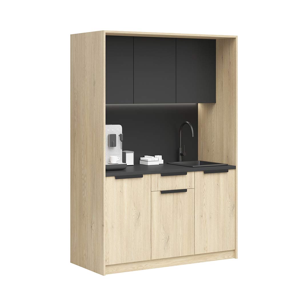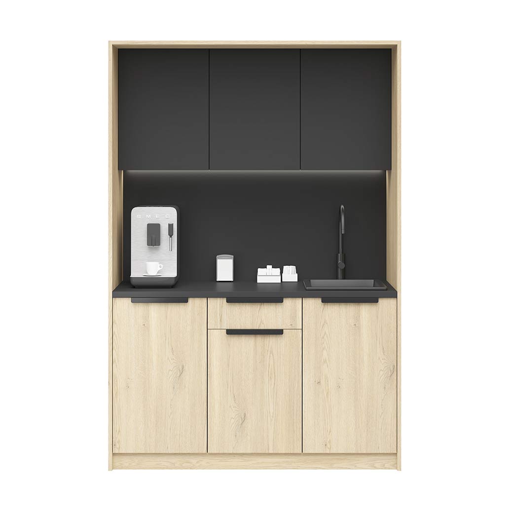 The Corporate kitchenette is a combination of elegance and practicality. Capacious cabinets allow you to conveniently store dishes and office accessories, while the wide worktop and integrated sink make everyday use easier.
