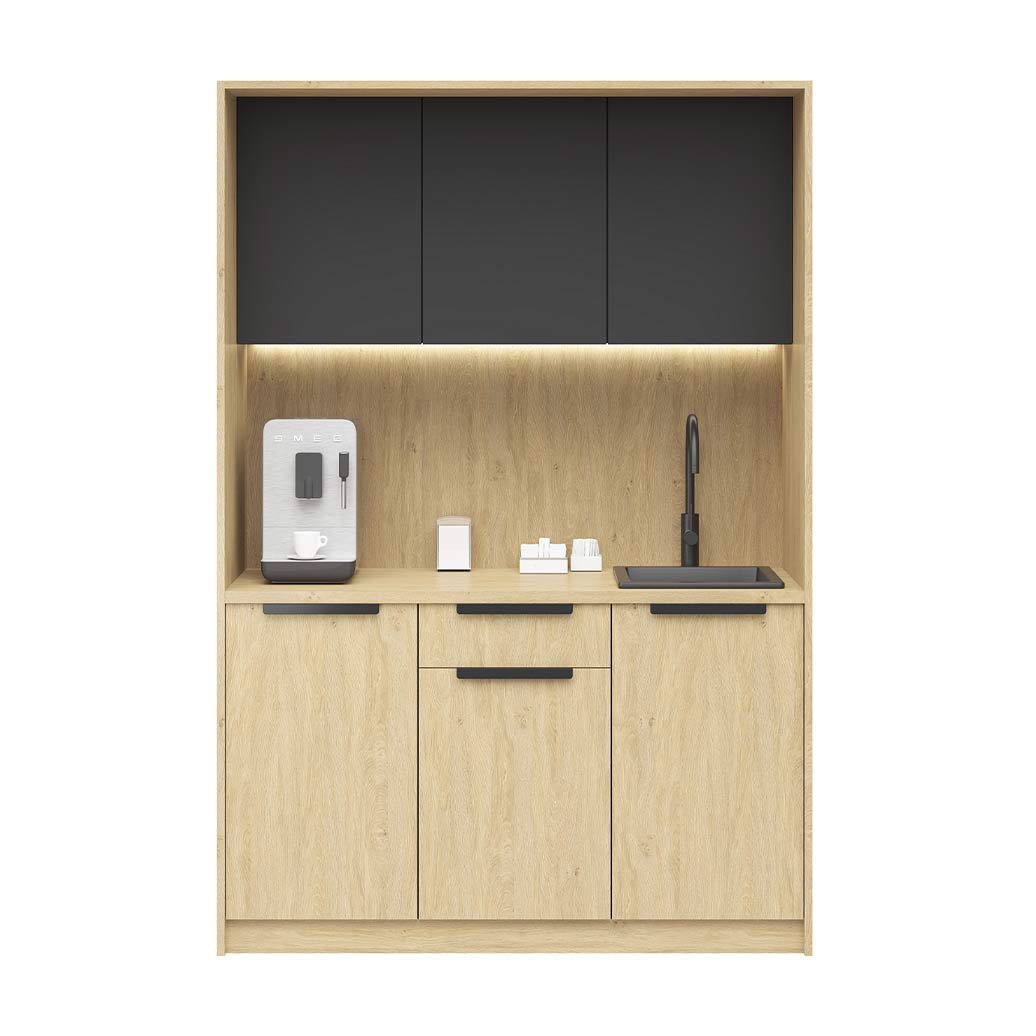 A kitchen set for the office with a dedicated space for a coffee machine is the ideal solution for companies that want to provide employees with a comfortable and aesthetically pleasing space for preparing drinks. The compact set combines functionality with modern design – upper cabinets in matte black and lower fronts in natural wood create an attractive, professional look. The thoughtful layout of the cabinets allows for convenient storage of coffees, cups and accessories, while the countertop offers adequate space for the coffee machine and beverage preparation work.
