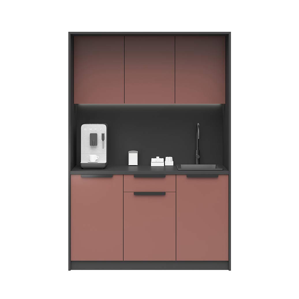 The kitchenette from the Corporate collection is an ideal solution for modern office spaces, relaxation areas and social annexes. Its minimalist form and refined details combine aesthetics with practicality, creating a convenient place to quickly prepare coffee or a snack during the working day.