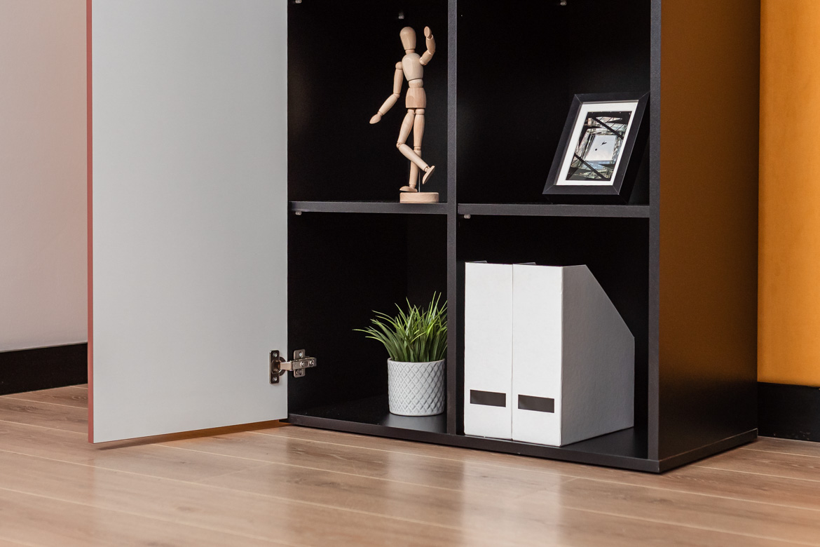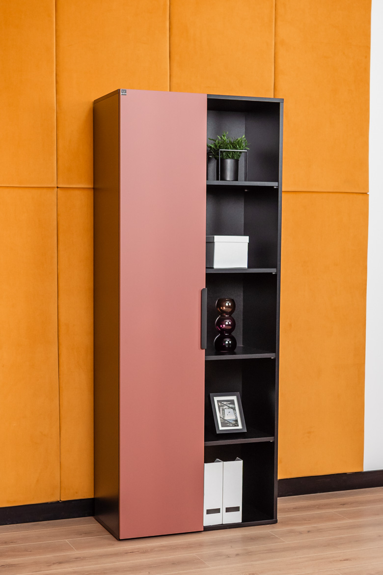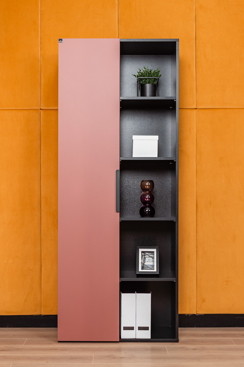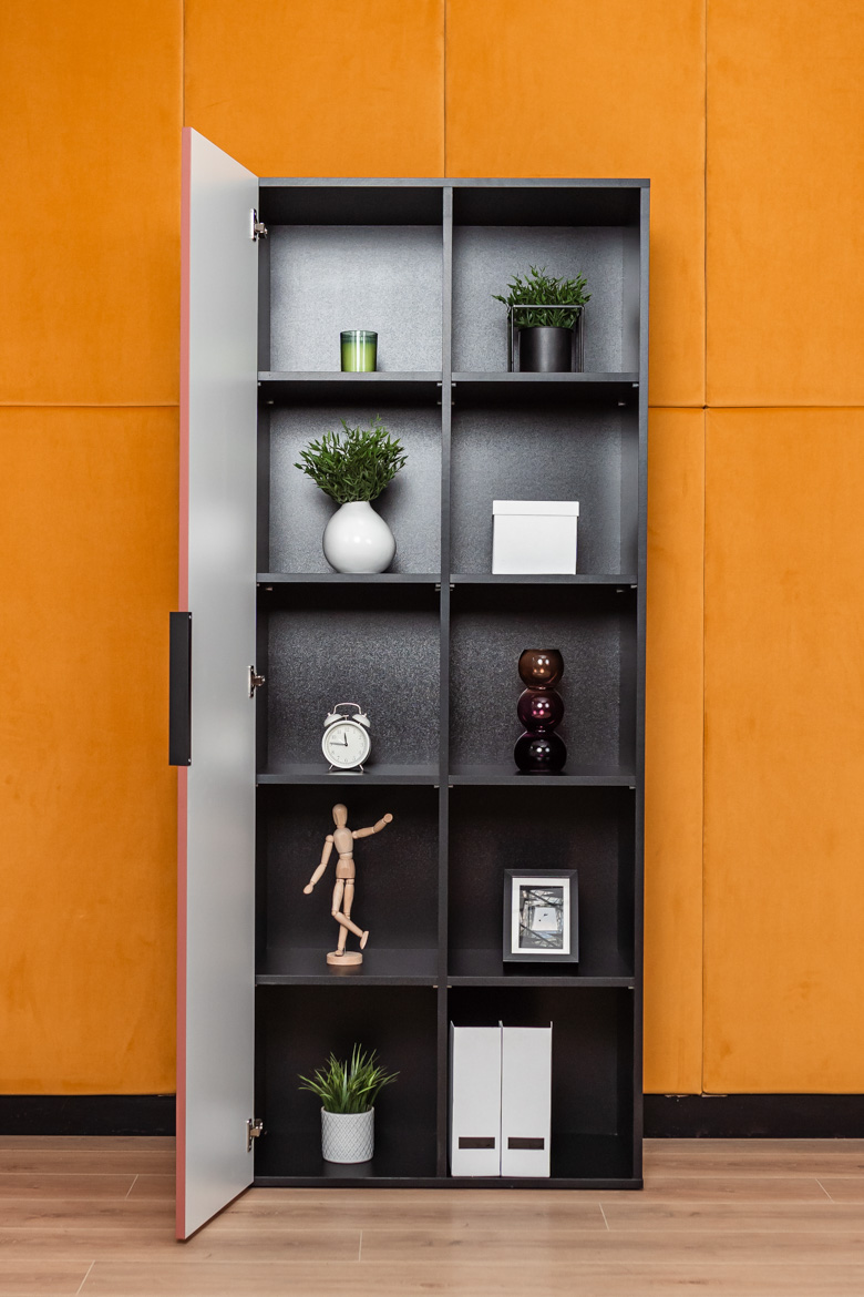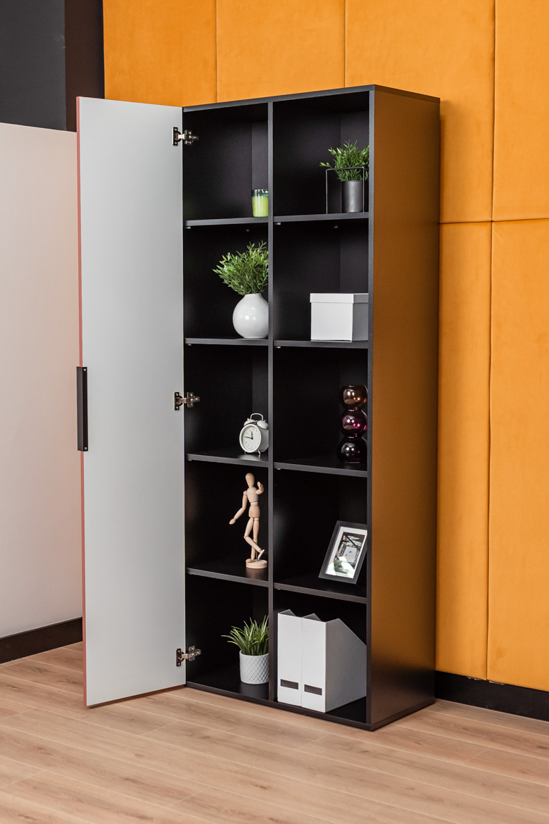 Bookcase with a width of 80 cm with one full door, behind which there are shelves for storing documents and office supplies.