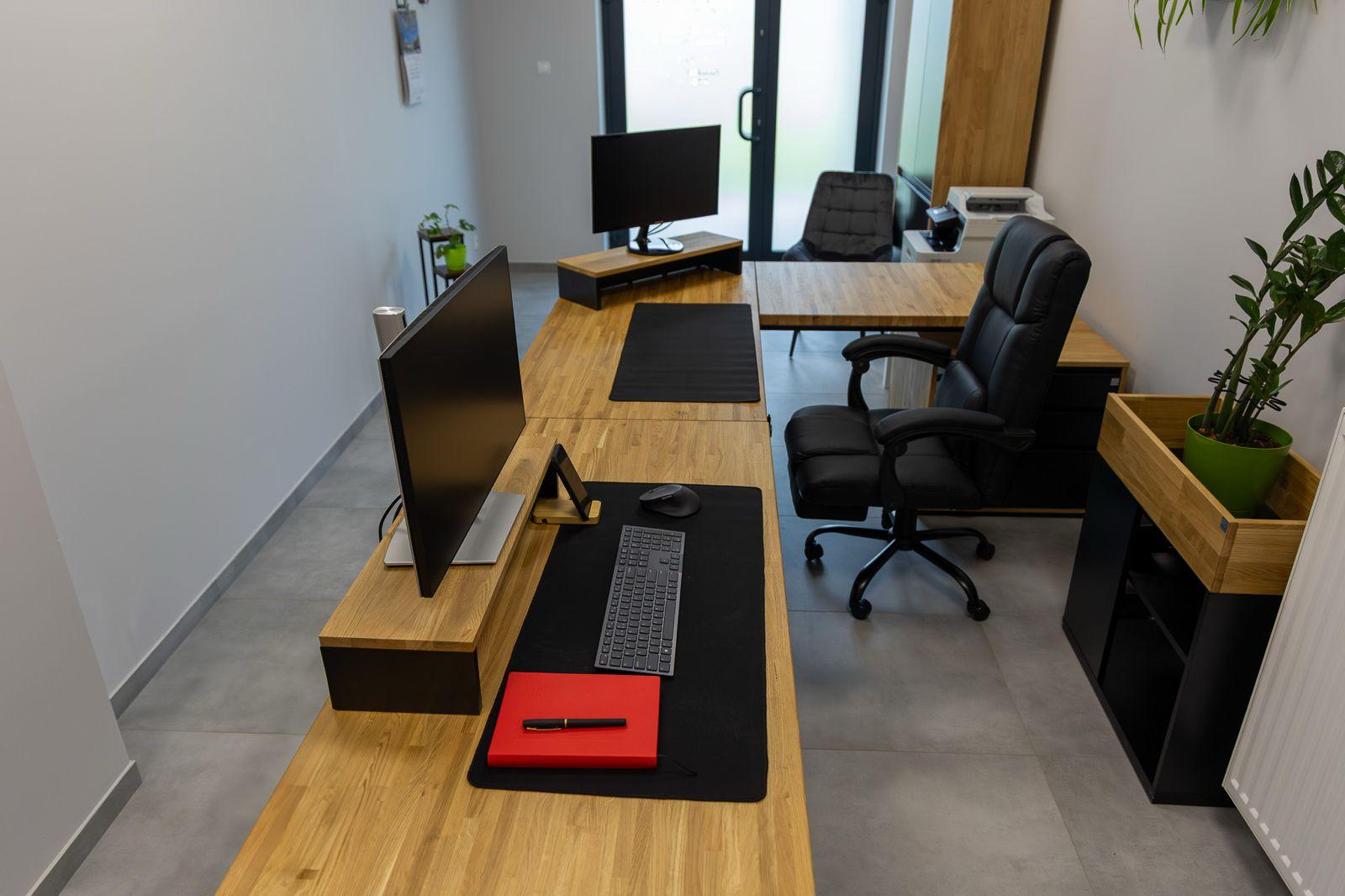 • The desk has masking blanks made of furniture board in matte black color. We can make an 18mm thick oak blend