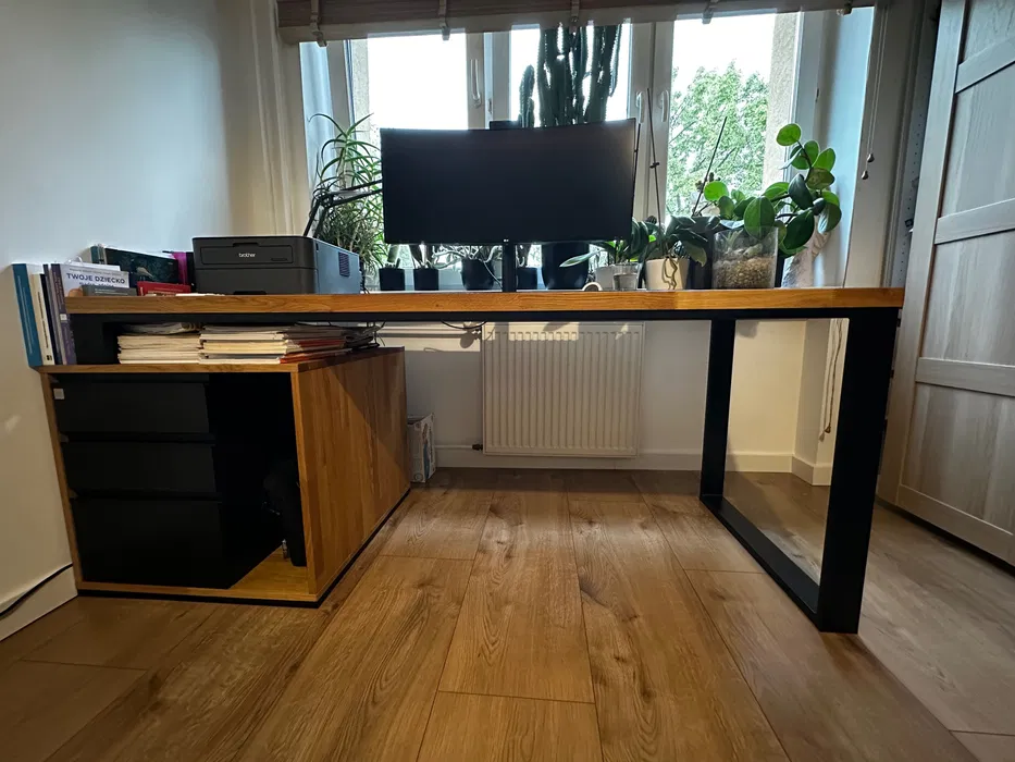 Office desk is a combination of elegance, functionality and robustness. Its modern design enhanced with an oak top gives the room a unique character. High-quality raw materials used in the production of the furniture create a remarkable whole. Thanks to the use of raw oak wood, any interior that has our modern office desk gets a warm and cozy atmosphere in which you just want to work. Natural solid oak wood and a stable metal frame are a guarantee of quality, durability and stability for many years.