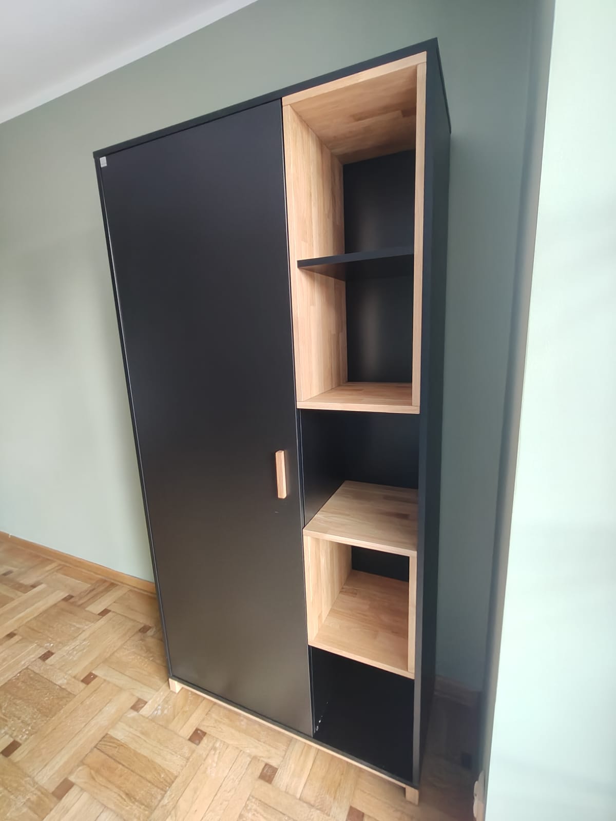 The wardrobe has a very modern look, is solidly built, features a practical combination of closed compartments and open shelves, offers plenty of storage space, yet doesn’t overwhelm the room, and works great for everyday use
