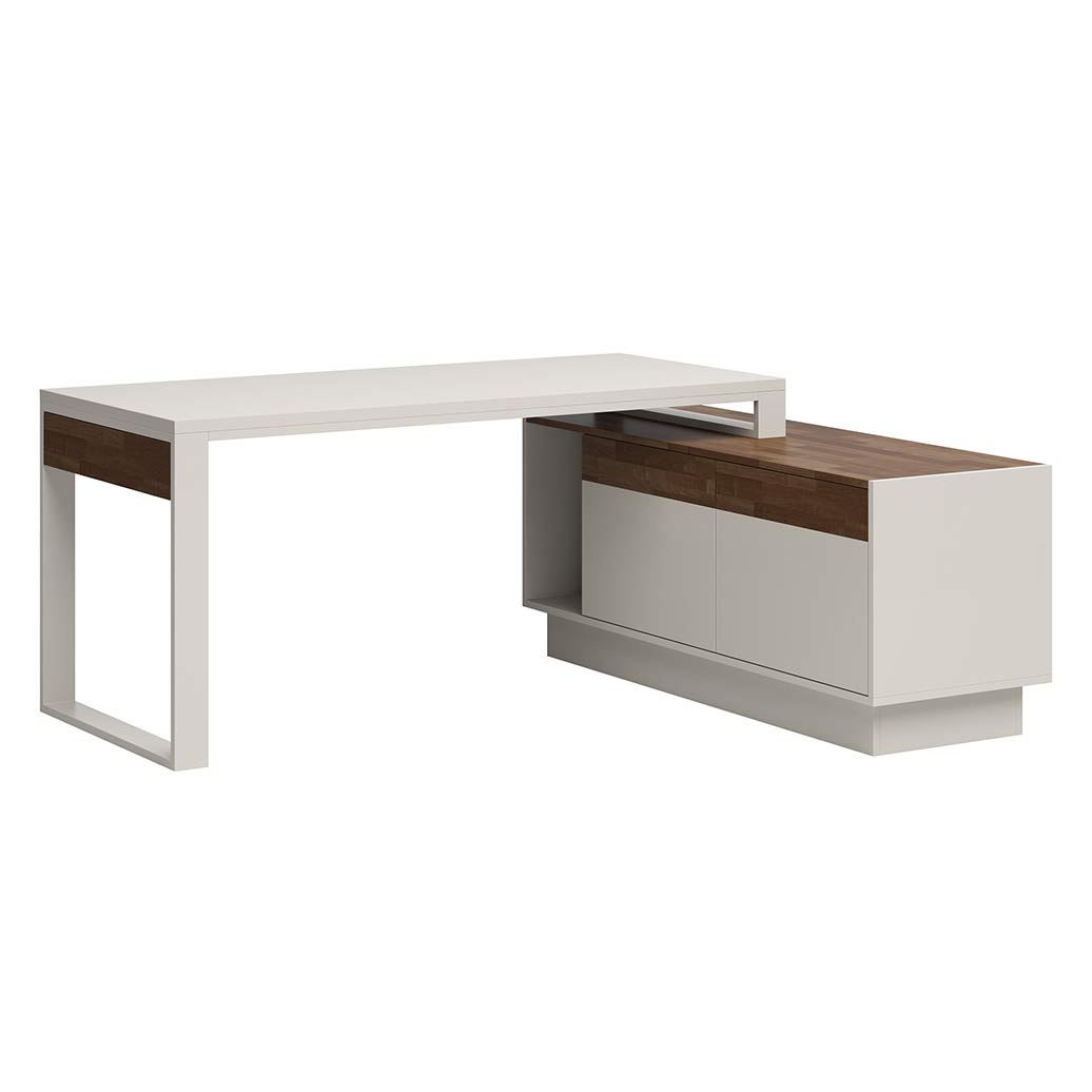 A modern corner desk with a light yet sturdy design. The top and frame in an elegant shade of ivory create a bright, cohesive whole. Solid cuban cigaro wood inserts in the pedestal give the furniture depth and natural expression.