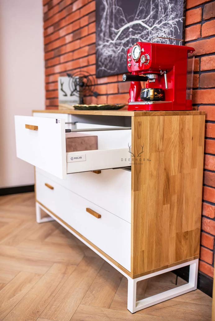 The character of the furniture is also emphasized by the fronts. Two colors were juxtaposed: natural wood and black, which are in keeping with its unique style.