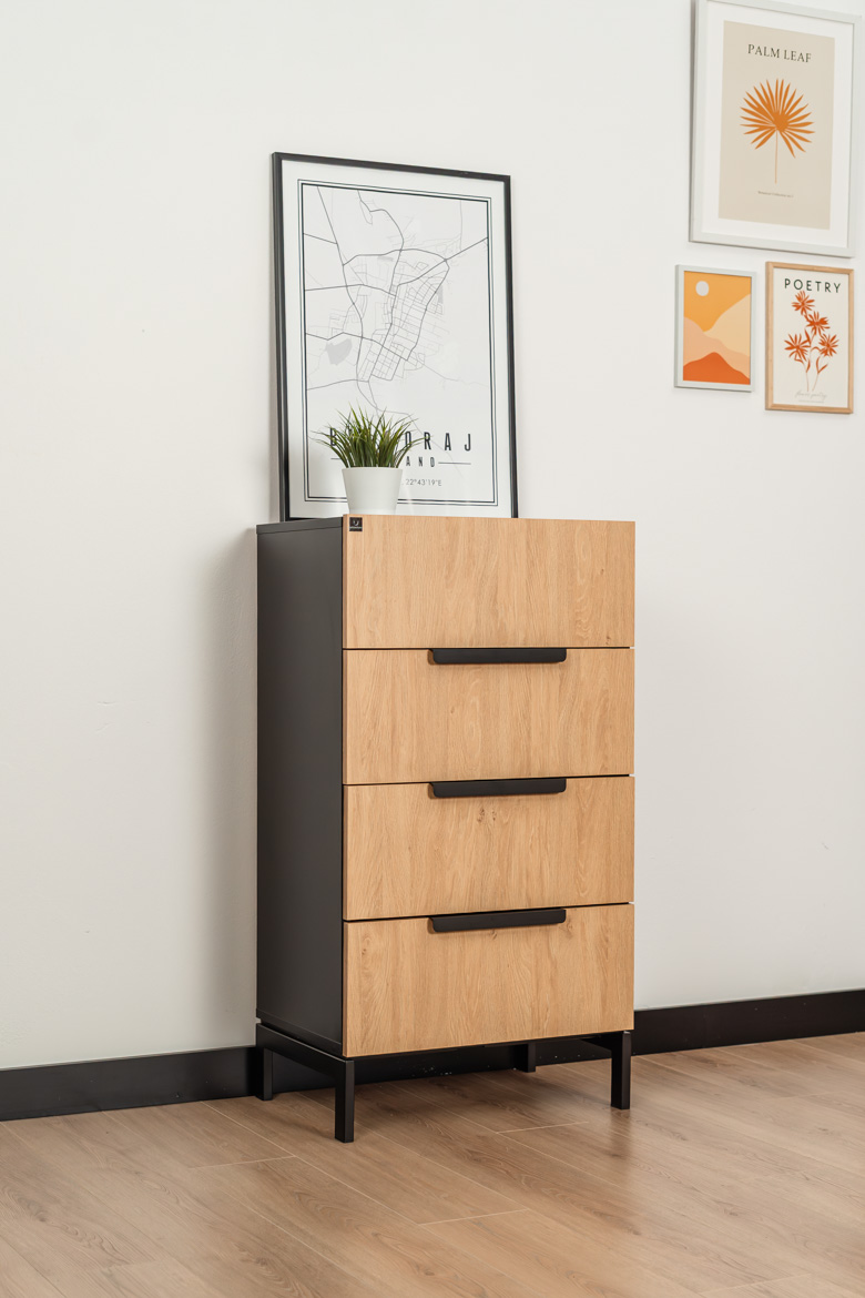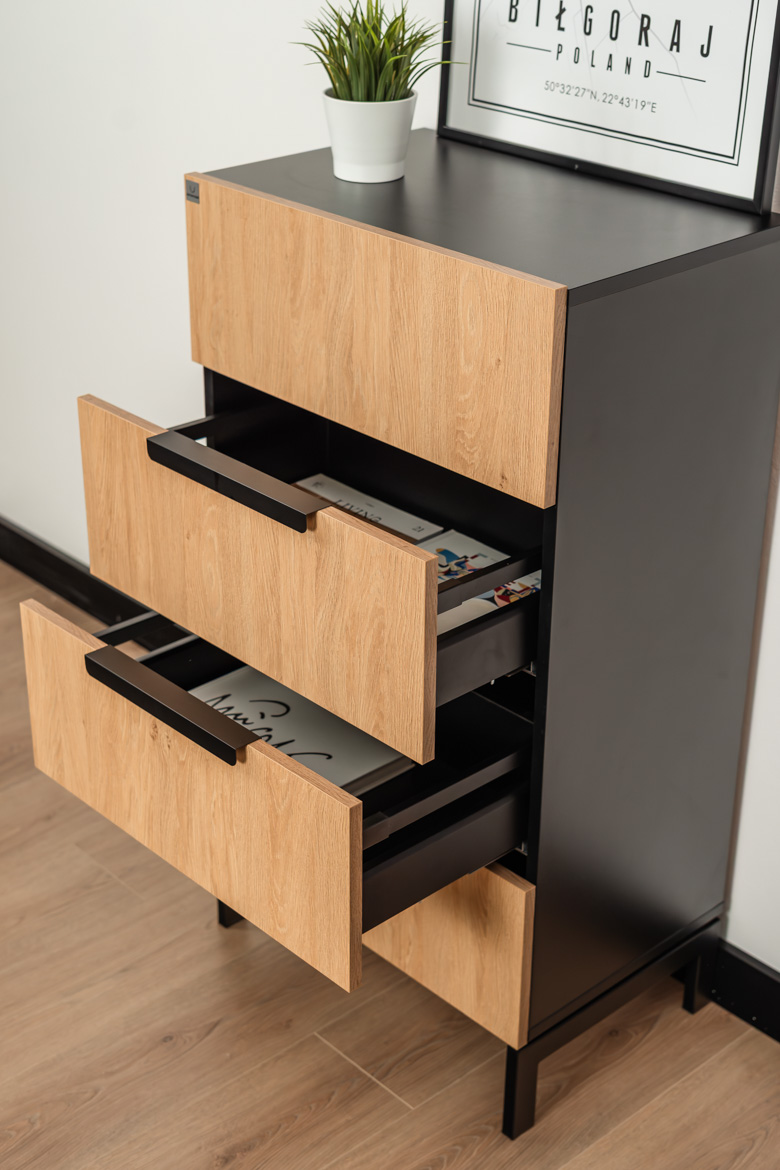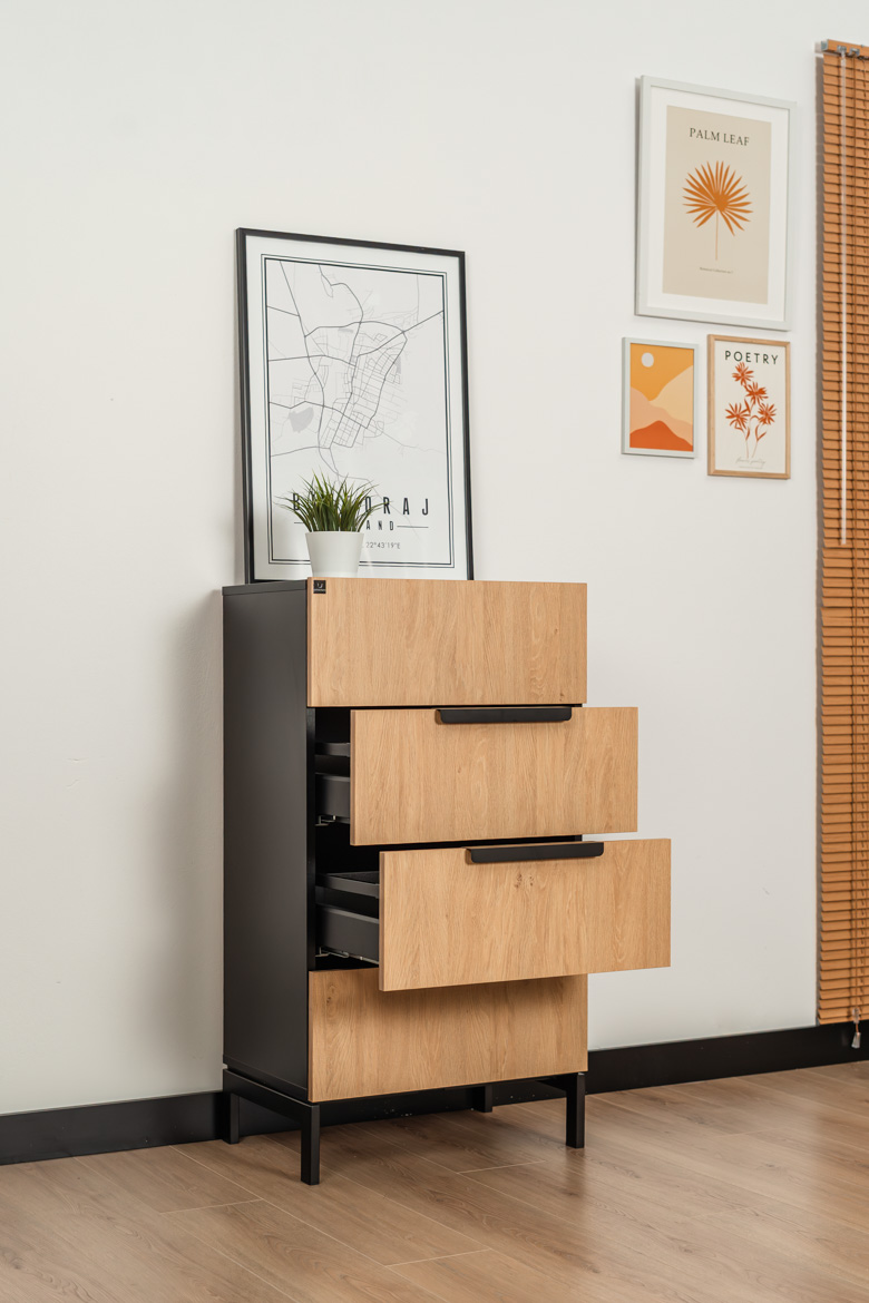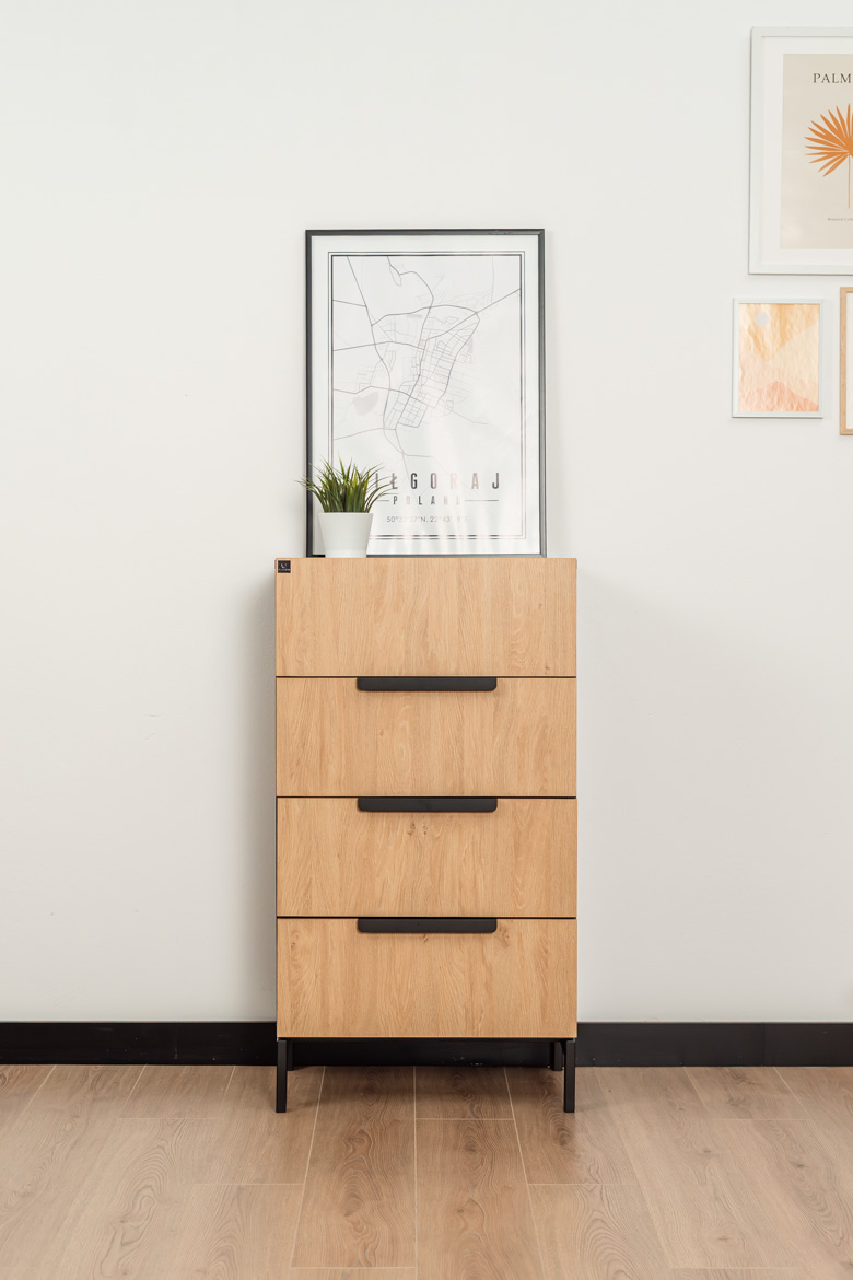 This slim chest of drawers with 4 capacious drawers is an ideal solution for those who need functional and aesthetic storage in a limited space. Stable construction, modern combination of oak-colored fronts with black elements and high metal legs give the furniture a light and modern character. The chest of drawers provides convenient organization of documents, accessories and small items, and at the same time fits perfectly into modern, industrial and minimalist interior designs. Thanks to its compact form, it easily fits into smaller rooms, without losing capacity and functionality.