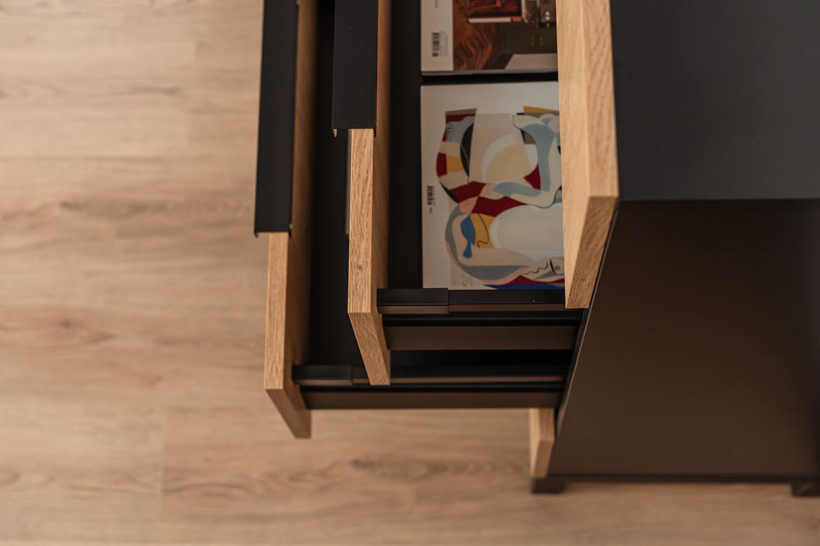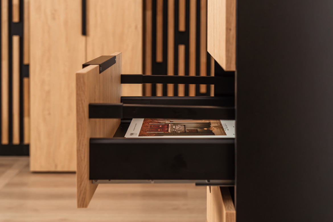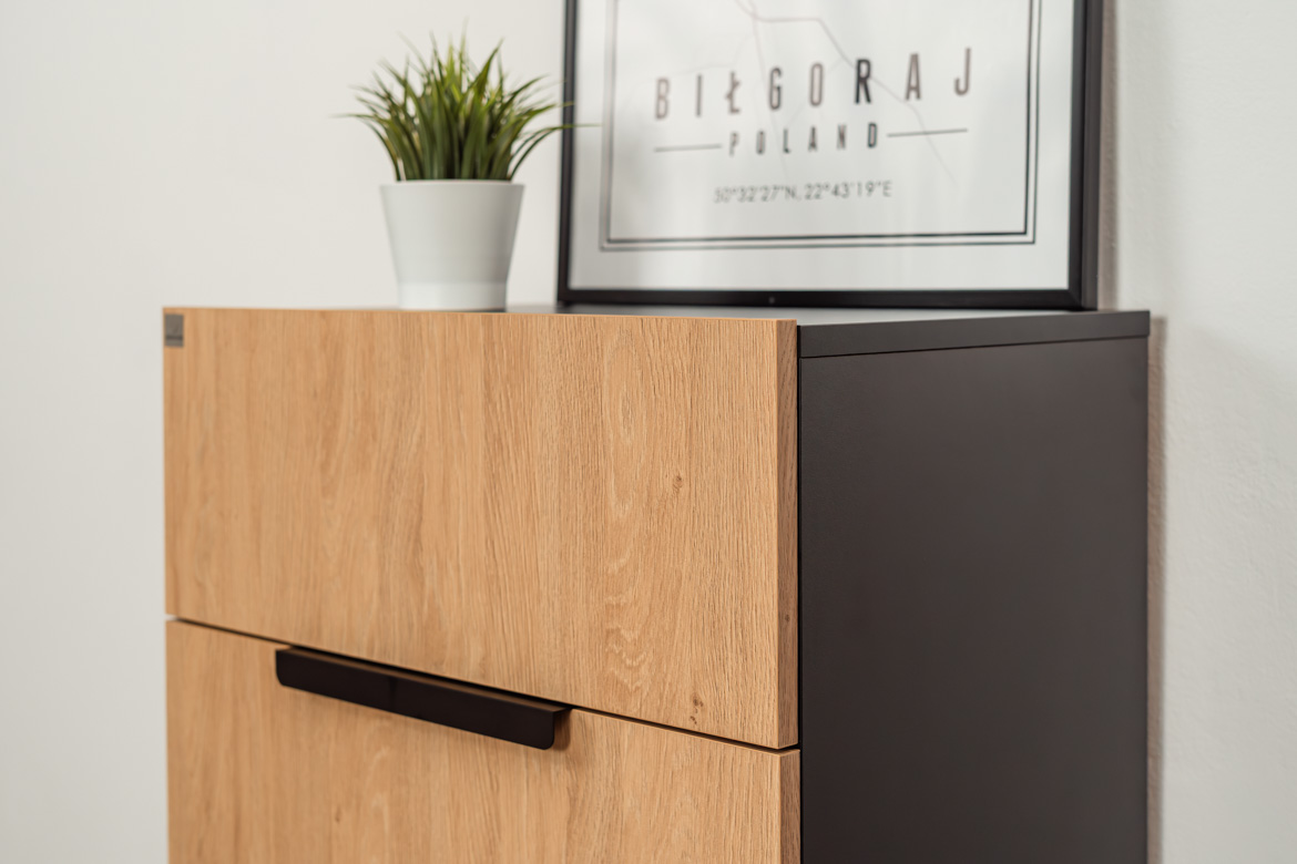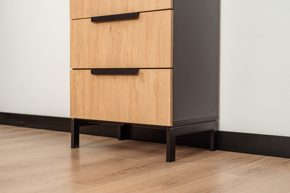 This slim chest of drawers with 4 capacious drawers is an ideal solution for those who need functional and aesthetic storage in a limited space. Stable construction, modern combination of oak-colored fronts with black elements and high metal legs give the furniture a light and modern character. The chest of drawers provides convenient organization of documents, accessories and small items, and at the same time fits perfectly into modern, industrial and minimalist interior designs. Thanks to its compact form, it easily fits into smaller rooms, without losing capacity and functionality.