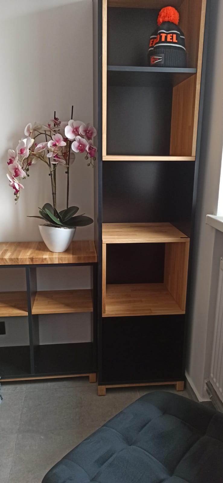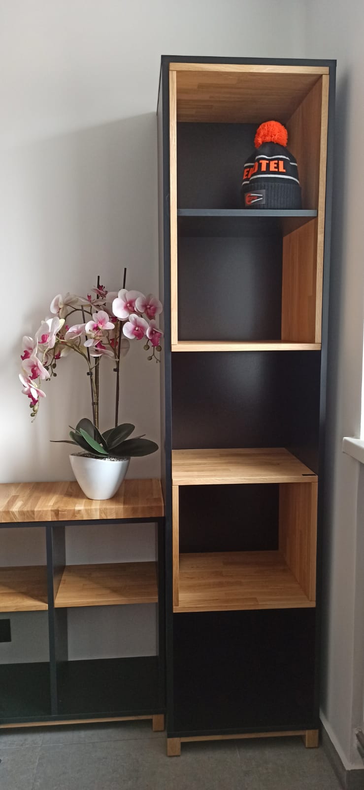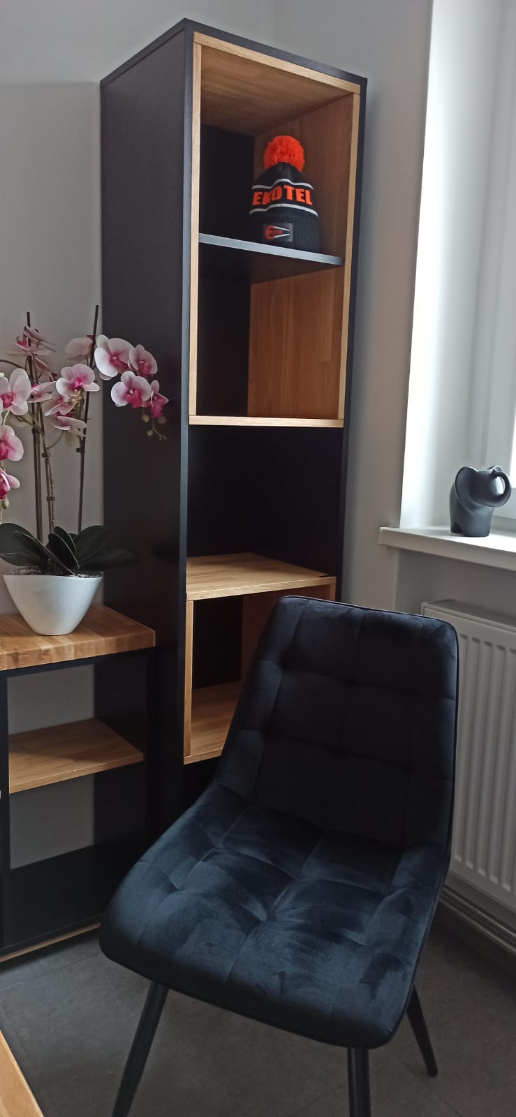 The column shelf is sleek, sturdy, and very practical. It takes up little space, helps organize the area effectively, and has a modern look.