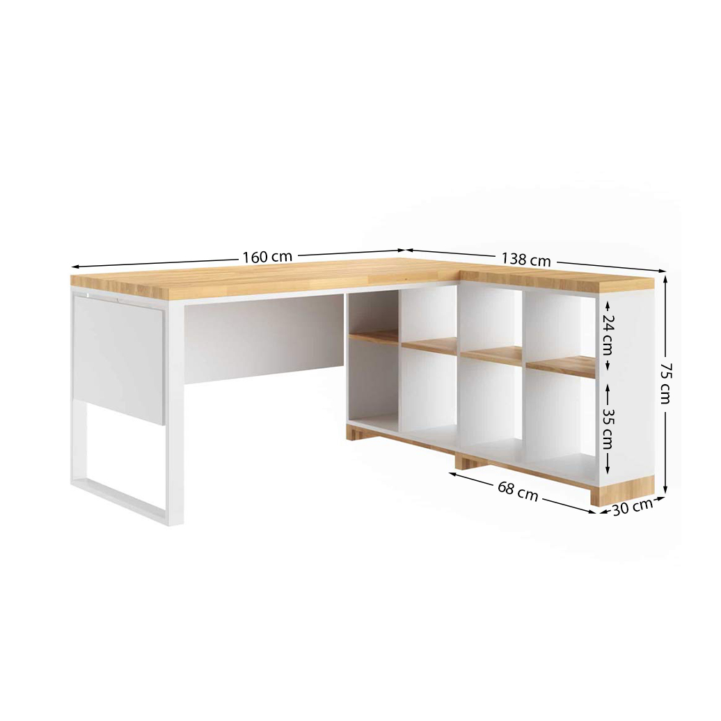 Functional wooden top desk together with an extension Accommodates a large number of documents. It is on it that you will put your laptop, organizer, books. One side of the desk has shelves on which you will arrange an additional number of folders for documents, printer paper. This way you have everything you need at hand. The magnificently furnished shelves that are included will add a unique touch. Solid wood and metal desks provide a guarantee of solidity and stability. The Scandinavian-style desk gives the room a delicate and unusual style.