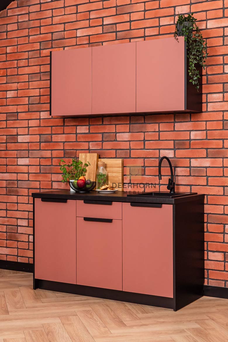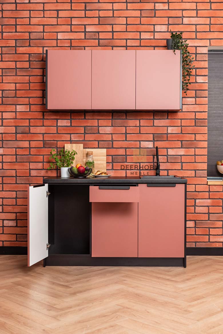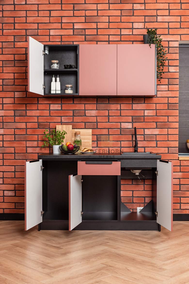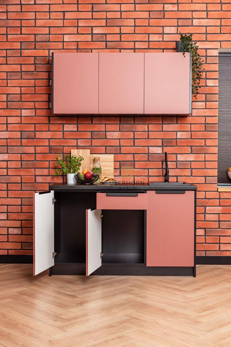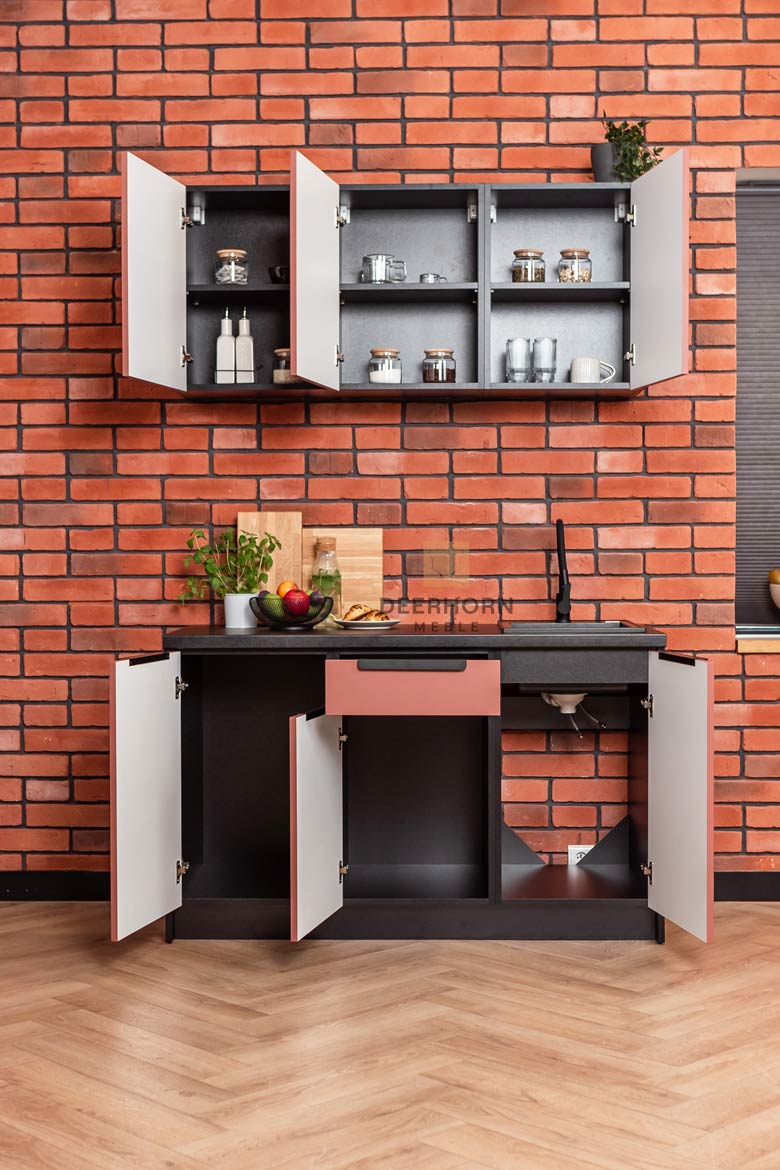 This model was designed for modern offices, relaxation areas and social spaces. The combination of matte black with fronts in a muted brick shade creates an elegant, calm backdrop for daily chores. The upper and lower cabinets will accommodate all the necessary accessories, while the work surface will easily accommodate a coffee maker, kettle or other necessary appliances, while leaving space for the free preparation of drinks and snacks. The whole is complemented by soft LED lighting, which emphasizes the modern character of the furniture and provides convenience on a daily basis.