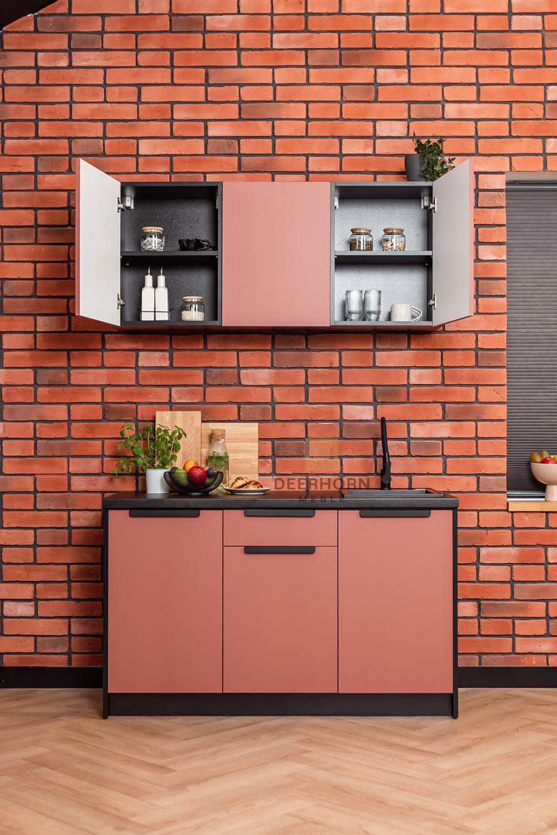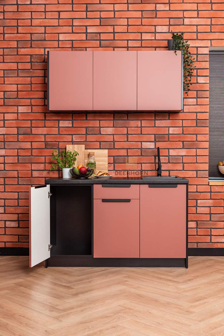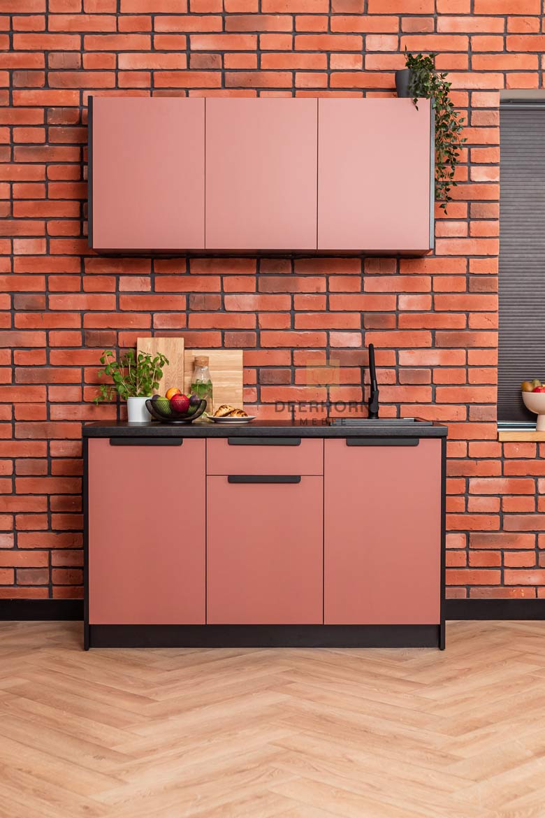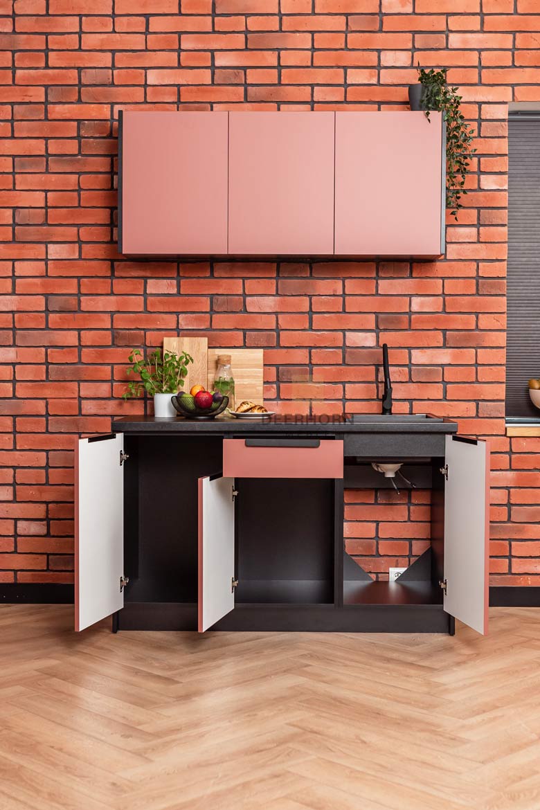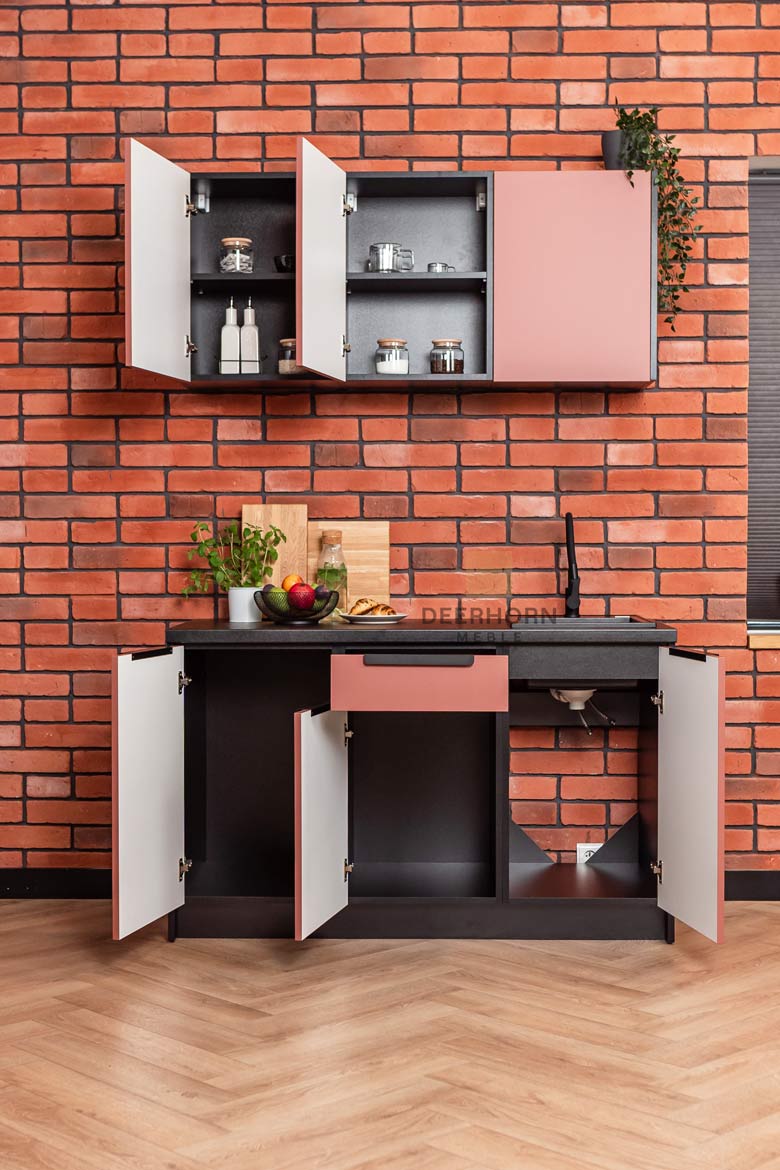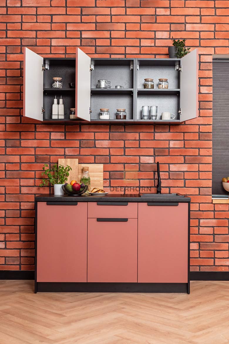 This model was designed for modern offices, relaxation areas and social spaces. The combination of matte black with fronts in a muted brick shade creates an elegant, calm backdrop for daily chores. The upper and lower cabinets will accommodate all the necessary accessories, while the work surface will easily accommodate a coffee maker, kettle or other necessary appliances, while leaving space for the free preparation of drinks and snacks. The whole is complemented by soft LED lighting, which emphasizes the modern character of the furniture and provides convenience on a daily basis.